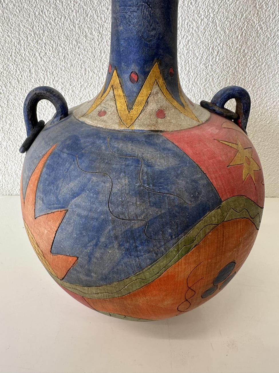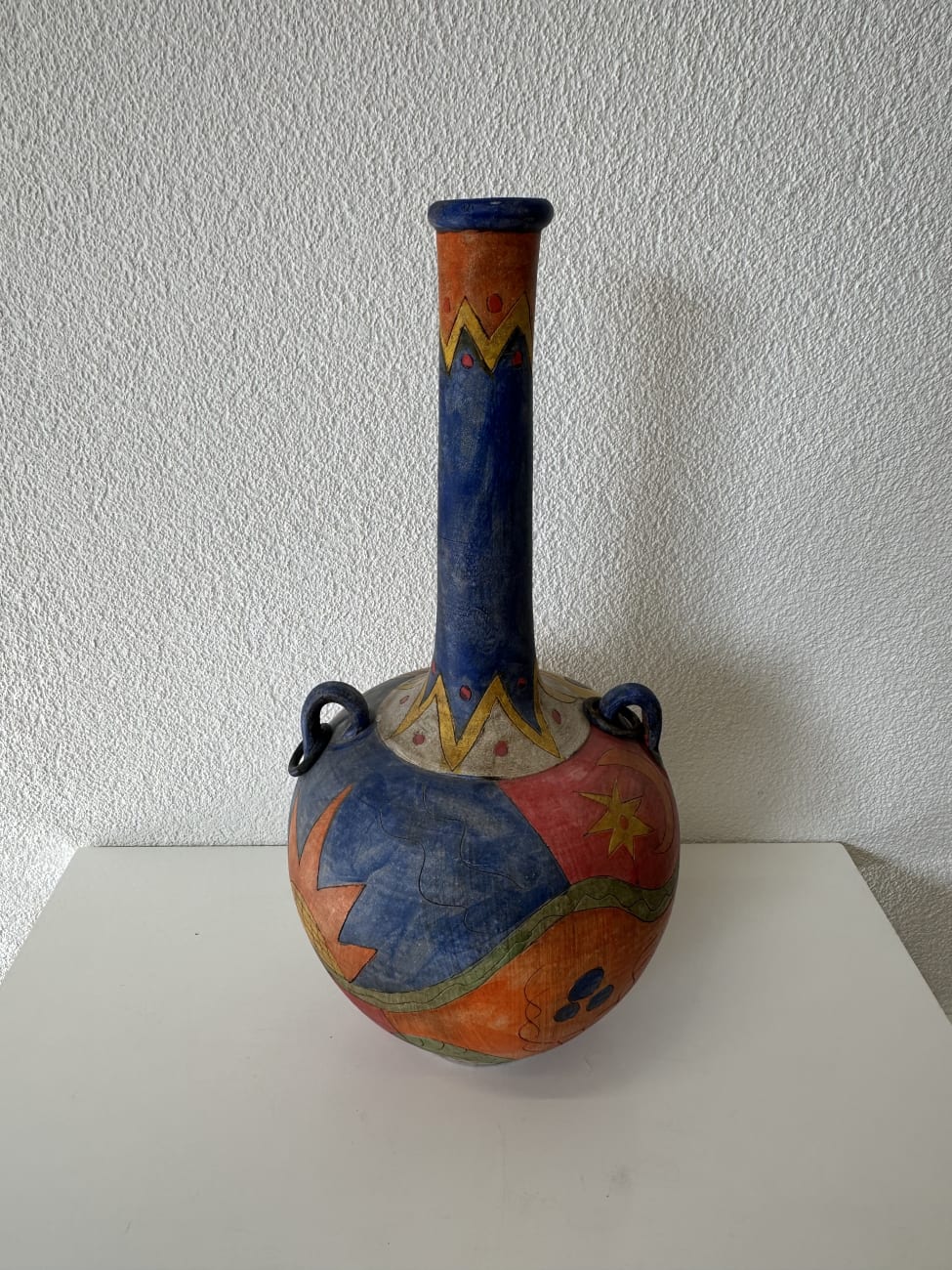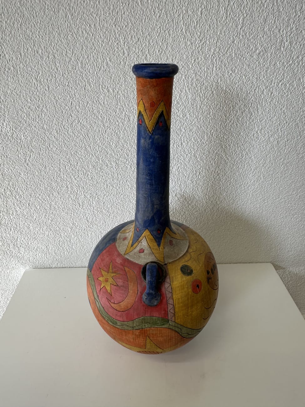 Kräftige Farben, freie Linien und dekorative Symbole prägen diese Vintage Keramikvase im Ethno Stil aus den ca. 1990er Jahren. Der runde Korpus wird von einem langen schmalen Hals getragen und ist rundum mit handgemalten Motiven gestaltet. Sterne, geometrische Formen, Wellenlinien und abstrakte Figuren verteilen sich über die Oberfläche in Blau, Rot, Gelb und Orange. Zwei kleine seitliche Henkel ergänzen die Form und geben der Vase eine an antike Gefässe erinnernde Silhouette.