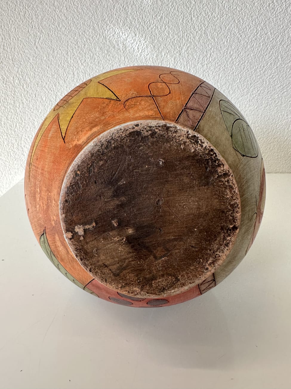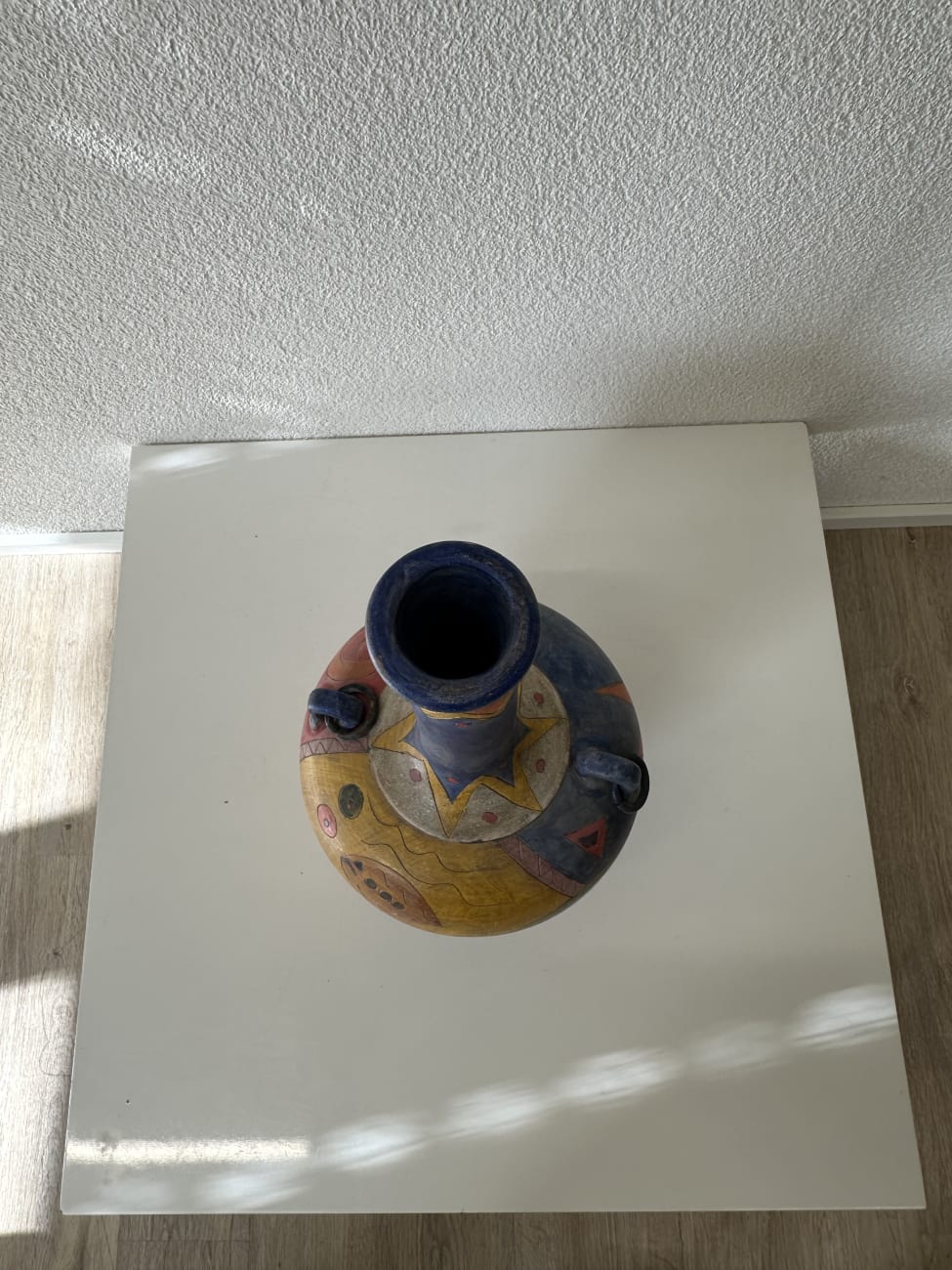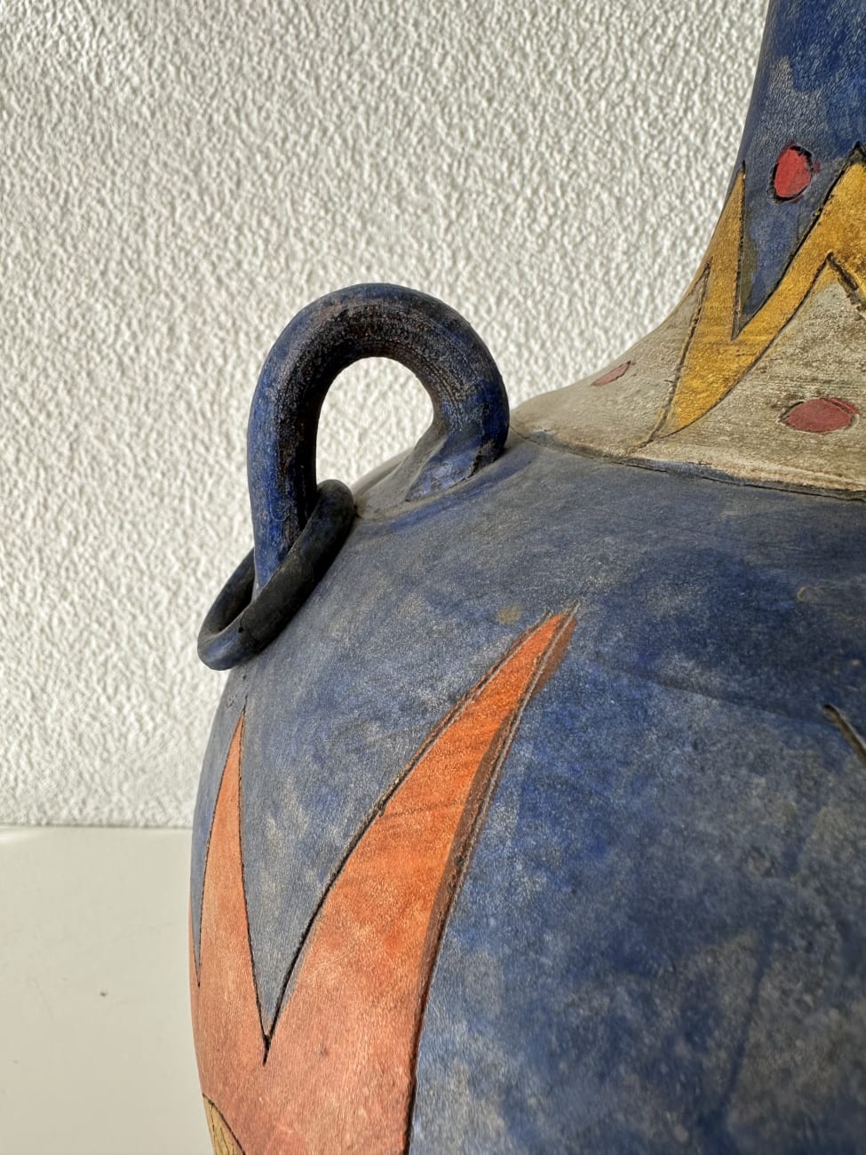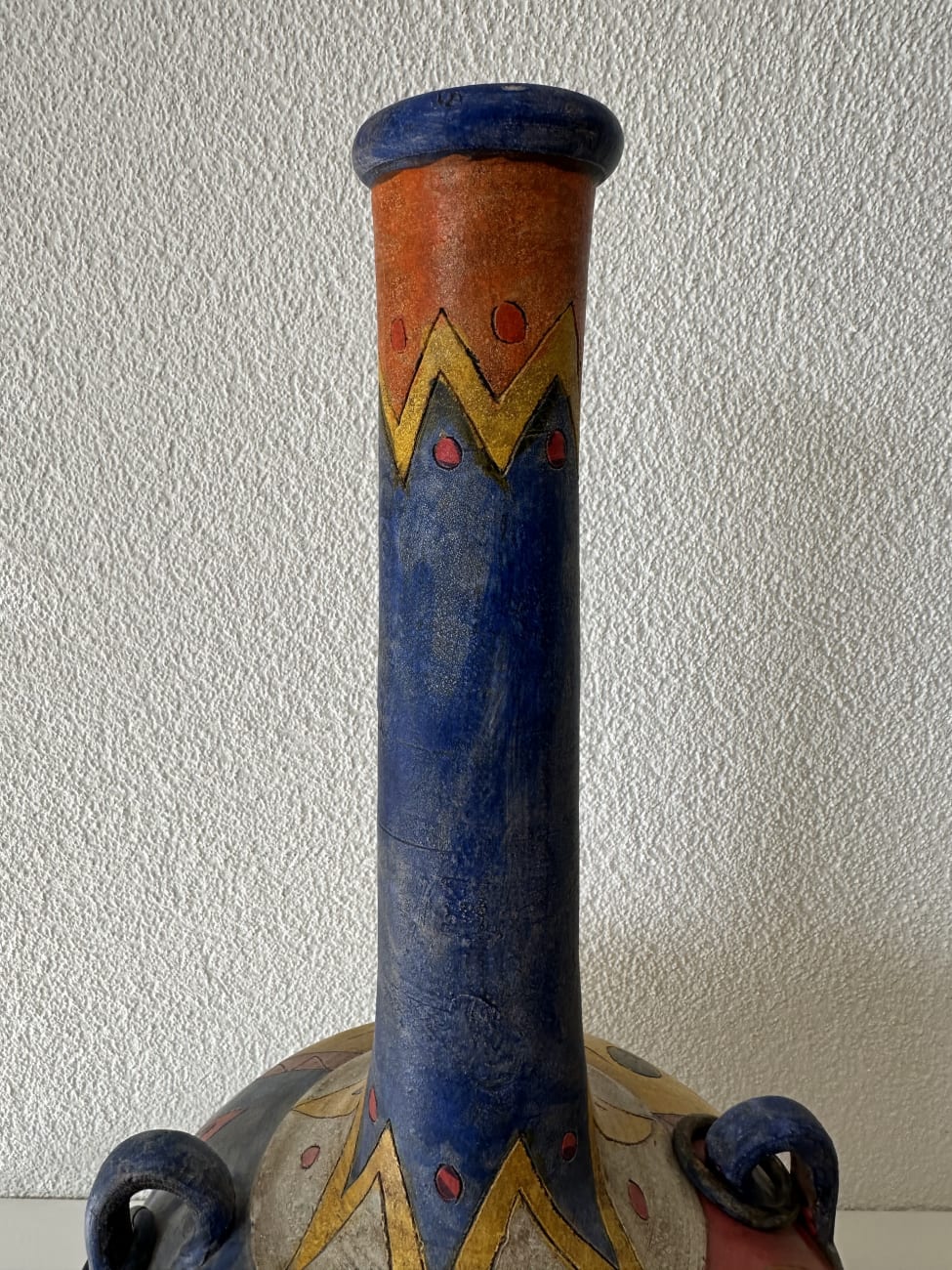 Kräftige Farben, freie Linien und dekorative Symbole prägen diese Vintage Keramikvase im Ethno Stil aus den ca. 1990er Jahren. Der runde Korpus wird von einem langen schmalen Hals getragen und ist rundum mit handgemalten Motiven gestaltet. Sterne, geometrische Formen, Wellenlinien und abstrakte Figuren verteilen sich über die Oberfläche in Blau, Rot, Gelb und Orange. Zwei kleine seitliche Henkel ergänzen die Form und geben der Vase eine an antike Gefässe erinnernde Silhouette.