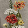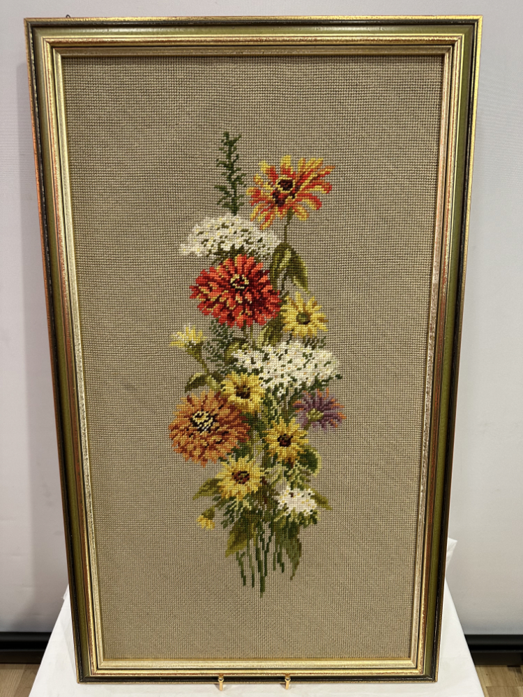 Dieses liebevoll gearbeitete Stickbild aus den 1970er Jahren zeigt ein farbenfrohes Blumenarrangement in klassischer Kreuzstichtechnik. Auf einem fein gewebten Leinenstoff sind verschiedene Sommerblumen in Rot-, Gelb-, Weiss- und Grüntönen dargestellt, detailreich gestickt und harmonisch komponiert.
