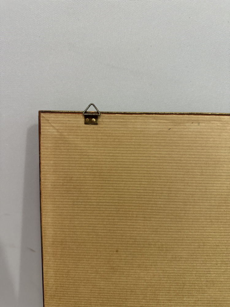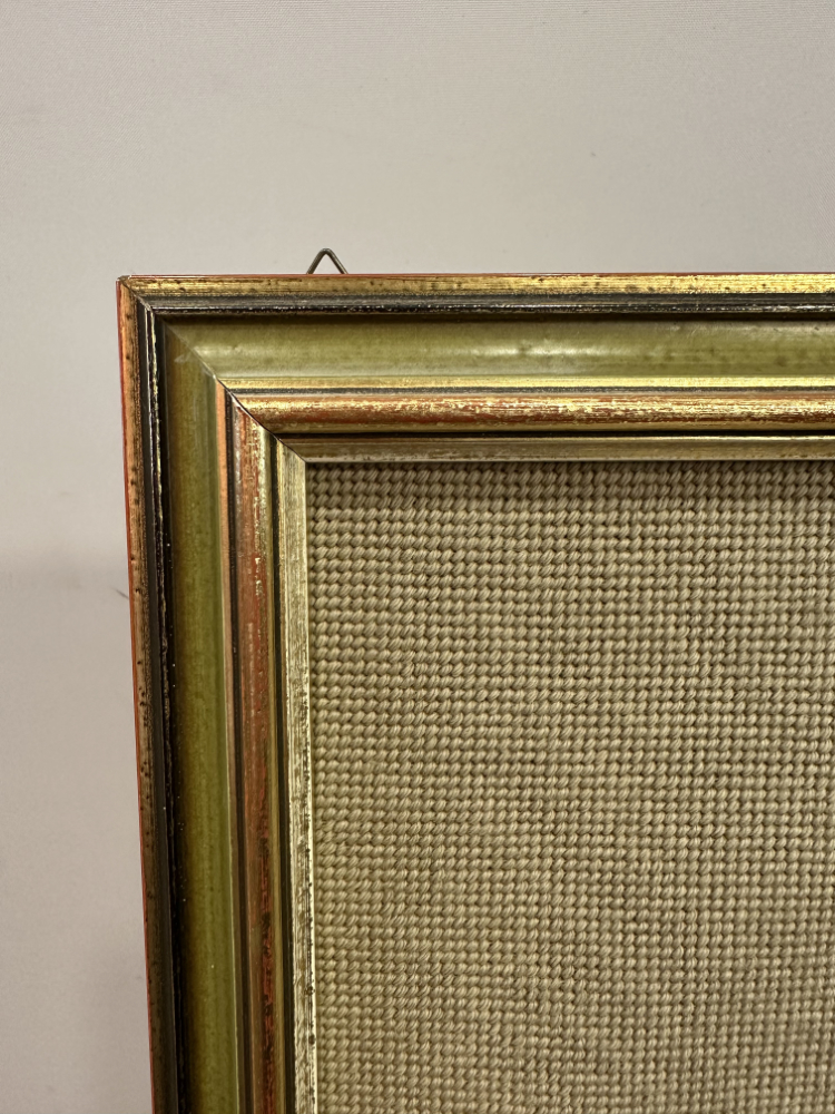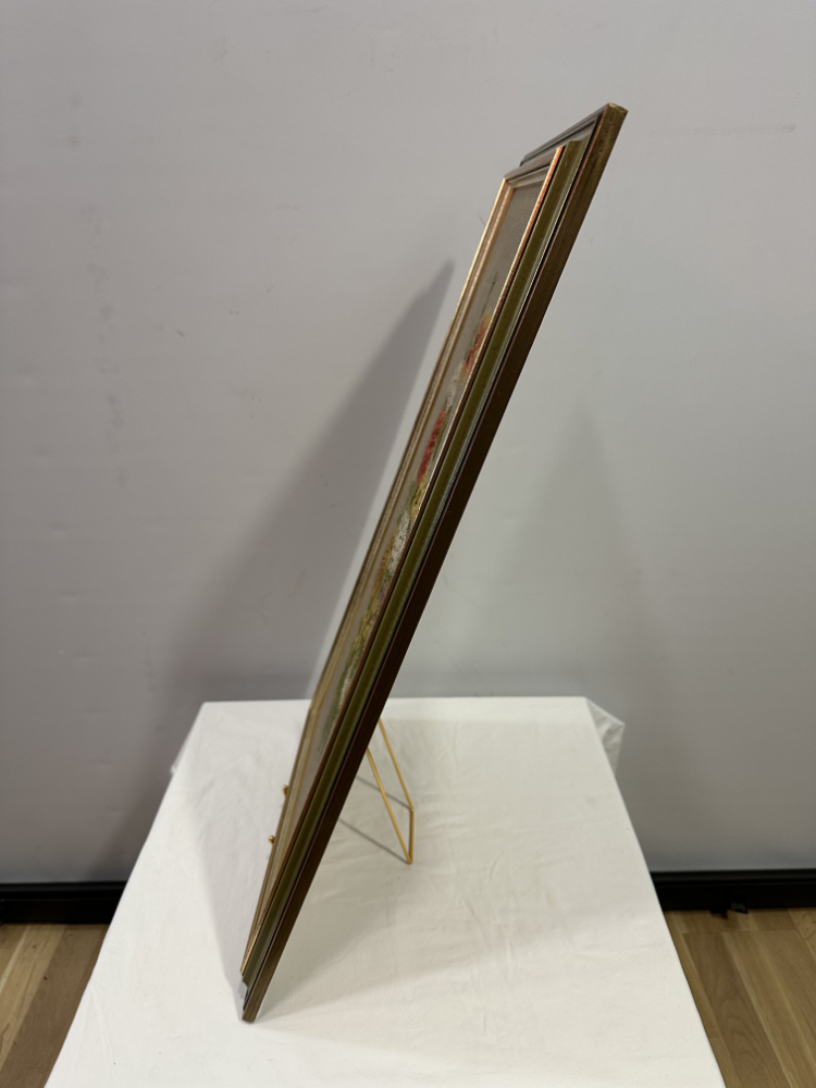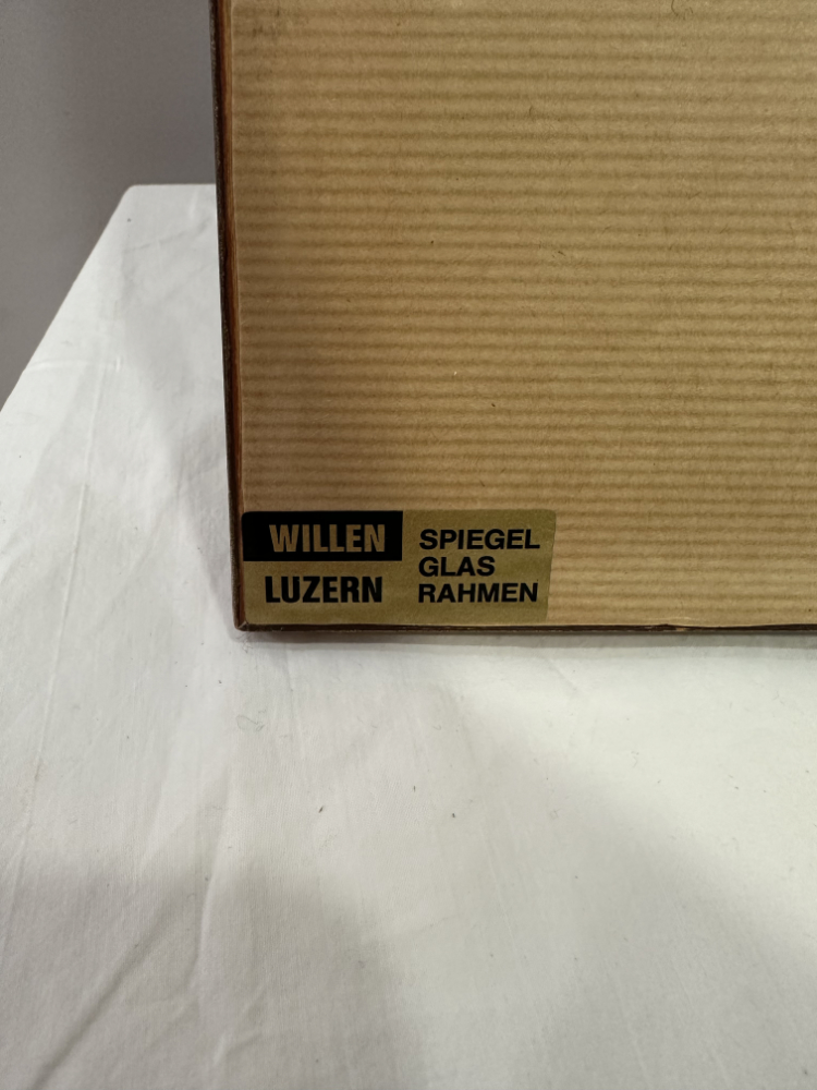 Die Handarbeit ist in einem goldfarbenen Holzrahmen mit zarter Patina gefasst, gefertigt von Willen Luzern, einem bekannten Schweizer Fachgeschäft für Spiegel, Glas und Rahmen. Der Rahmen unterstreicht den nostalgischen Charakter des Werks und ist auf der Rückseite mit einer stabilen Kartonabdeckung versehen.