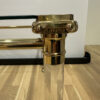 Dieser elegante Vintage Couchtisch im Stil des Hollywood Regency stammt aus den 1970er Jahren und verkörpert den luxuriösen Wohnstil dieser Epoche. Die Kombination aus transparenter Glasplatte, klaren Plexiglassäulen und vergoldeten Messingelementen sorgt für ein harmonisches Zusammenspiel von Leichtigkeit und Glanz. Das Design ist zeitlos, modern und doch klassisch, und wirkt sowohl in Retro Interieurs als auch in zeitgenössischen Wohnräumen edel und repräsentativ.