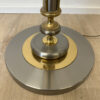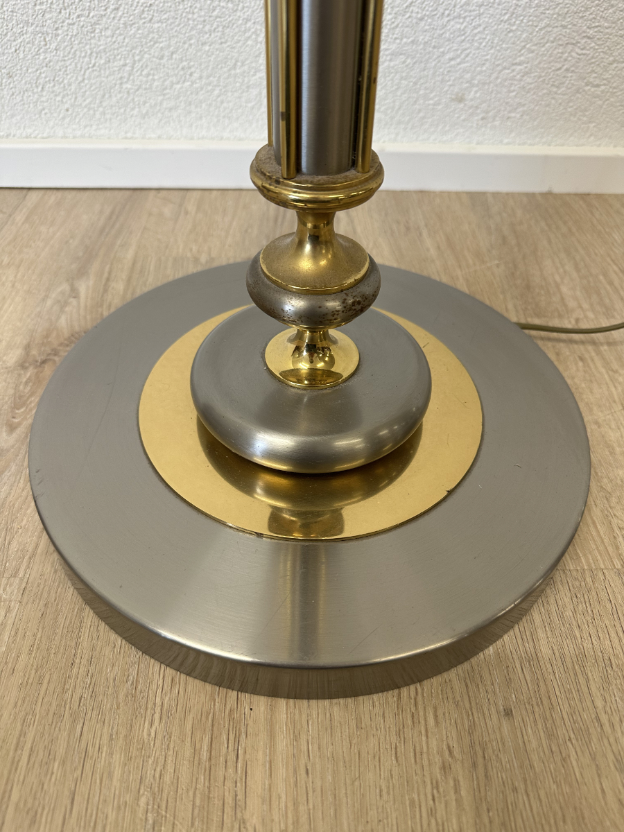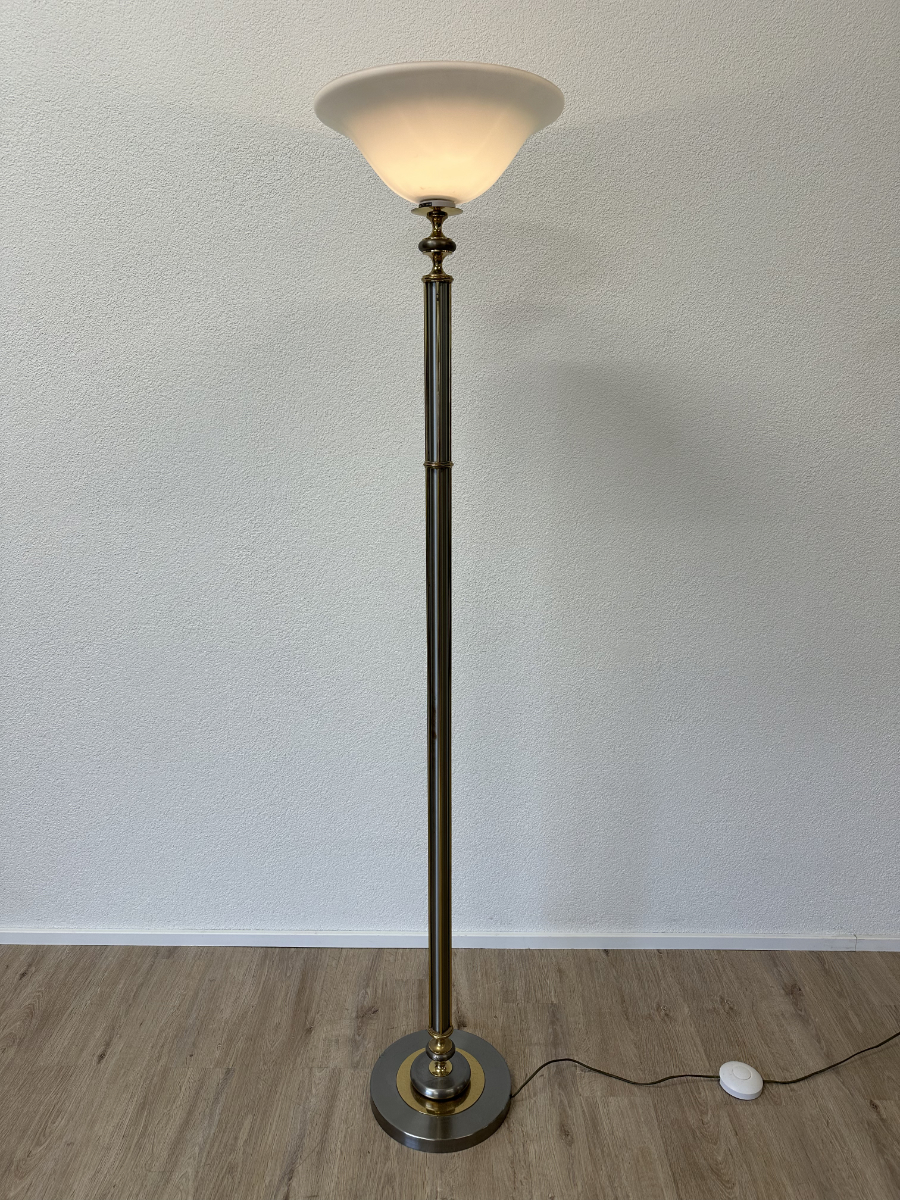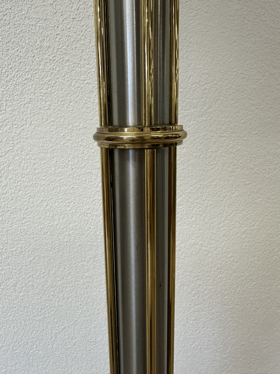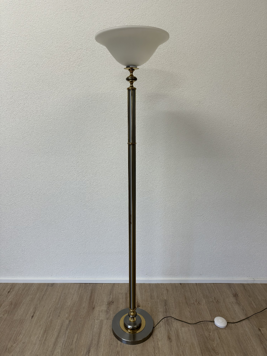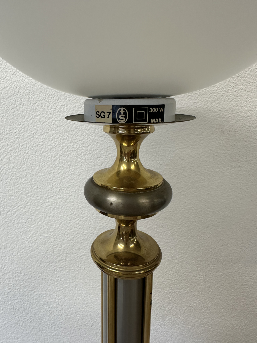 Metall trifft Opalglas in einer typischen Formensprache der 1970er Jahre. Diese Stehleuchte ist als klassischer Deckenfluter ausgeführt und sorgt mit ihrem nach oben geöffneten Opalglasschirm für angenehmes, indirektes Raumlicht. Der schlanke Leuchtenkörper kombiniert silberfarbene Metalloberflächen mit goldfarbenen Akzenten und steht auf einem schweren Rundfuss für sicheren Halt. Am Sockel befindet sich das originale Herstelleretikett JJS mit zeittypischer handschriftlicher Endkontrollsignatur. Stilistisch klar dem Hollywood Regency zuzuordnen, wie er in Europa und den USA in den 1960er und 1970er Jahren verbreitet war. Die Zuordnung zu Le Dauphin gilt als wahrscheinlich, ist jedoch nicht eindeutig belegt.