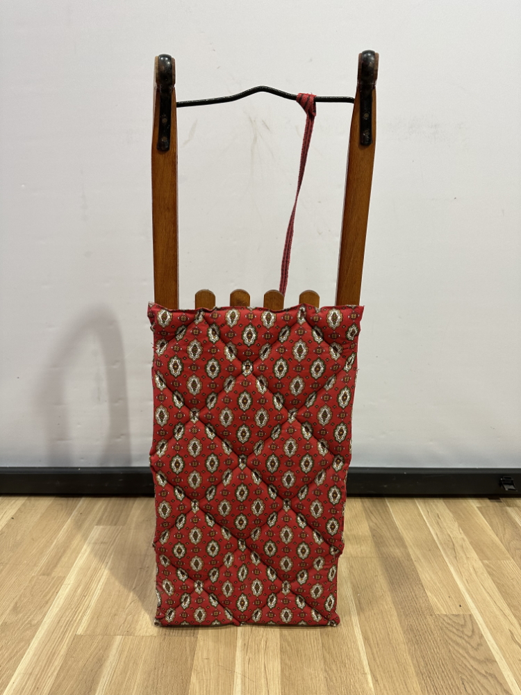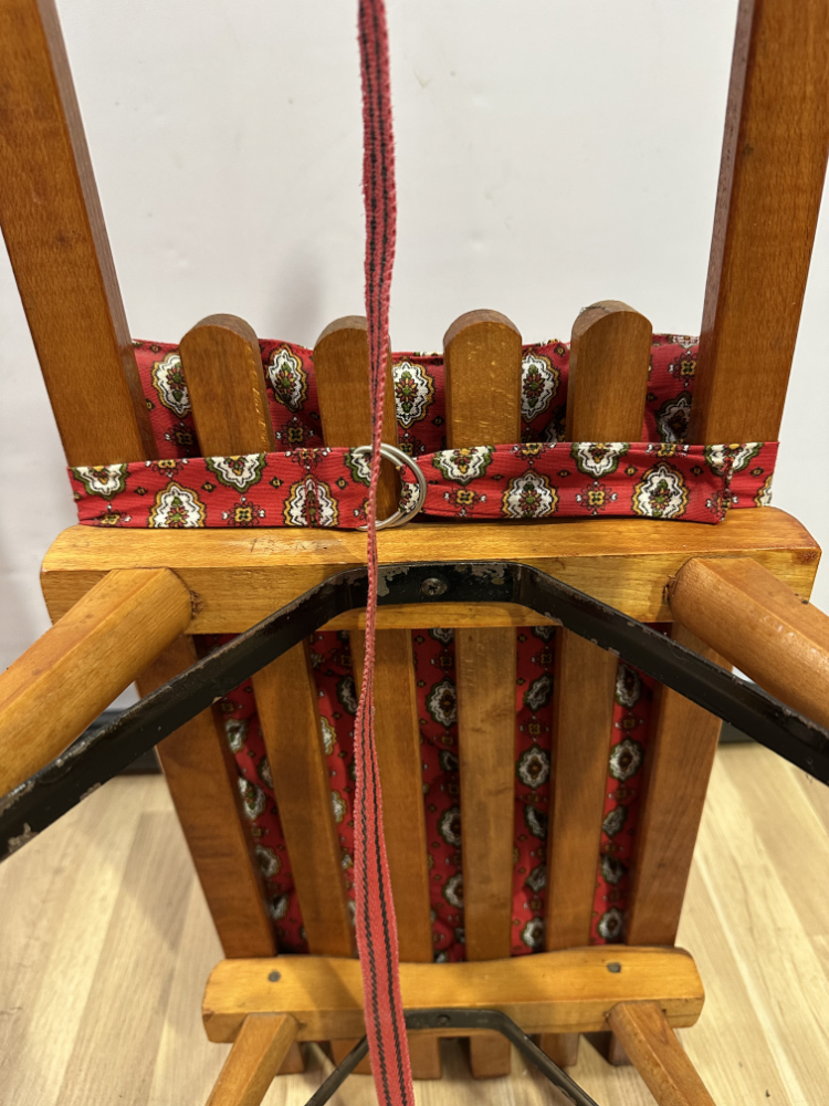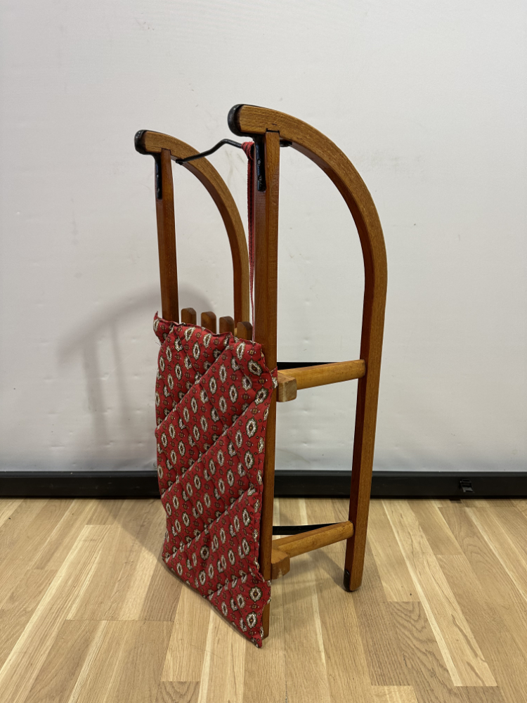 Dieser klassische Holzschlitten stammt aus den 1960er Jahren und überzeugt mit seinem authentischen Vintage Charme. Der stabile Rahmen aus massivem Holz mit gebogenen Kufen und Metalllaufschienen wurde sorgfältig gefertigt und sorgt für eine langlebige, funktionale Konstruktion. Besonders charakteristisch ist die gesteppte Sitzauflage im rot gemusterten Stoffdesign, ein typisches Merkmal der 60er Jahre Wintersportkultur.