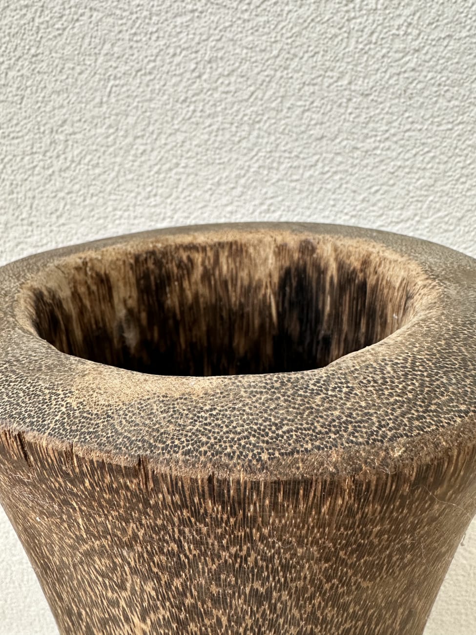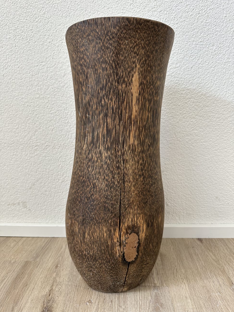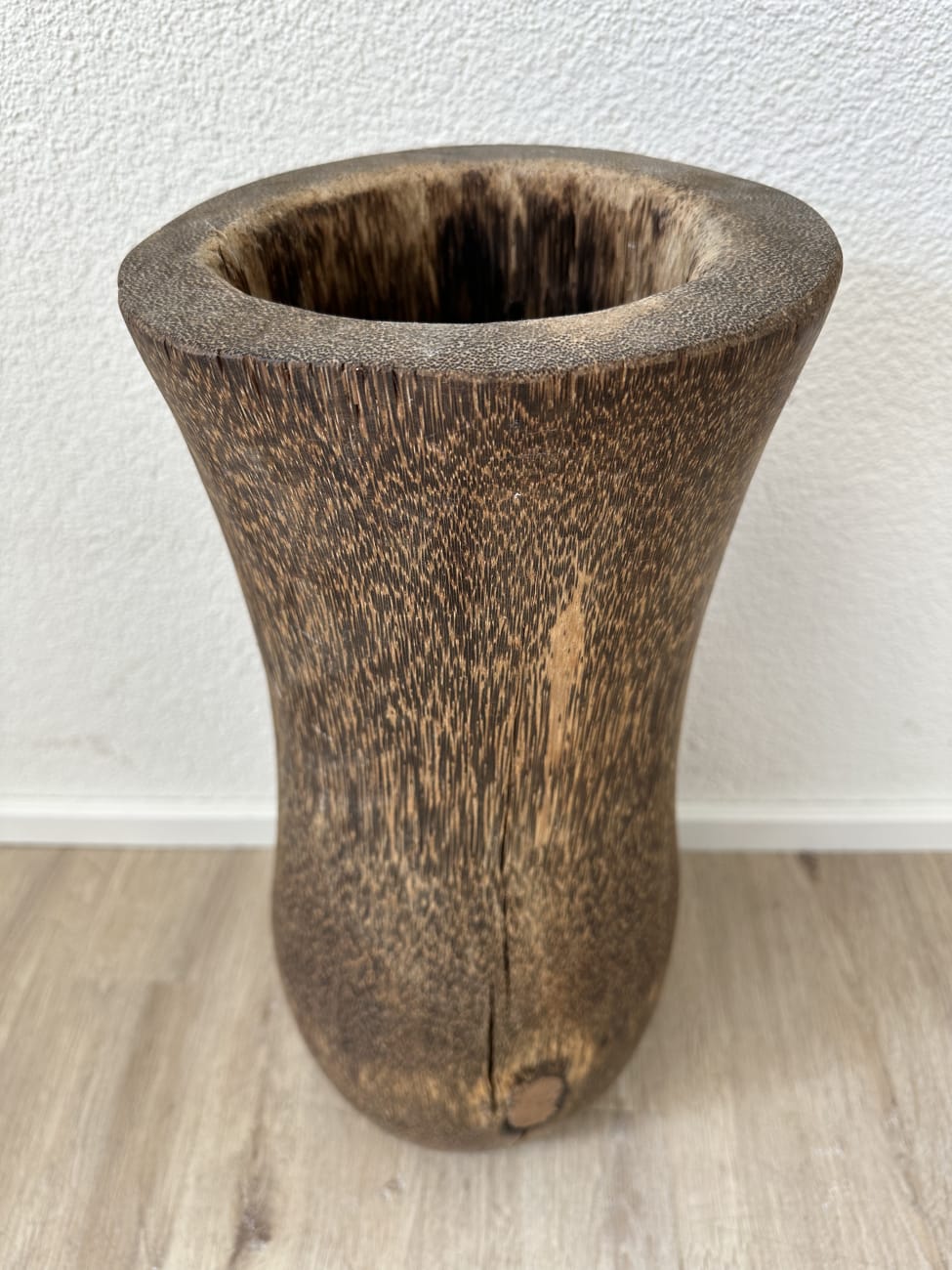 Massives Holz mit auffälliger, dunkler Maserung prägt das Erscheinungsbild dieser handgefertigten Vase. Die Form wirkt organisch und leicht tailliert, oben weit geöffnet und nach unten hin geschlossen gearbeitet. Deutlich sichtbar sind die natürlichen Wachstumsstrukturen des Holzes, besonders im Inneren mit spannender dunkler Zeichnung. Der Stil erinnert an rustikale Handwerkskunst der 1970er Jahre mit Fokus auf naturbelassene Materialien. Die Vase wurde aus einem Stück gefertigt und bringt dadurch eine starke, ursprüngliche Ausstrahlung in jeden Raum.
