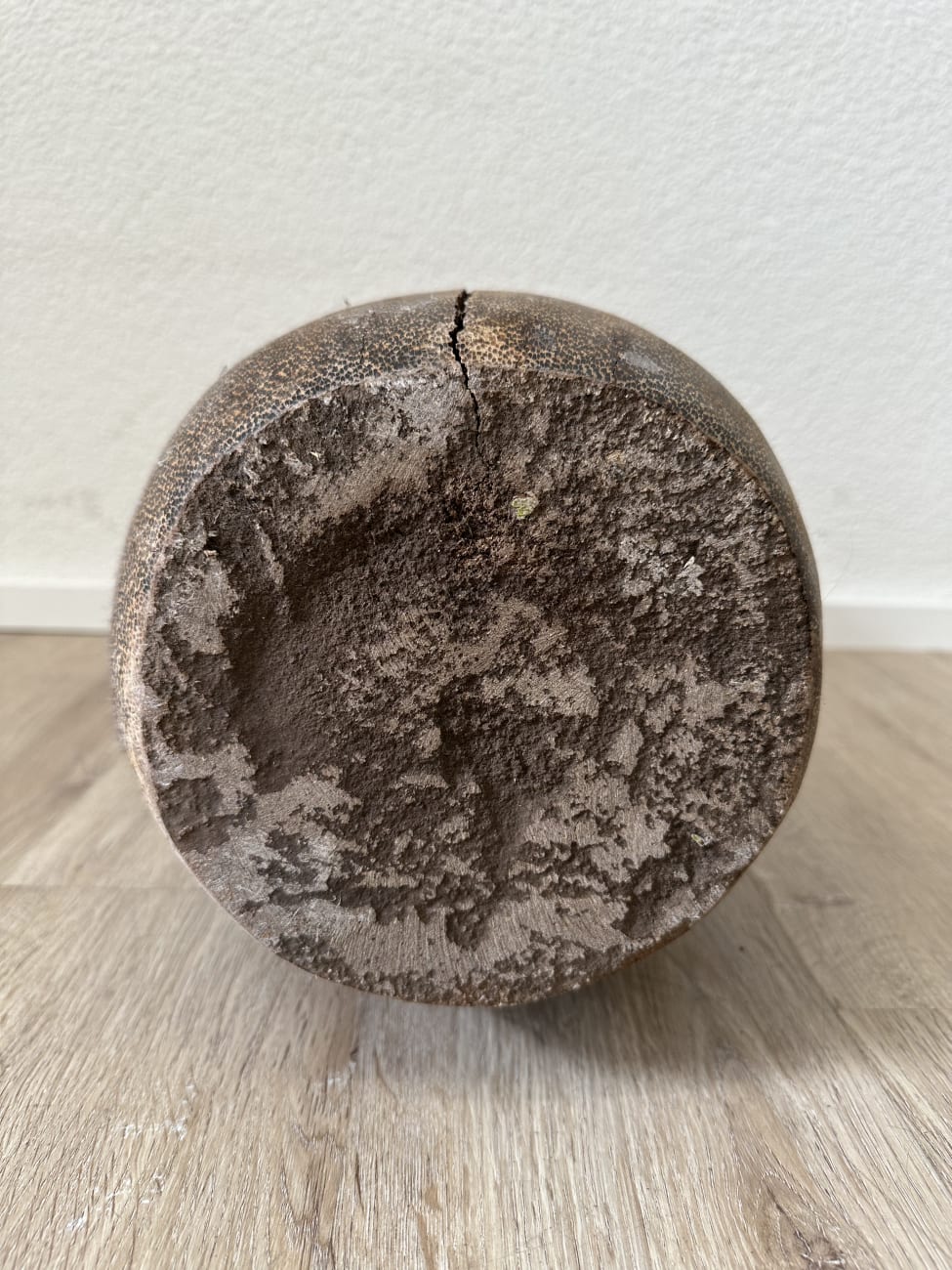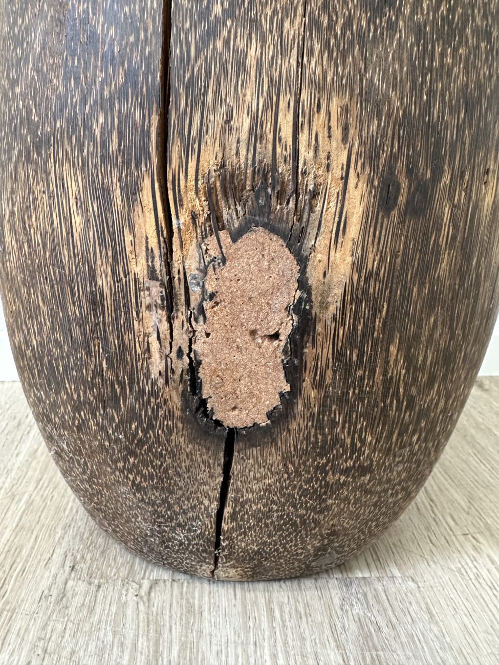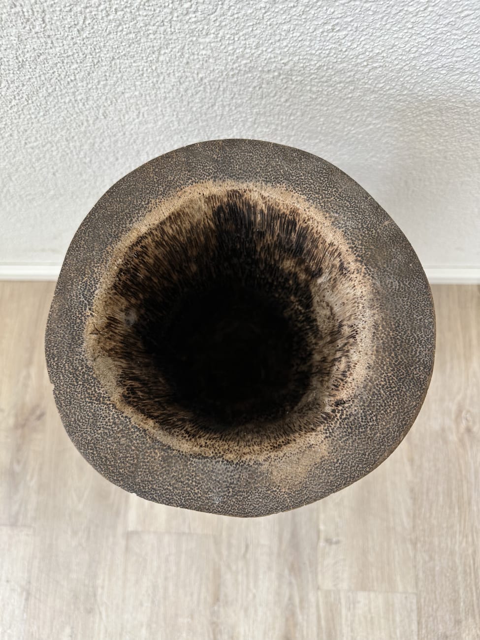 Massives Holz mit auffälliger, dunkler Maserung prägt das Erscheinungsbild dieser handgefertigten Vase. Die Form wirkt organisch und leicht tailliert, oben weit geöffnet und nach unten hin geschlossen gearbeitet. Deutlich sichtbar sind die natürlichen Wachstumsstrukturen des Holzes, besonders im Inneren mit spannender dunkler Zeichnung. Der Stil erinnert an rustikale Handwerkskunst der 1970er Jahre mit Fokus auf naturbelassene Materialien. Die Vase wurde aus einem Stück gefertigt und bringt dadurch eine starke, ursprüngliche Ausstrahlung in jeden Raum.