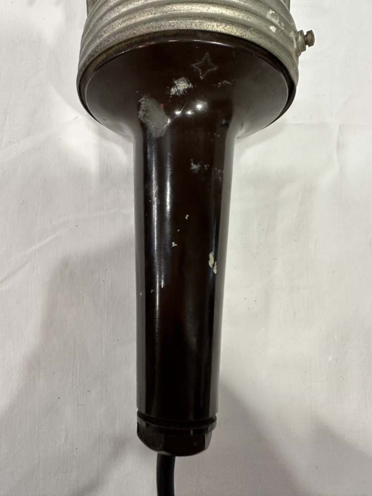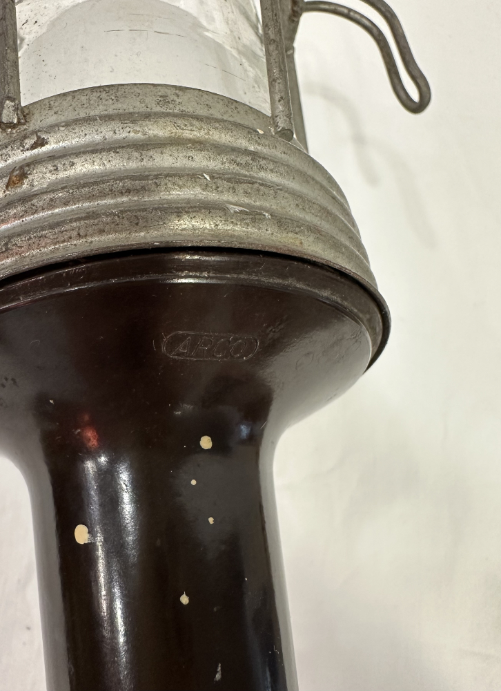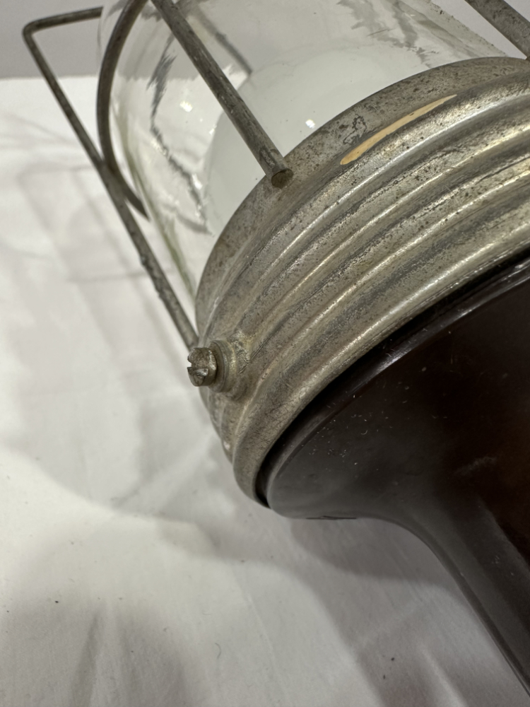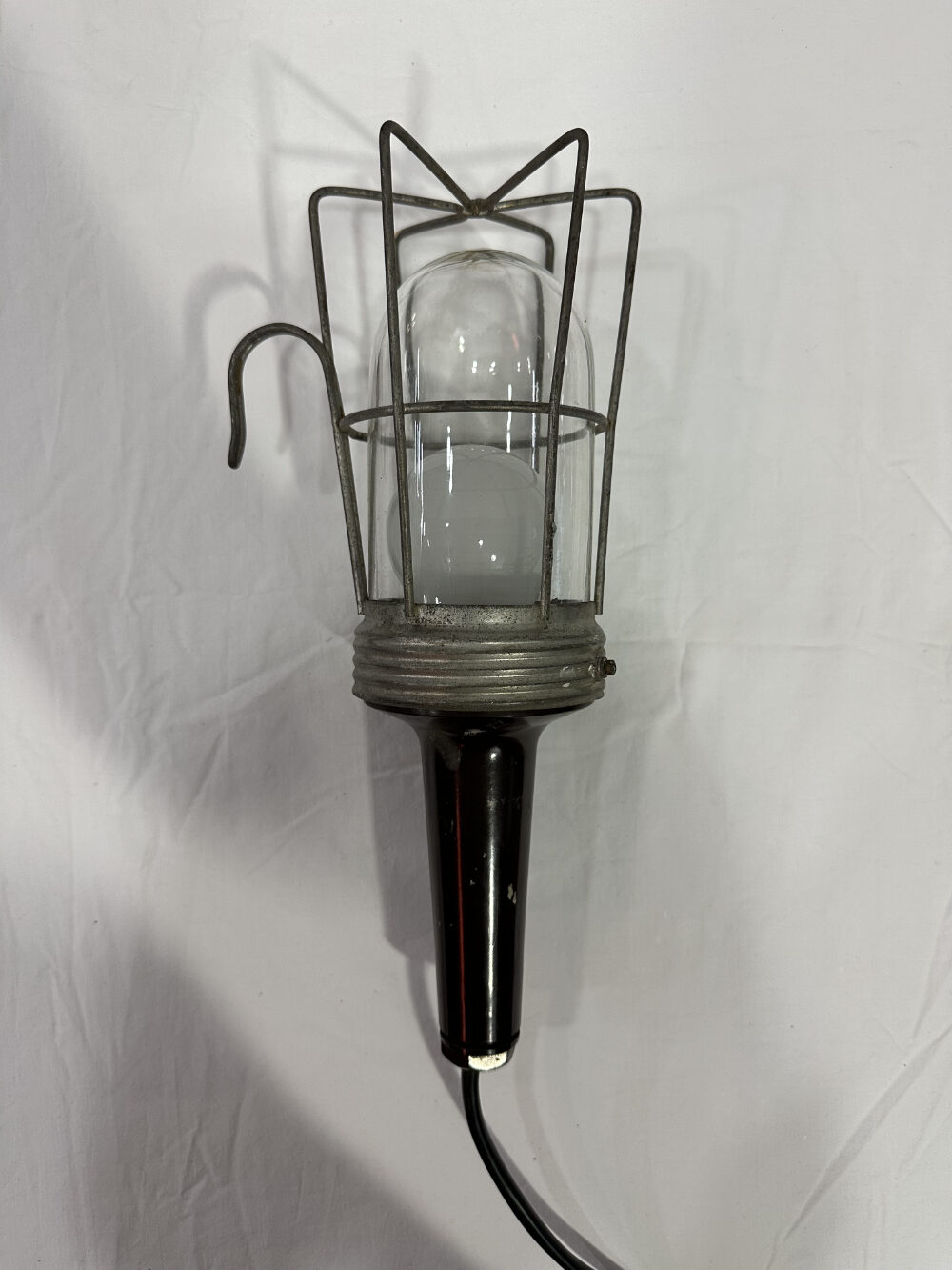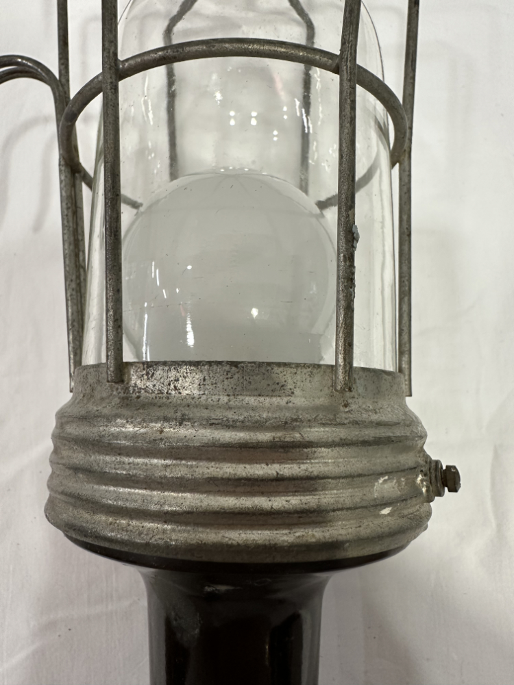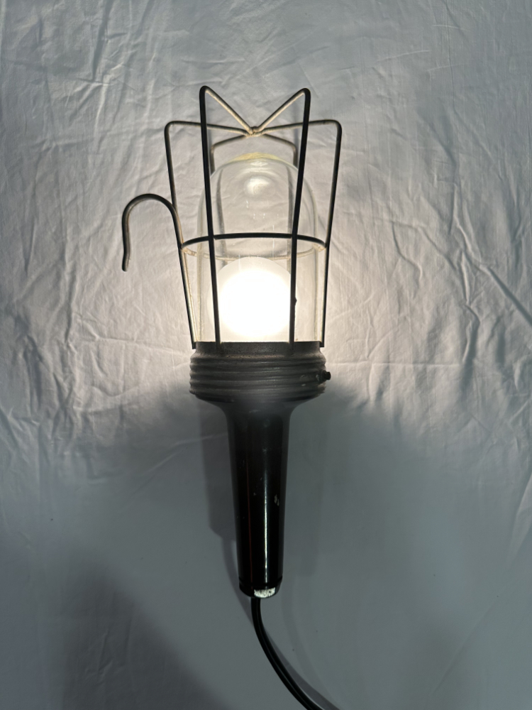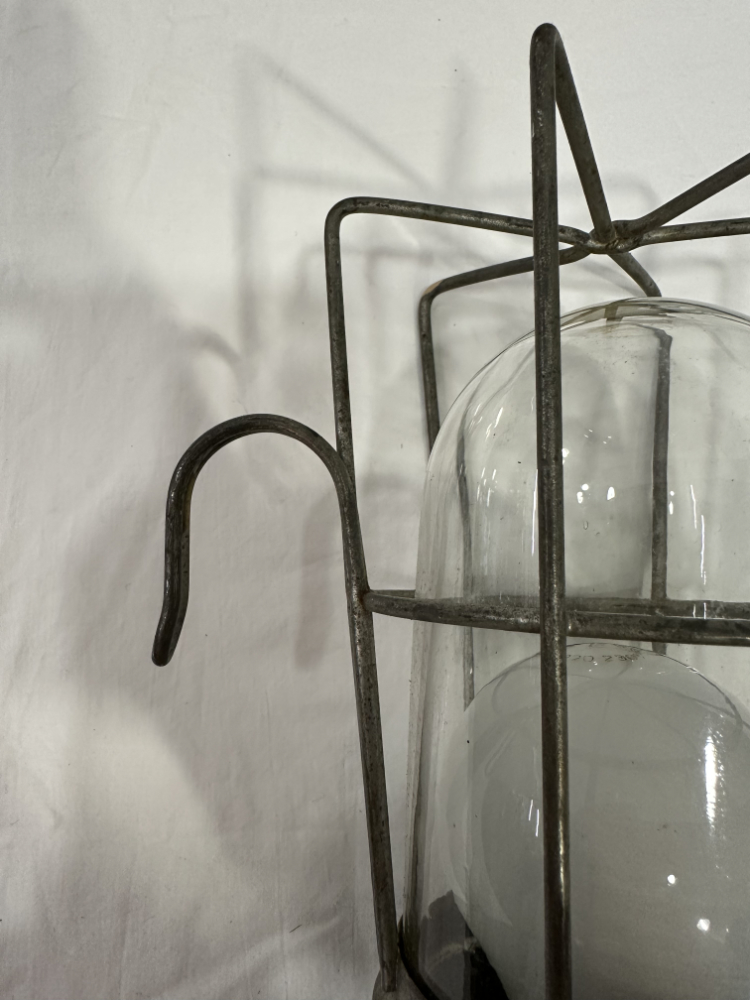 Das klare Glasgehäuse sorgt für gleichmässige Lichtverteilung, während der robuste Aufbau für Langlebigkeit steht. Ein typisches Beispiel klassischer Werkstattleuchten jener Zeit, gefertigt für harte Einsätze und heute geschätzt als markantes Vintage Dekostück.