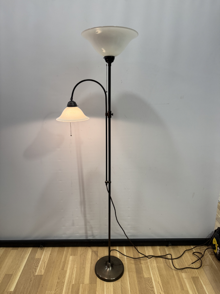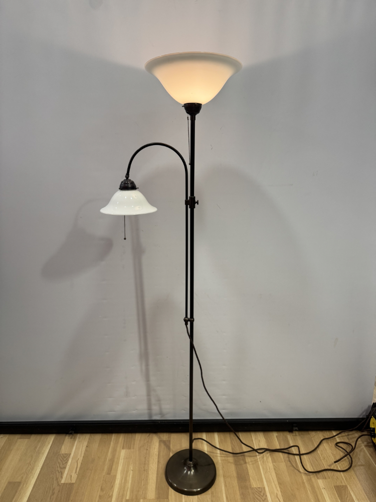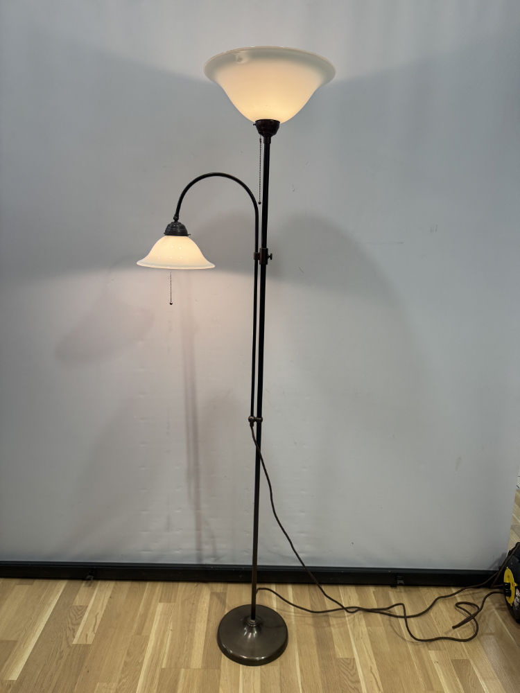 Diese stilvolle Vintage Stehleuchte im Jugendstil Design bringt nostalgisches Flair und funktionales Licht in jeden Raum. Das bronzefarbene Metallgestell trägt zwei weisse Glasschirme, einen grossen Fluter für indirektes Raumlicht und einen kleineren, höhenverstellbaren Lesearm mit geschwungenem Bogen. Beide Lichtquellen lassen sich separat über Zugketten bedienen.