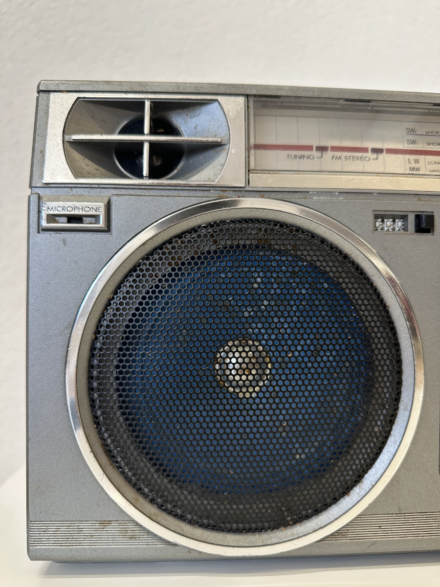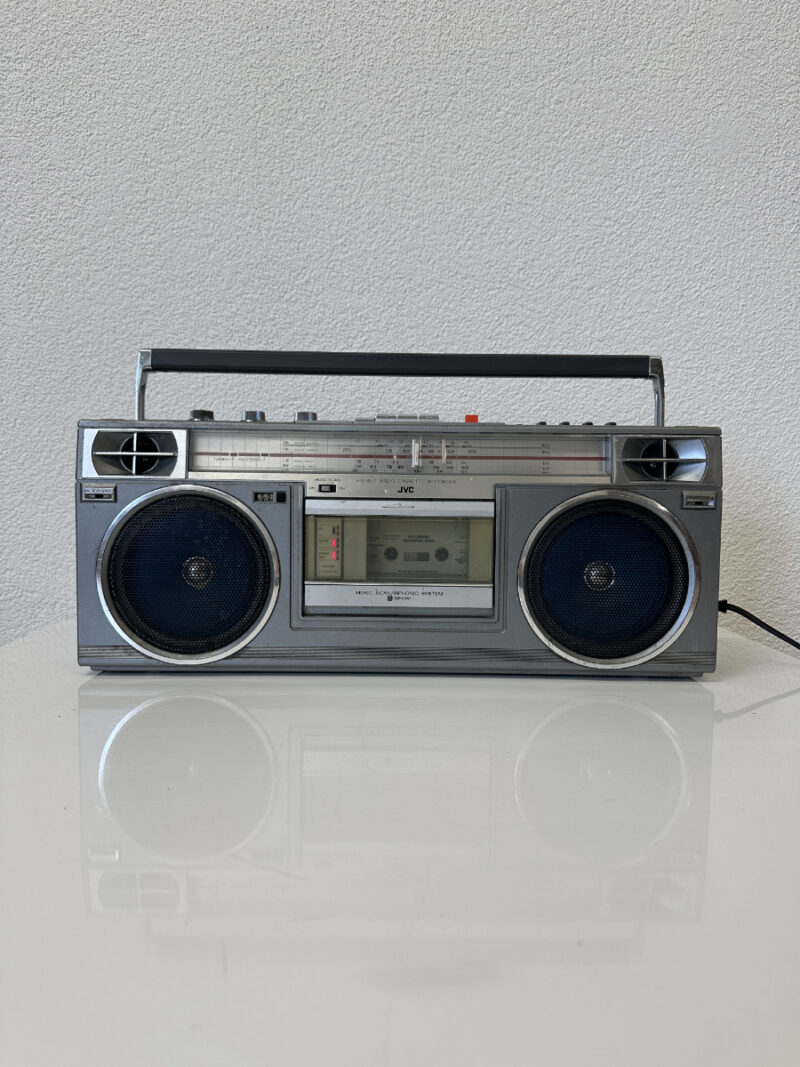 Silbernes Metallgehäuse, klare Linien und echte Technik aus Japan. Dieser JVC Stereo Radio Cassette Recorder stammt aus den 1970er Jahren und steht für eine Zeit, in der Radios noch Gewicht, Präsenz und Charakter hatten. Zwei grosse Frontlautsprecher sorgen für kräftigen Klang, ergänzt durch das integrierte Biphonic System für eine breitere Stereo-Wiedergabe. Die Kombination aus Radio und Kassettendeck macht das Gerät vielseitig nutzbar, ob zum Musikhören, Aufnehmen oder als markantes Vintage-Objekt im Raum.