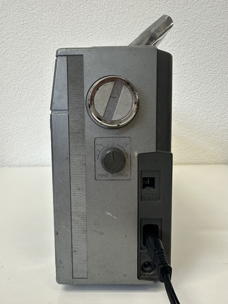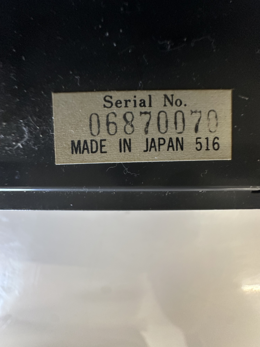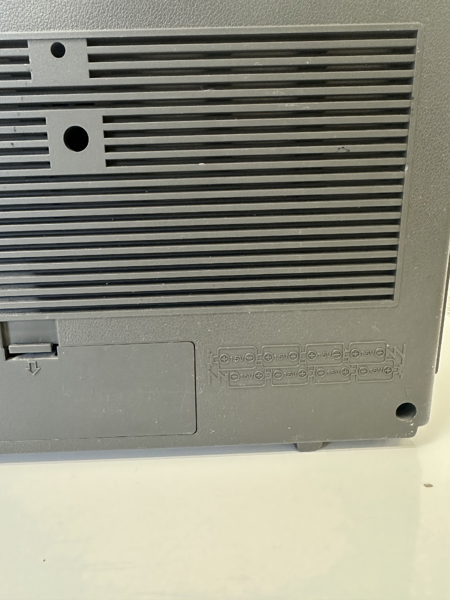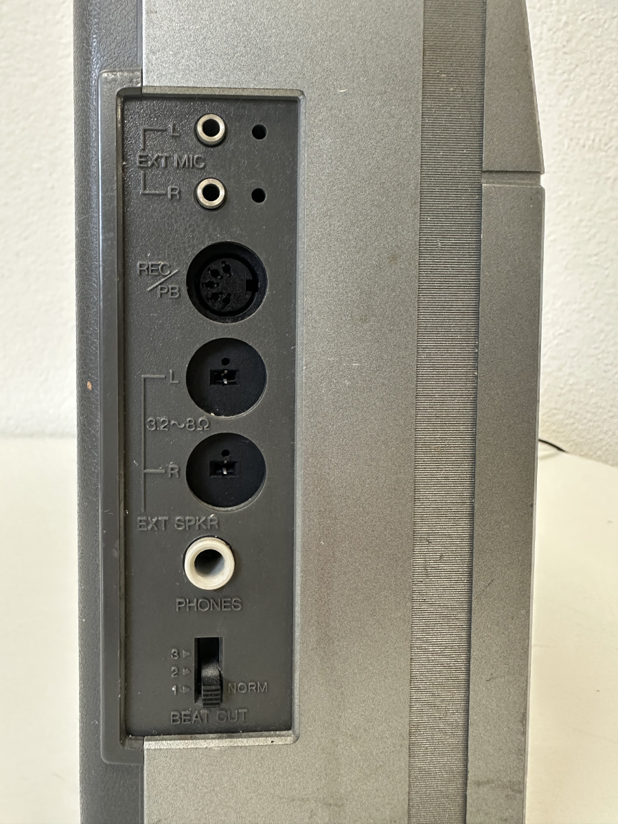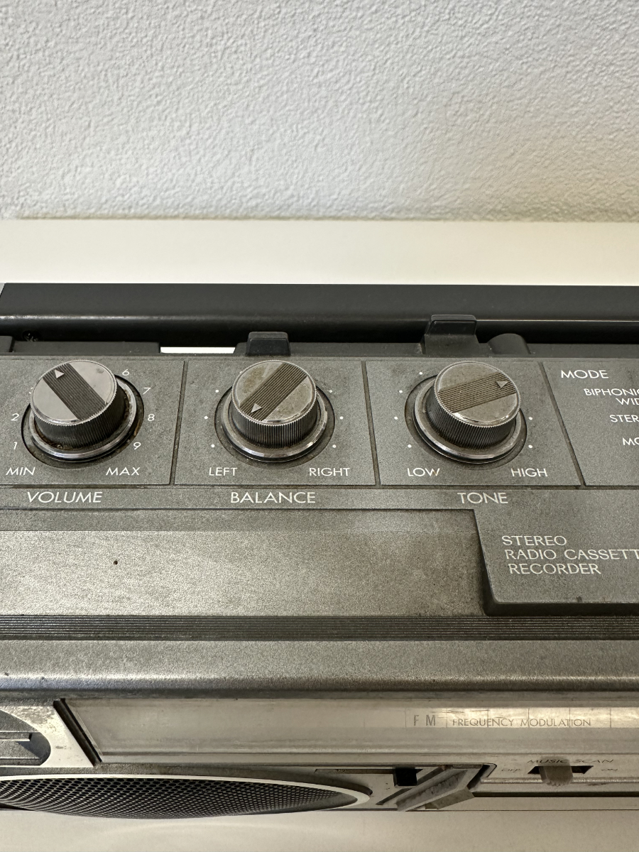 Die Skalenanzeige bietet Empfang für FM, MW, LW sowie zwei Kurzwellenbereiche. Alle Bedienelemente sind klassisch ausgeführt, mit Drehreglern für Lautstärke, Balance und Klang sowie stabilen Drucktasten für das Kassettendeck. Auf der Rückseite finden sich Anschlüsse für externe Lautsprecher, Kopfhörer und Mikrofon. Gefertigt in Japan, mit Seriennummer versehen.