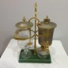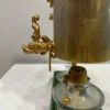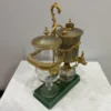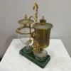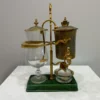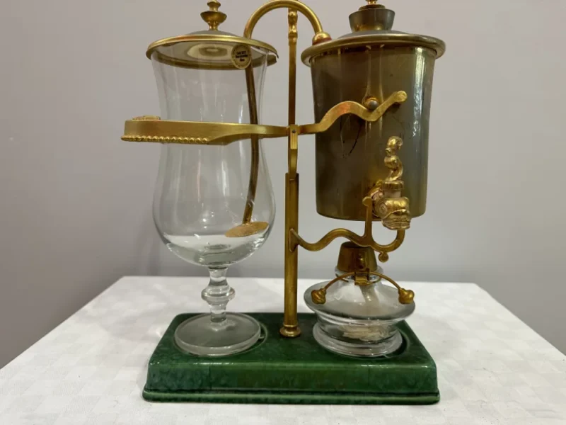 Es handelt sich bei dieser Kaffeemaschine um das Modell «Odette» . Die Horgener Firma Spiral AG hat diese wertvolle Sonderanfertigung in den fünfziger Jahren entwickelt. Der Glaskolben ist handgeblasen , beim Metall handelt es sich um 4 Karat Gold . Der Siphon und der Glaskolben stehen auf einer Platte aus dunkelgrün gefärbtem Porzellan.