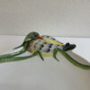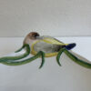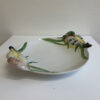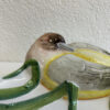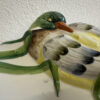 Glänzend glasierte Keramik, eine flache ovale Form und zwei plastisch ausgearbeitete Enten am Rand prägen diese aussergewöhnliche Schale. Die Tiere sind detailreich modelliert, mit fein bemalten Gefiederstrukturen in Grün, Gelb, Braun und Grau. Zwischen den Figuren ziehen sich stilisierte Schilfblätter entlang des Randes und geben dem Objekt eine klare Natur- und Jagdthematik. Die Kombination aus plastischem Dekor und ruhiger Schalenform macht das Stück dekorativ, ohne aufdringlich zu wirken.