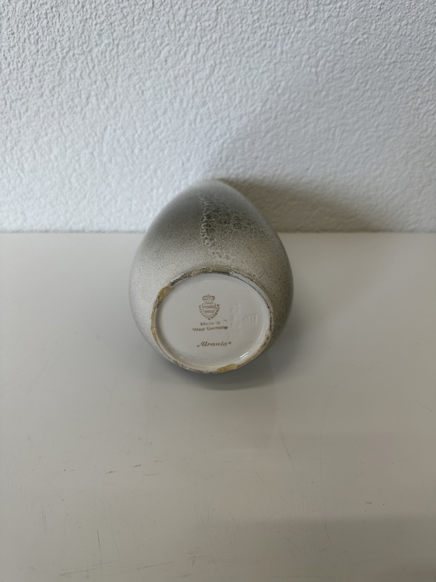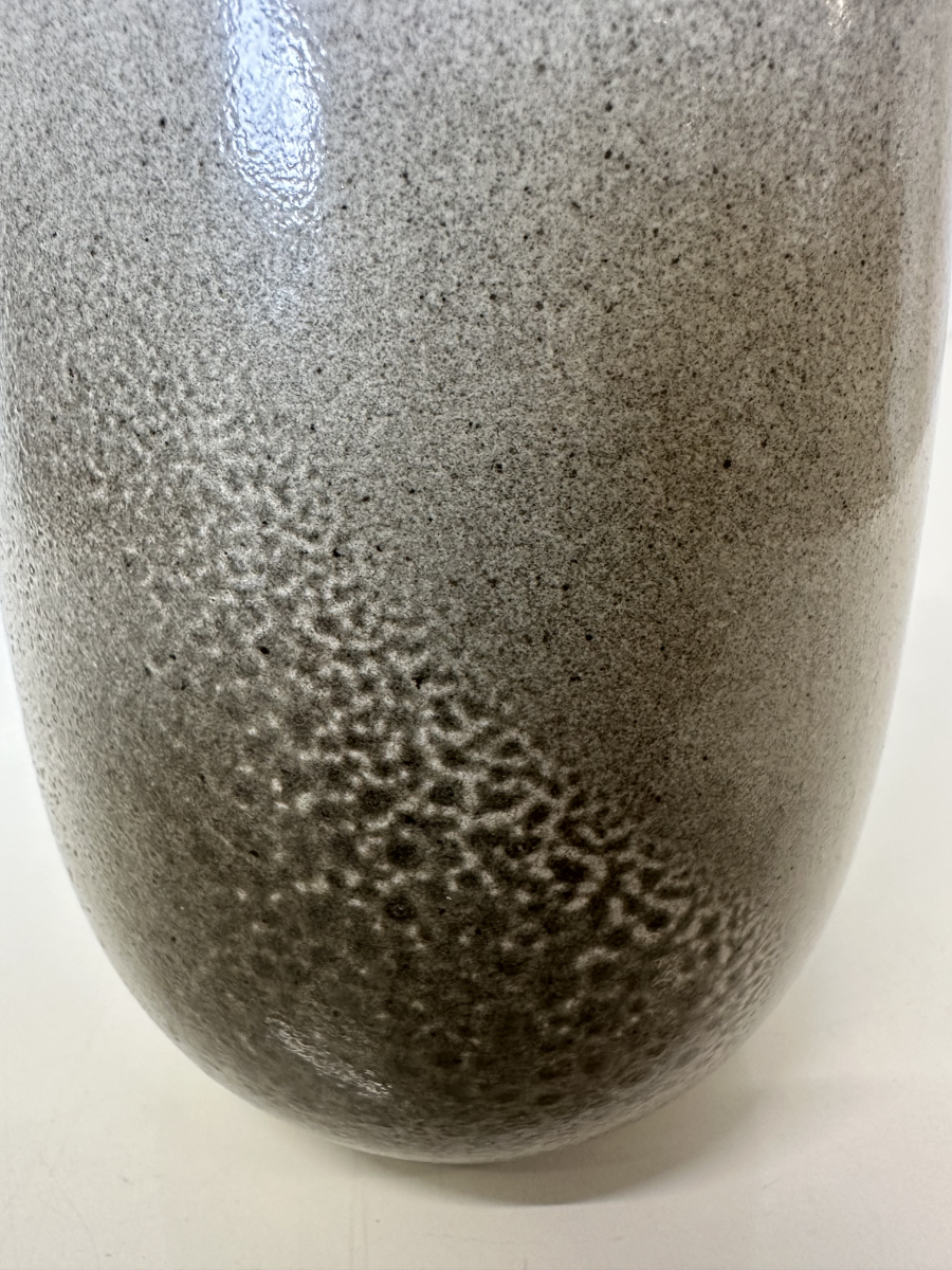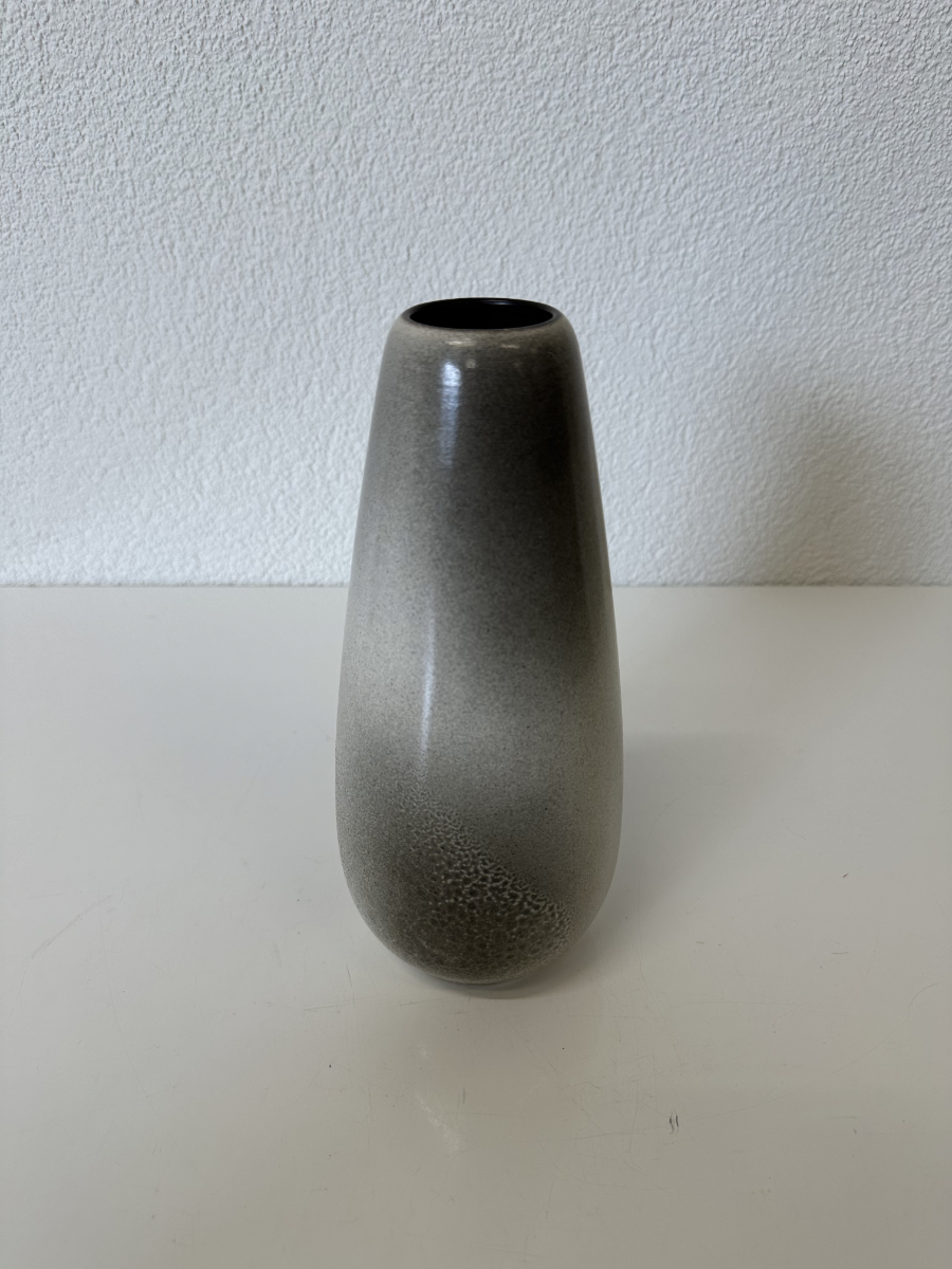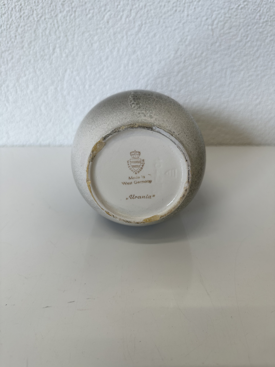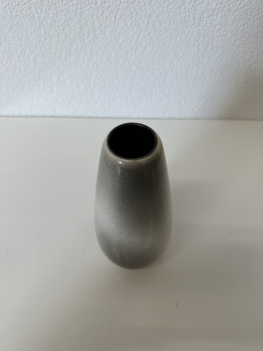 Schlanke, leicht bauchige Form mit ruhigem Auftritt: Diese Keramikvase stammt aus der Serie „Urania“ der Keramikmanufaktur Waechtersbach und wurde in West Germany gefertigt. Die Glasur zeigt einen sanften Farbverlauf von hellem Grau im oberen Bereich zu dunkleren Grau- und Anthrazittönen im unteren Teil. Besonders auffällig ist die fein strukturierte, fast körnige Oberfläche im unteren Drittel, die der Vase Tiefe und Charakter verleiht.