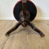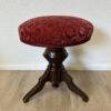 Runder Klavierhocker in vintage Ausführung mit gedrechseltem Holzgestell und klassischem Dreifuss. Die Sitzfläche ist fest gepolstert und mit einem roten Veloursstoff bezogen, der ein dezentes florales Muster zeigt. Der warme Farbton bildet einen schönen Kontrast zum dunkel gebeizten Holz. Die geschwungenen Beine und das zentrale, gedrechselte Mittelstück greifen traditionelle Formen auf, wie sie bei Klavierhockern und Sitzmöbeln der Mitte des 20. Jahrhunderts verbreitet waren. Durch seine kompakte Form eignet sich der Hocker nicht nur für den Musikbereich, sondern auch als dekoratives Sitzmöbel.
