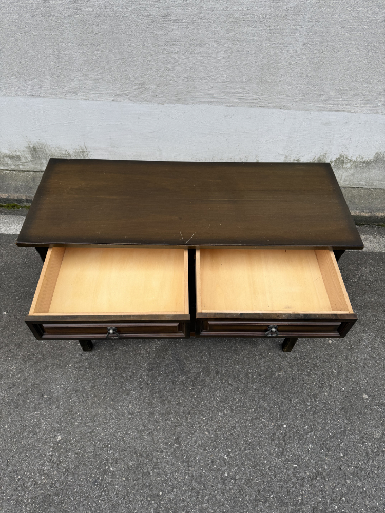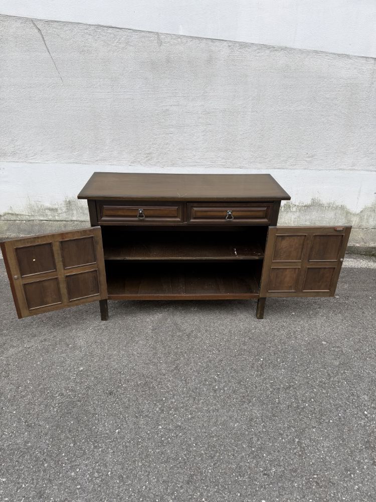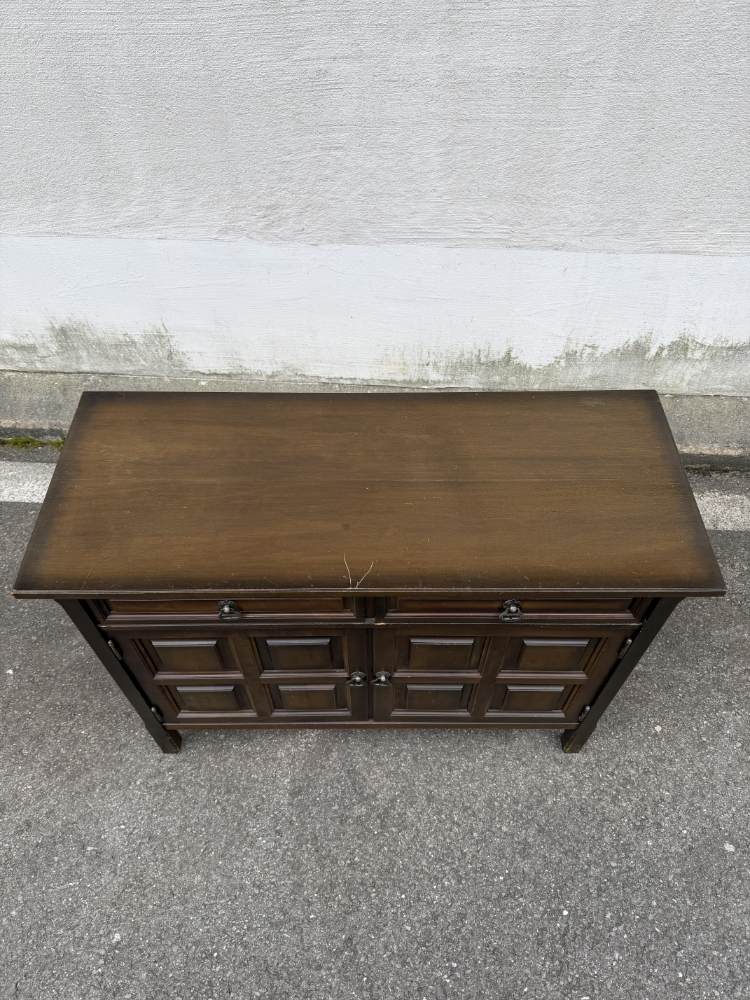 Dunkles Massivholz, solide Verarbeitung und klassisches Design machen diese Kommode zu einem langlebigen Möbelstück mit Charakter. Die Front mit den markanten Kassettentüren und formschönen Metallgriffen verleiht ihr eine elegante, handwerkliche Ausstrahlung. Zwei obere Schubladen bieten praktischen Stauraum für kleinere Gegenstände, während das grosse Innenfach zusätzlichen Platz schafft. Auf der oberen Fläche sind zwei sichtbare Kratzer vorhanden.