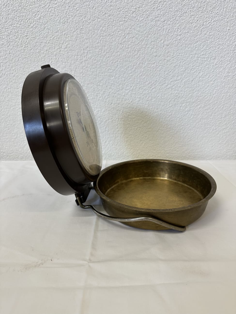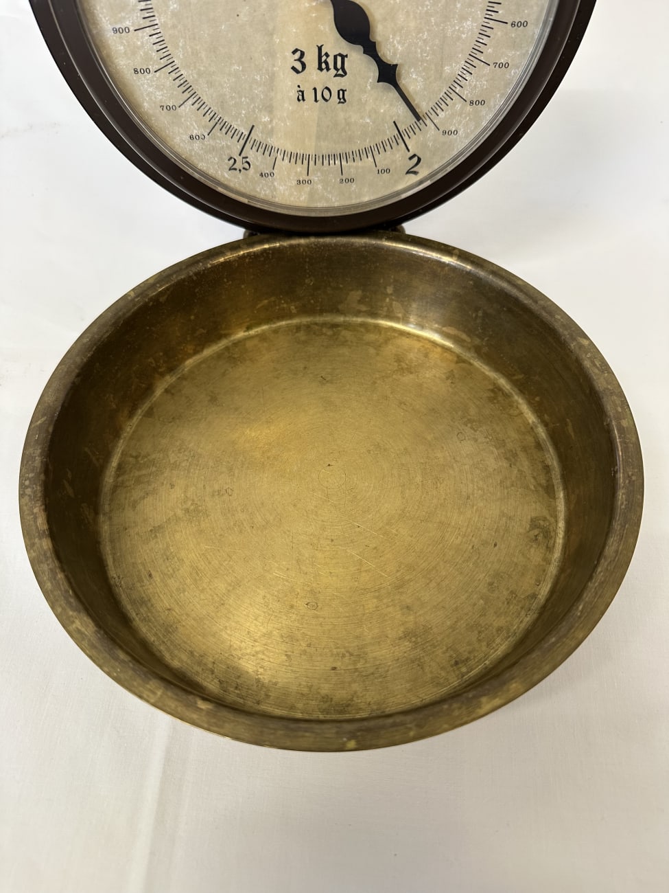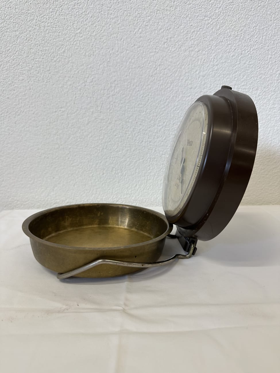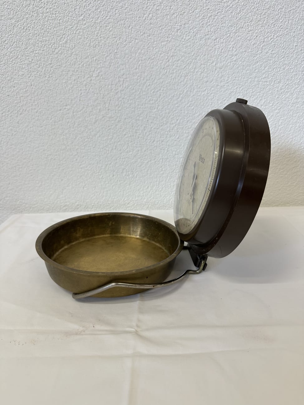 Die Waage besitzt eine abnehmbare Messschale aus Metall mit zwei seitlichen Griffen. Das Gehäuse besteht aus braunem Metall mit transparenter Frontscheibe. Die Kombination aus Metall, Glas und klassischer Typografie verleiht der Waage einen typischen Vintage-Charakter aus der Mitte des 20. Jahrhunderts.