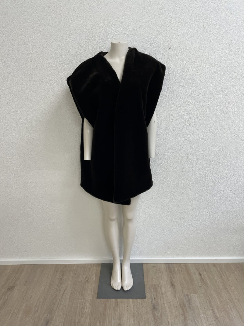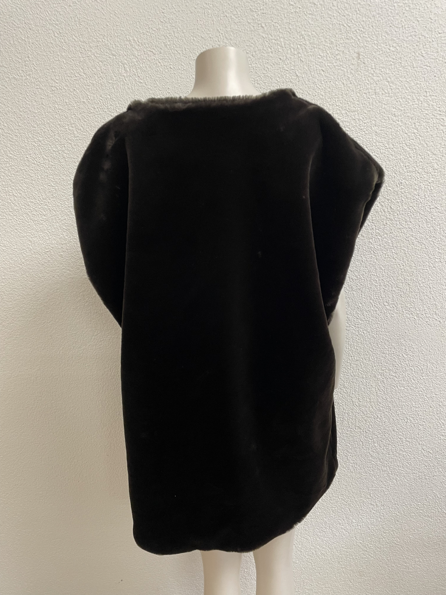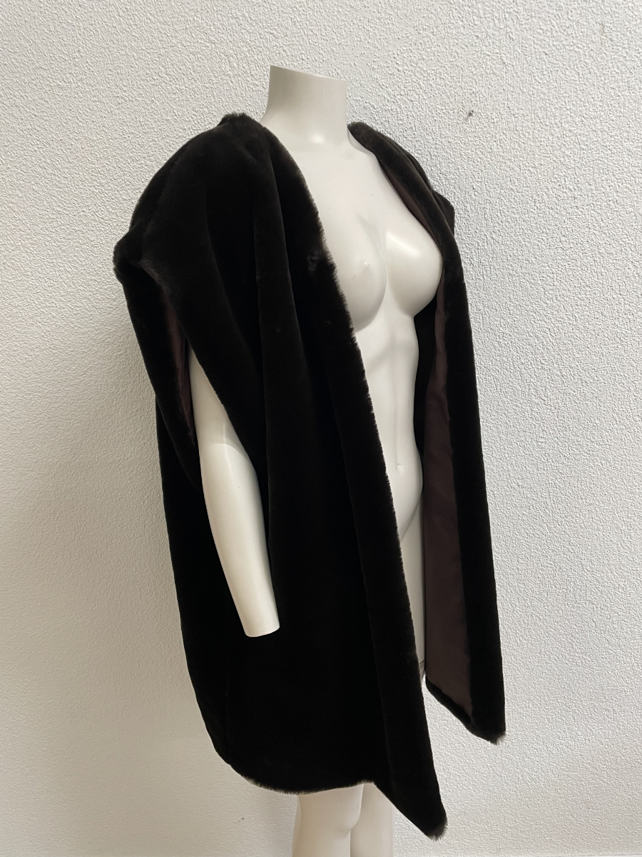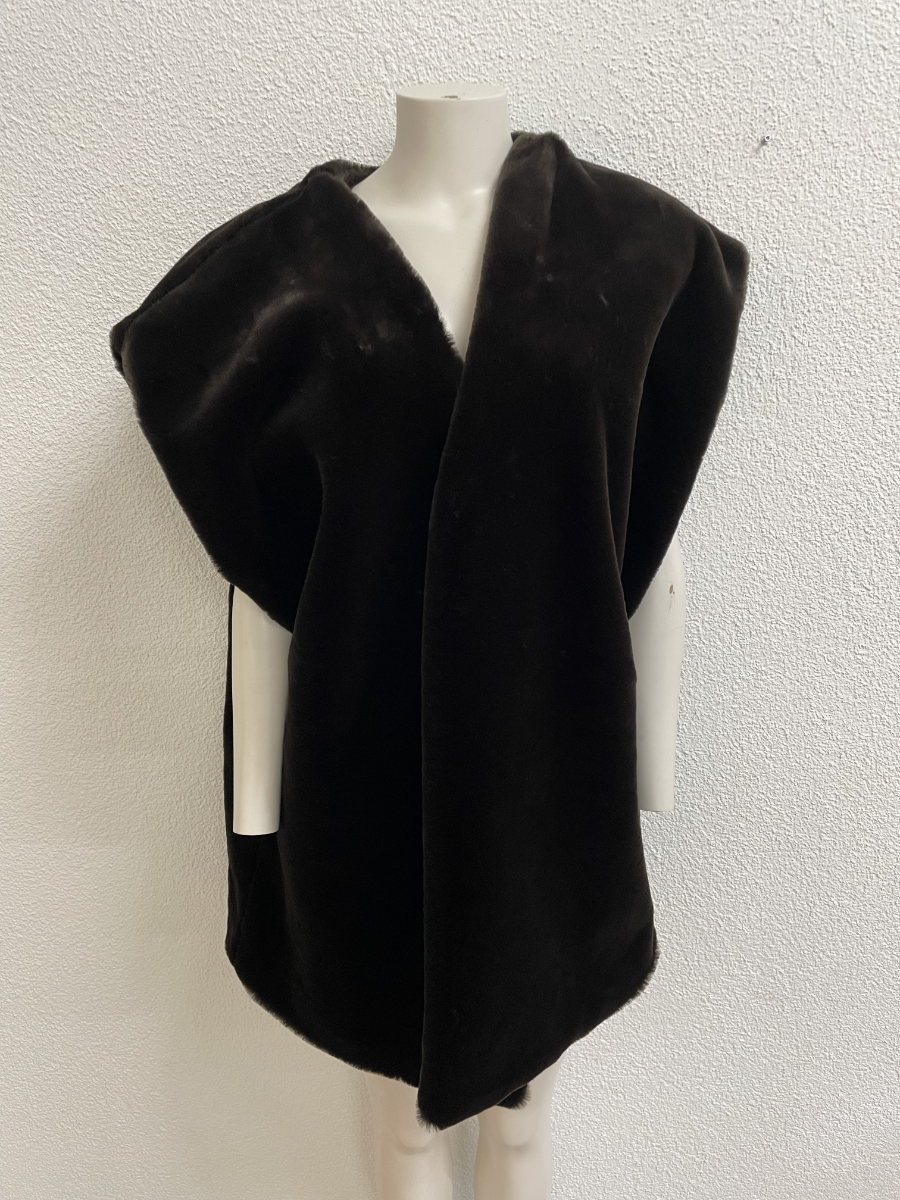 Dunkelbraun, weich und mit viel Volumen an den Schultern. Diese ärmellose Weste wirkt wie Pelz, besteht aber aus einem Kunstfell-Textilmix und trägt sich angenehm leicht. Der offene Schnitt fällt locker über Oberkörper und Rücken, innen sorgt ein glattes Futter in Braun für einen sauberen Sitz.