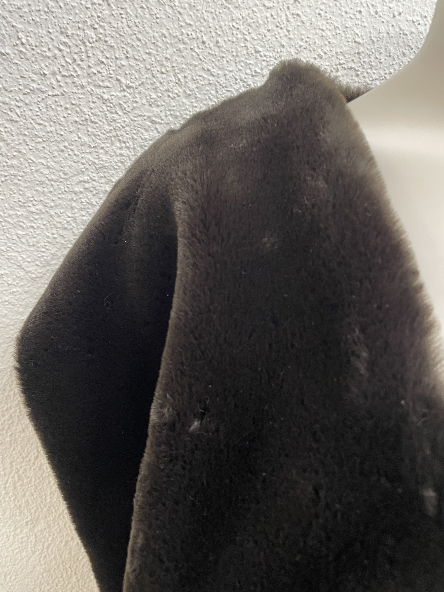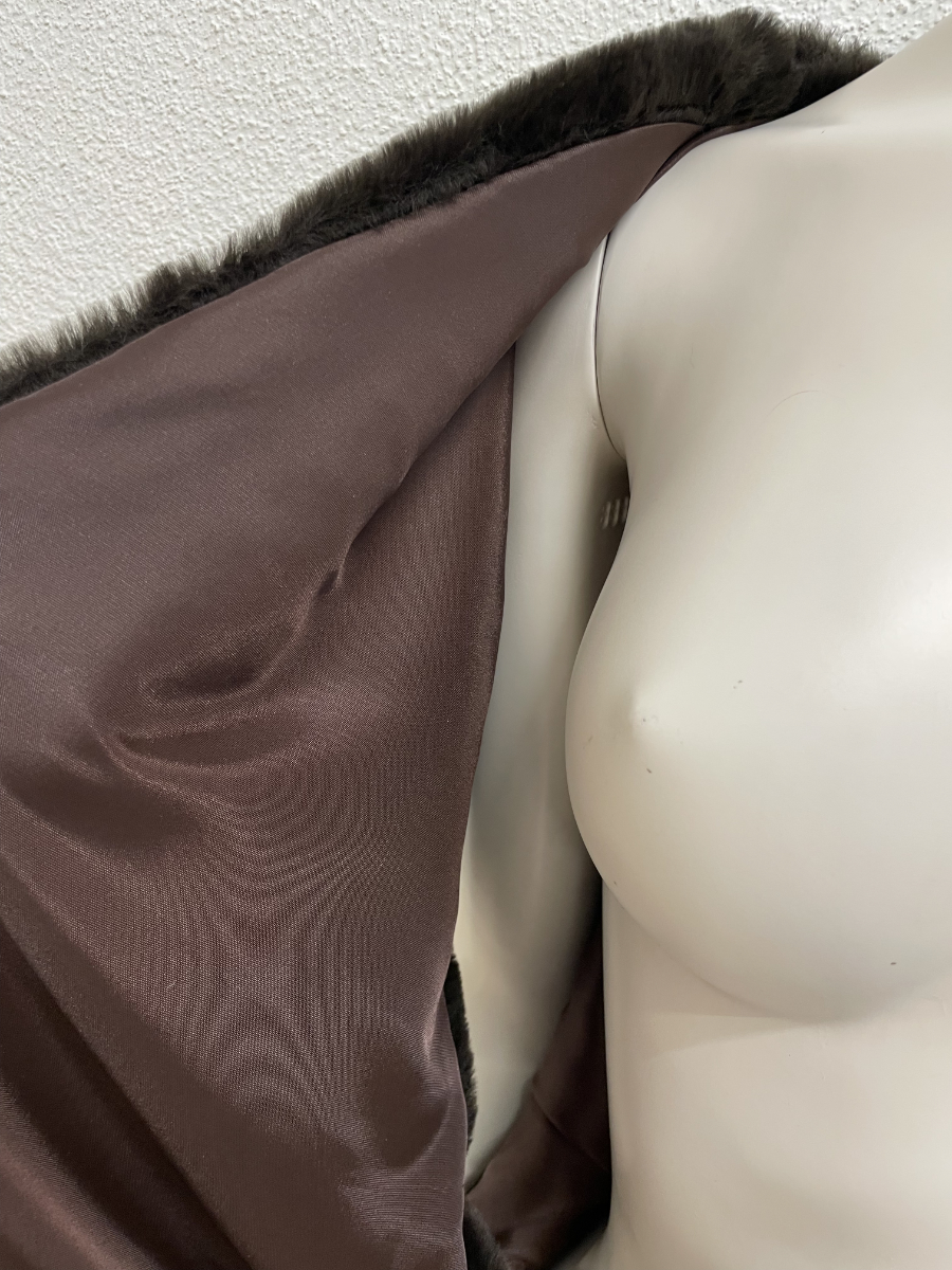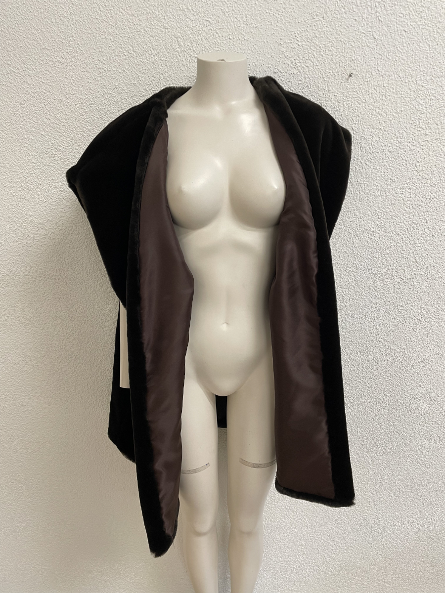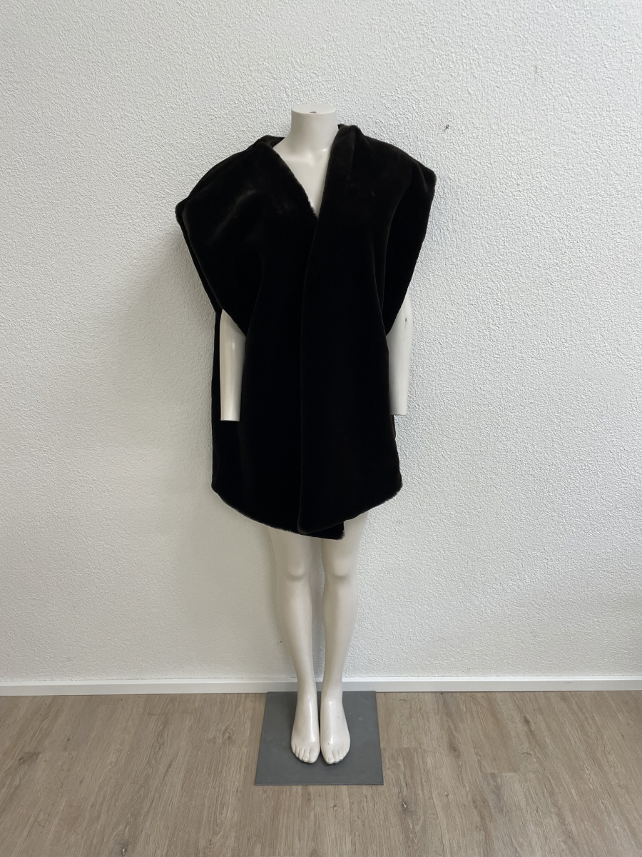 Dunkelbraun, weich und mit viel Volumen an den Schultern. Diese ärmellose Weste wirkt wie Pelz, besteht aber aus einem Kunstfell-Textilmix und trägt sich angenehm leicht. Der offene Schnitt fällt locker über Oberkörper und Rücken, innen sorgt ein glattes Futter in Braun für einen sauberen Sitz.