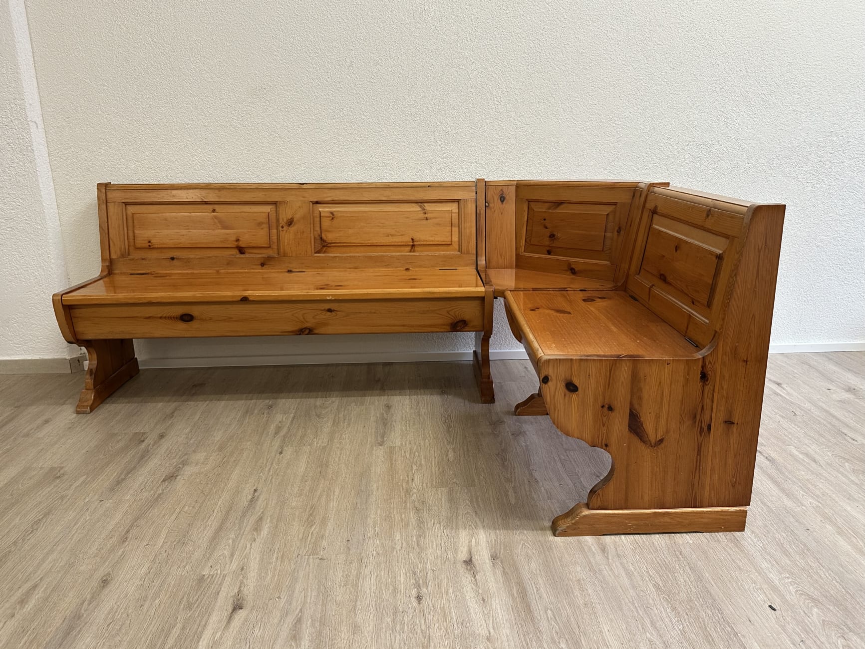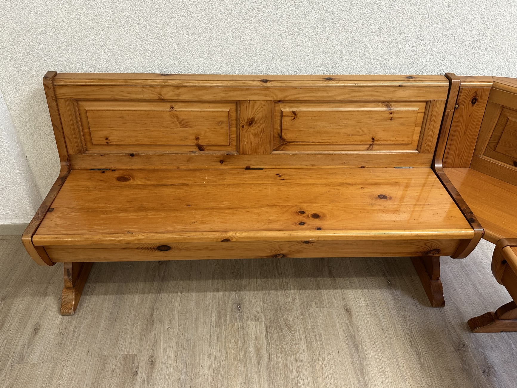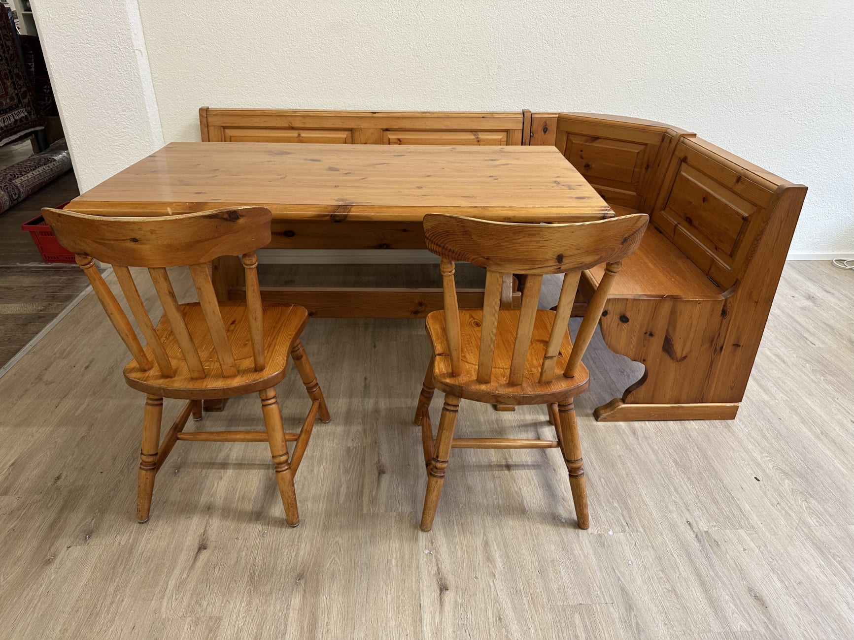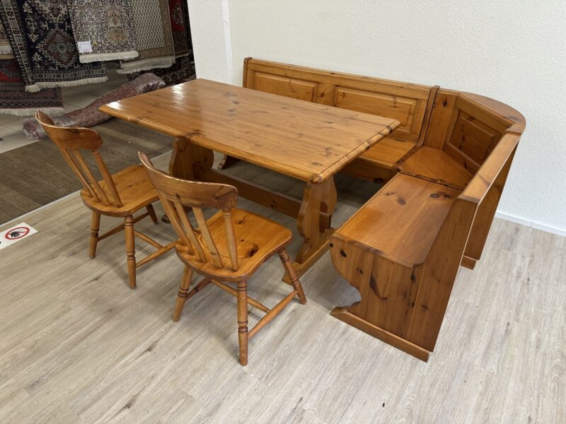 Warm getöntes Kiefernholz mit sichtbarer Maserung prägt diese gemütliche Essgruppe im typischen Landhausstil der 1990er Jahre. Die Eckbank bietet viel Platz und verfügt über aufklappbare Sitzflächen mit praktischem Stauraum im Inneren. Passend dazu gehören ein stabiler Massivholztisch sowie zwei Stühle mit gedrechselten Beinen und geschwungener Rückenlehne. Solche Sitzgruppen waren besonders in Schweizer Küchen und Esszimmern beliebt, weil sie robust, platzsparend und sehr gemütlich sind. Das Ensemble eignet sich ideal für Familienessen oder als rustikale Essgruppe in Küche, Stube oder Ferienwohnung.
