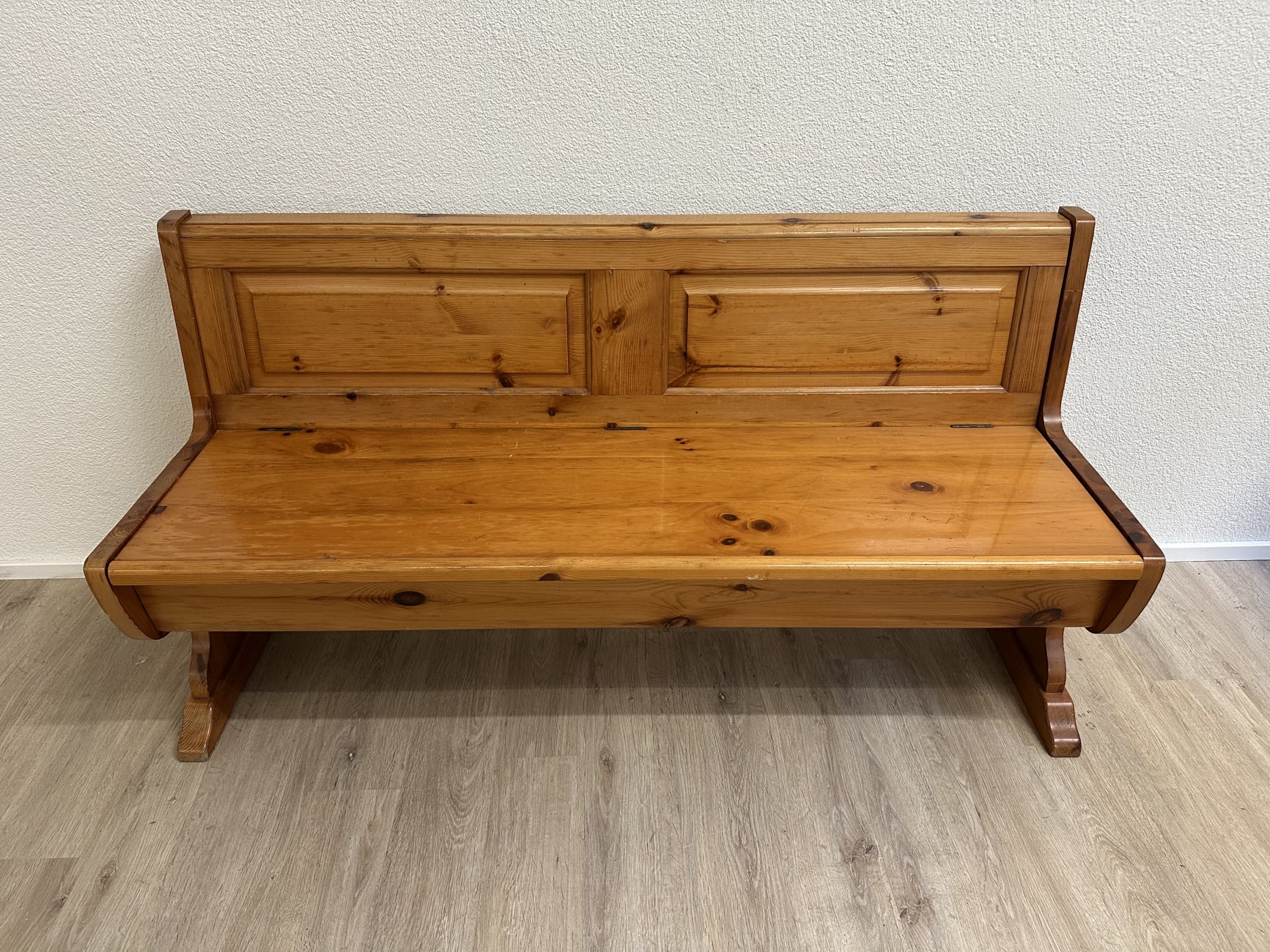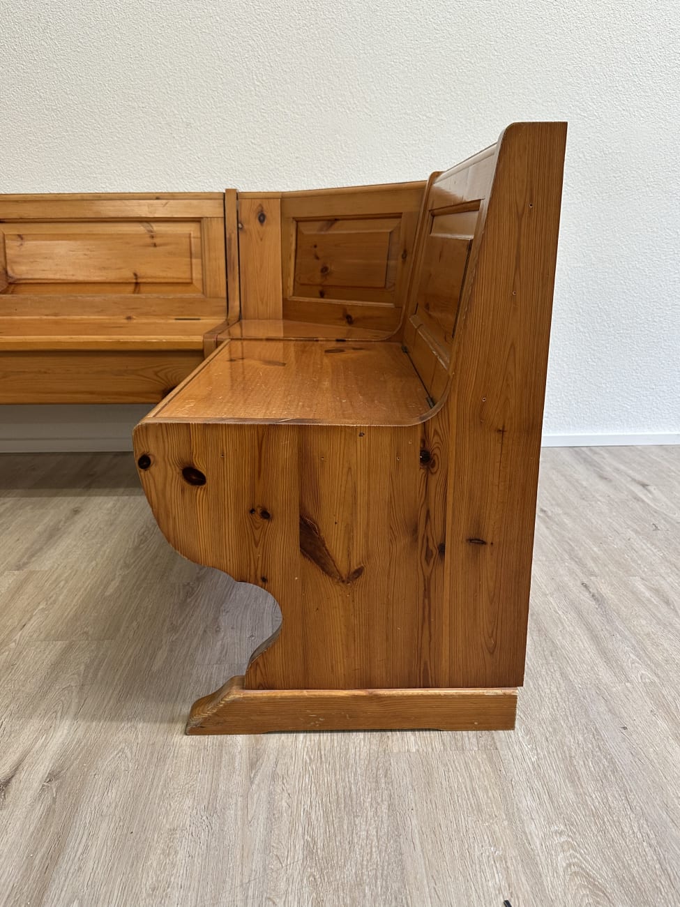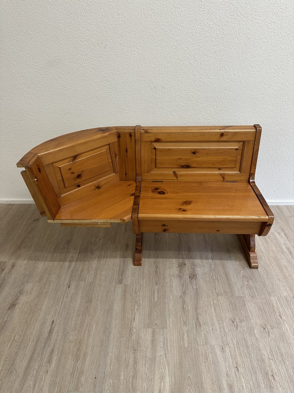 Warm getöntes Kiefernholz mit sichtbarer Maserung prägt diese gemütliche Essgruppe im typischen Landhausstil der 1990er Jahre. Die Eckbank bietet viel Platz und verfügt über aufklappbare Sitzflächen mit praktischem Stauraum im Inneren. Passend dazu gehören ein stabiler Massivholztisch sowie zwei Stühle mit gedrechselten Beinen und geschwungener Rückenlehne. Solche Sitzgruppen waren besonders in Schweizer Küchen und Esszimmern beliebt, weil sie robust, platzsparend und sehr gemütlich sind. Das Ensemble eignet sich ideal für Familienessen oder als rustikale Essgruppe in Küche, Stube oder Ferienwohnung.