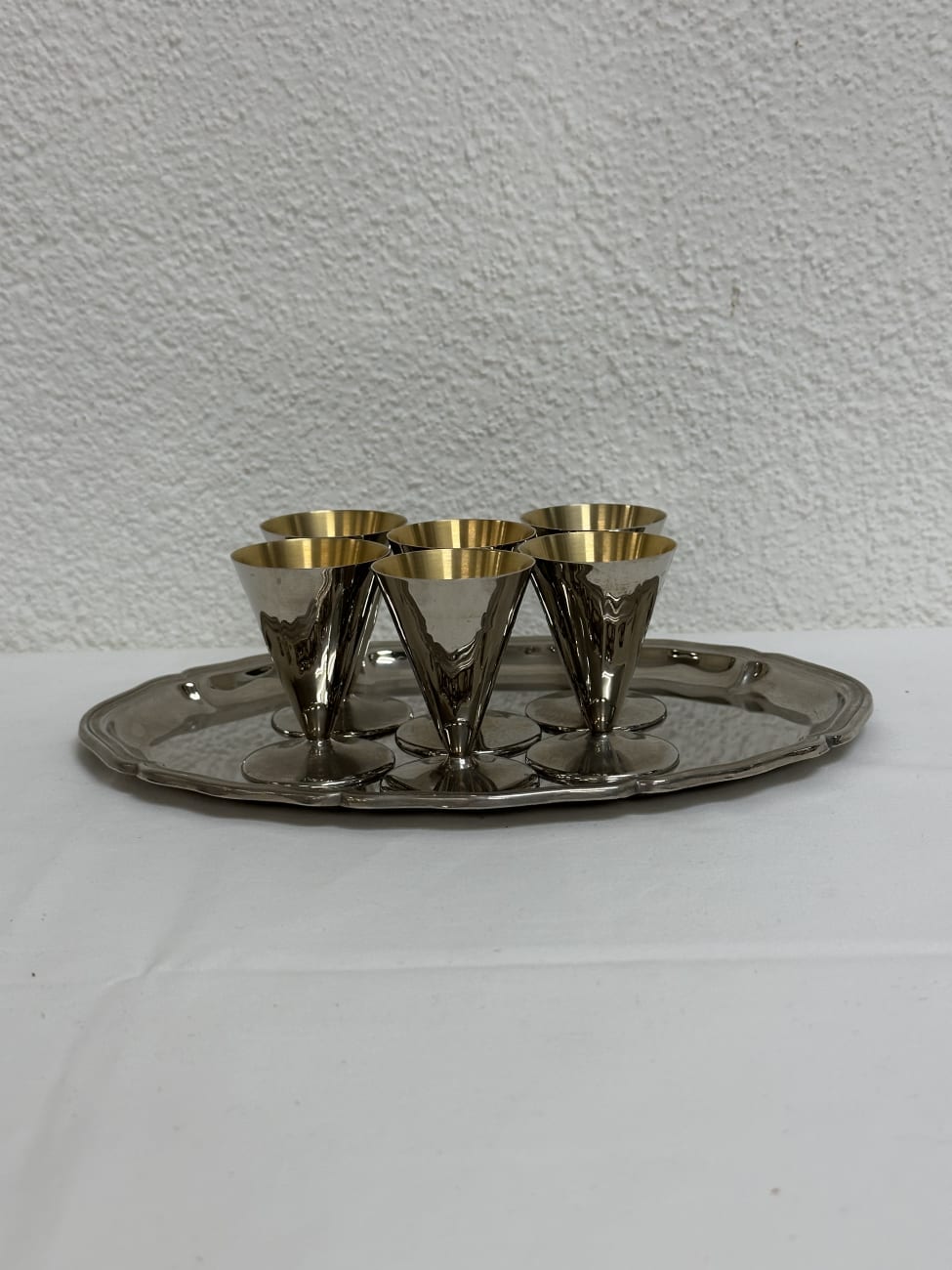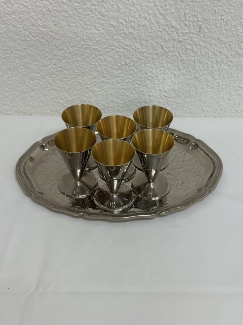 Silberfarbenes Servierset aus Metall mit sechs kleinen Likörbechern und passendem Tablett. Innen zeigen die Becher eine goldfarbene Beschichtung, die bei Likör- und Aperitifgläsern häufig verwendet wird und gleichzeitig eine warme, elegante Wirkung erzeugt. Die konische Kelchform mit rundem Fuss wirkt schlicht und modern und passt gut zu Bar-Accessoires aus den 1960er bis 1970er Jahren. Das Tablett mit geschwungenem Rand rundet das Ensemble ab und eignet sich ideal zum stilvollen Servieren kleiner Getränke.