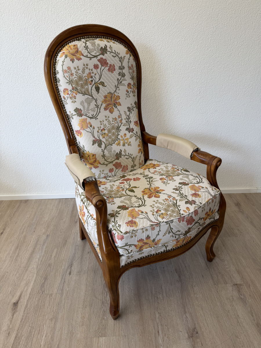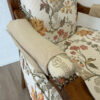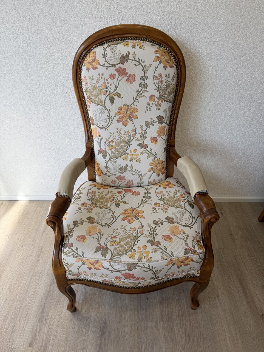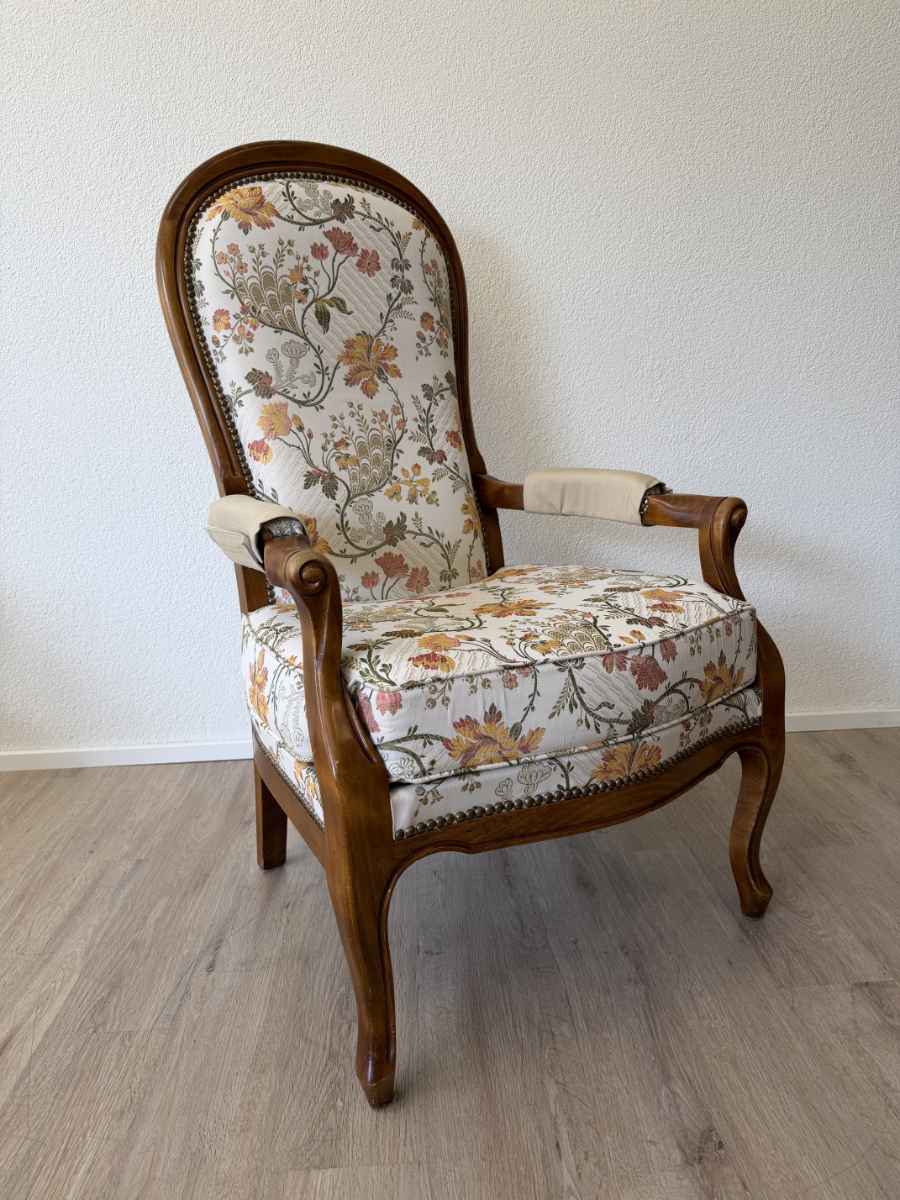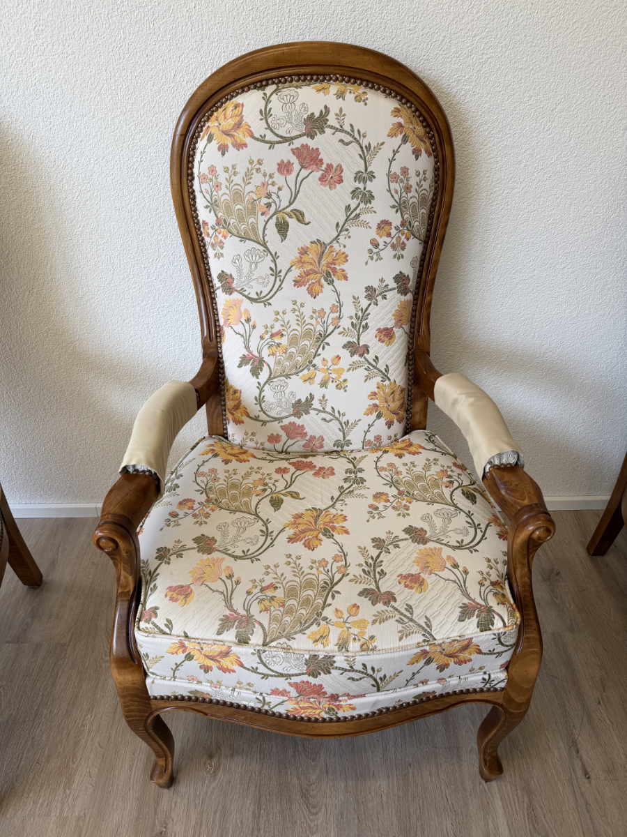 Der florale Stoff in Creme mit Gelb, Rost und Grün bringt eine wohnliche und klassische Ausstrahlung. Drei grosszügige Sessel mit bequemer Polsterung werden ergänzt durch einen passenden Hocker. Ideal als Ensemble im Wohnzimmer, Salon, Lounge, im Wintergarten oder als stilvolle Sitzgruppe im Gästezimmer.