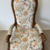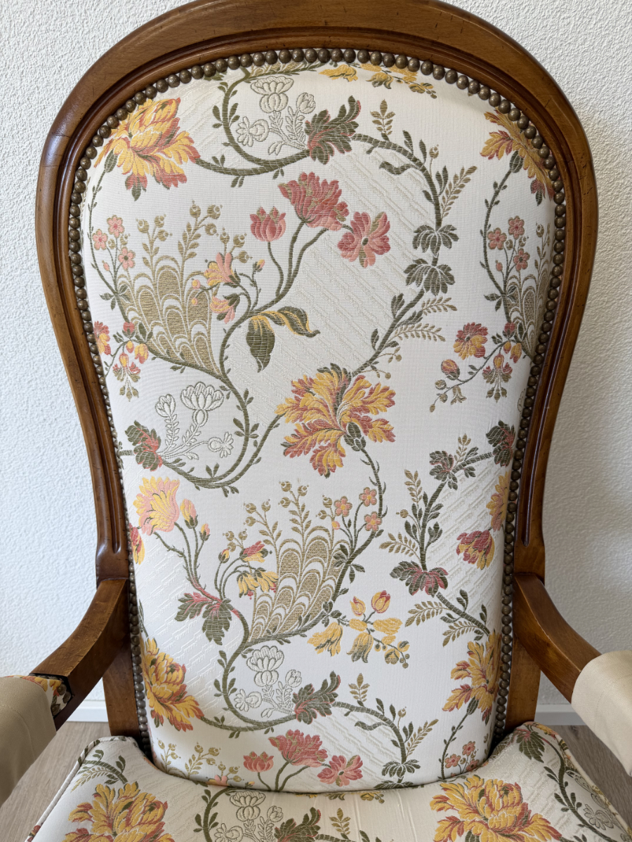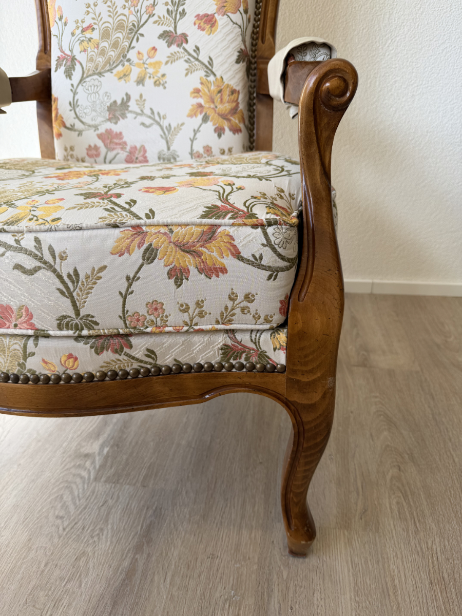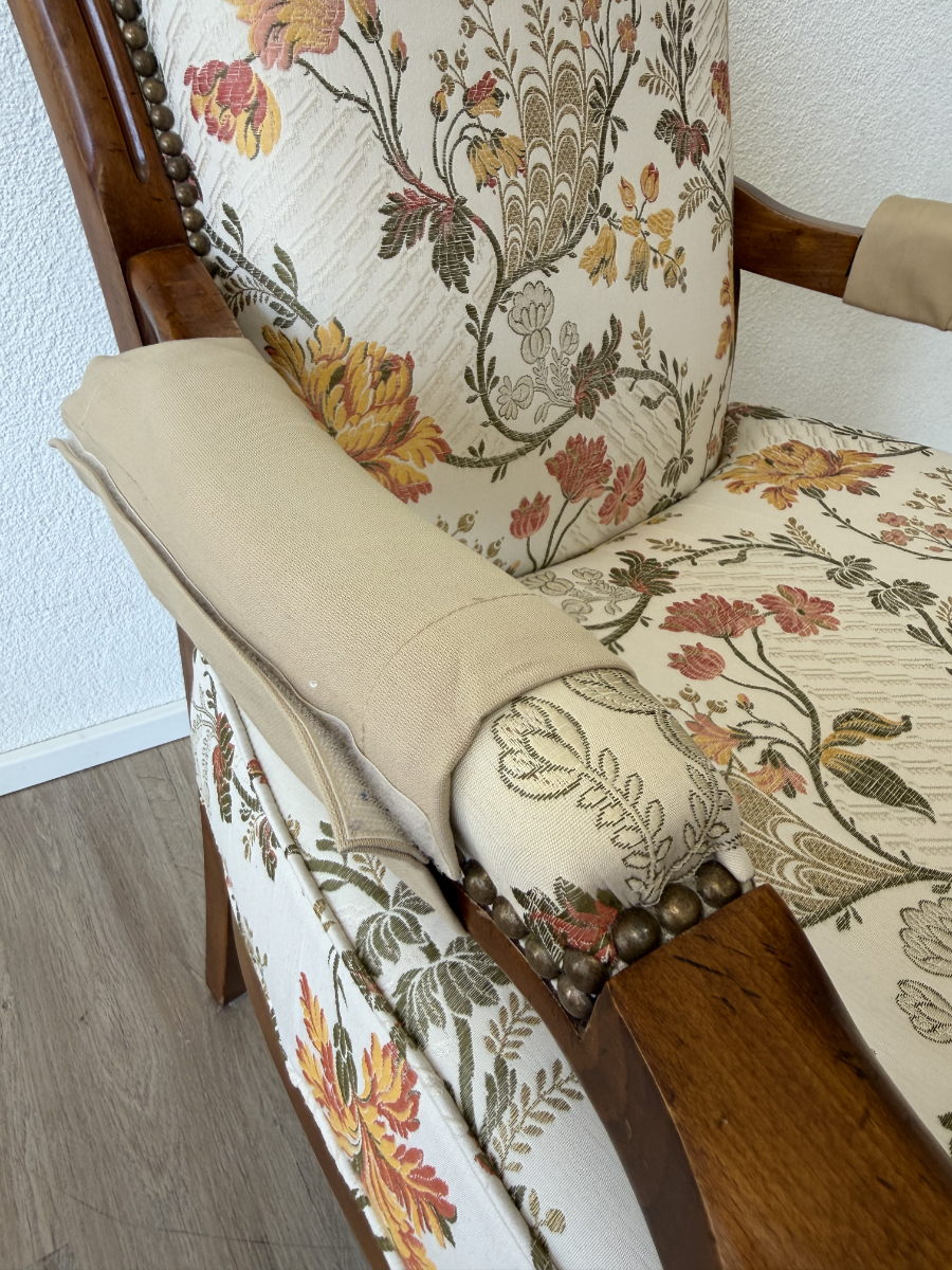 ✅ Material: Massives Nussbaumholz, Stoffbezug mit floralem Muster, Ziernägel