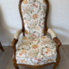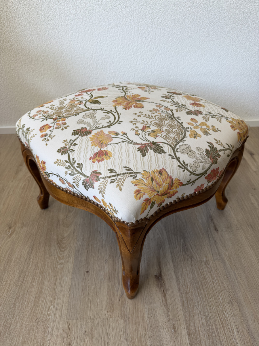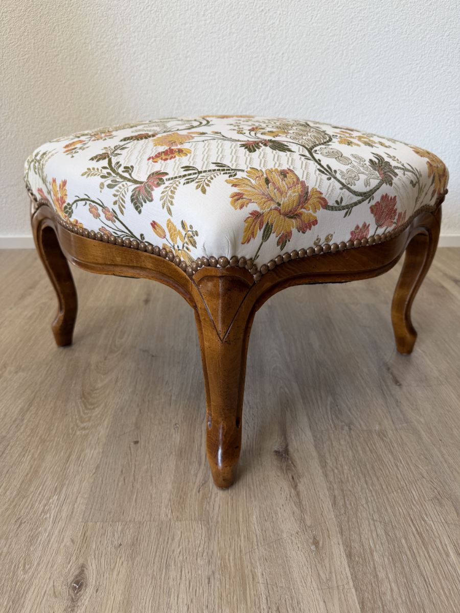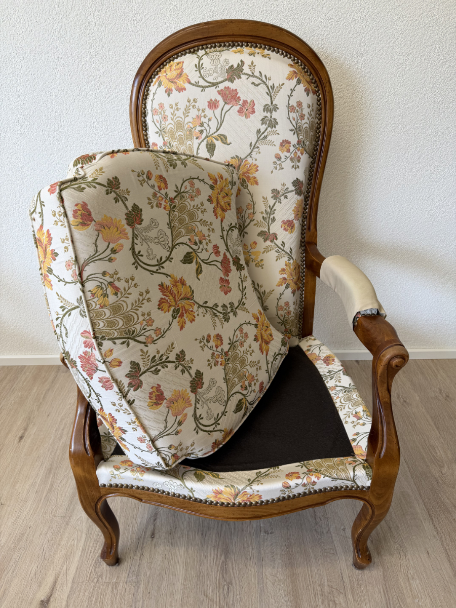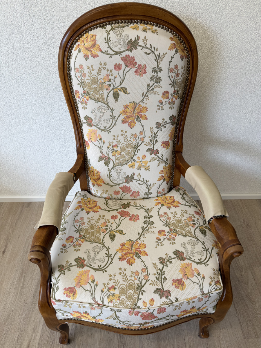 ✅ Material: Massives Nussbaumholz, Stoffbezug mit floralem Muster, Ziernägel