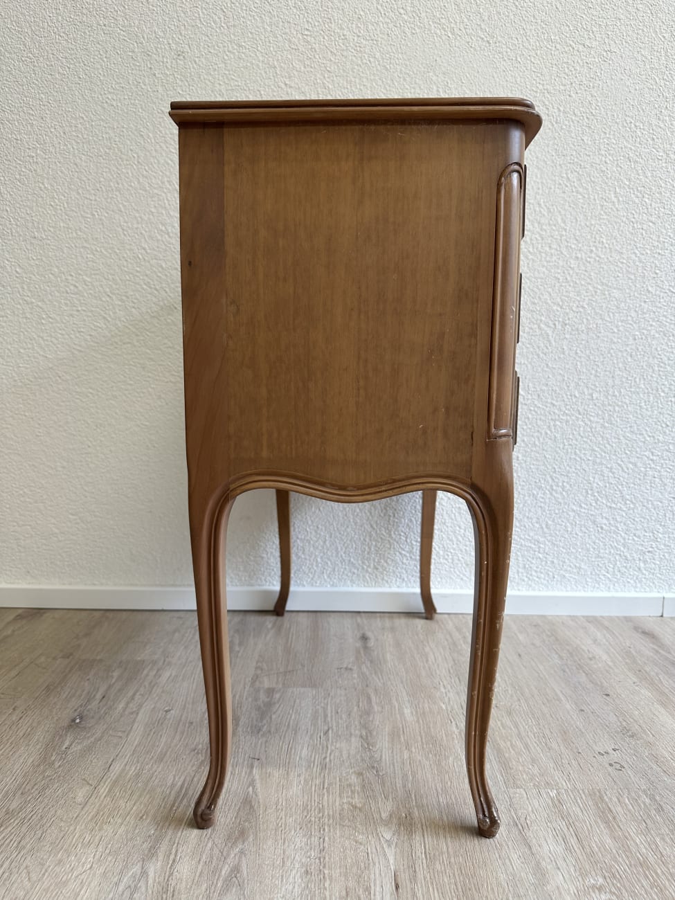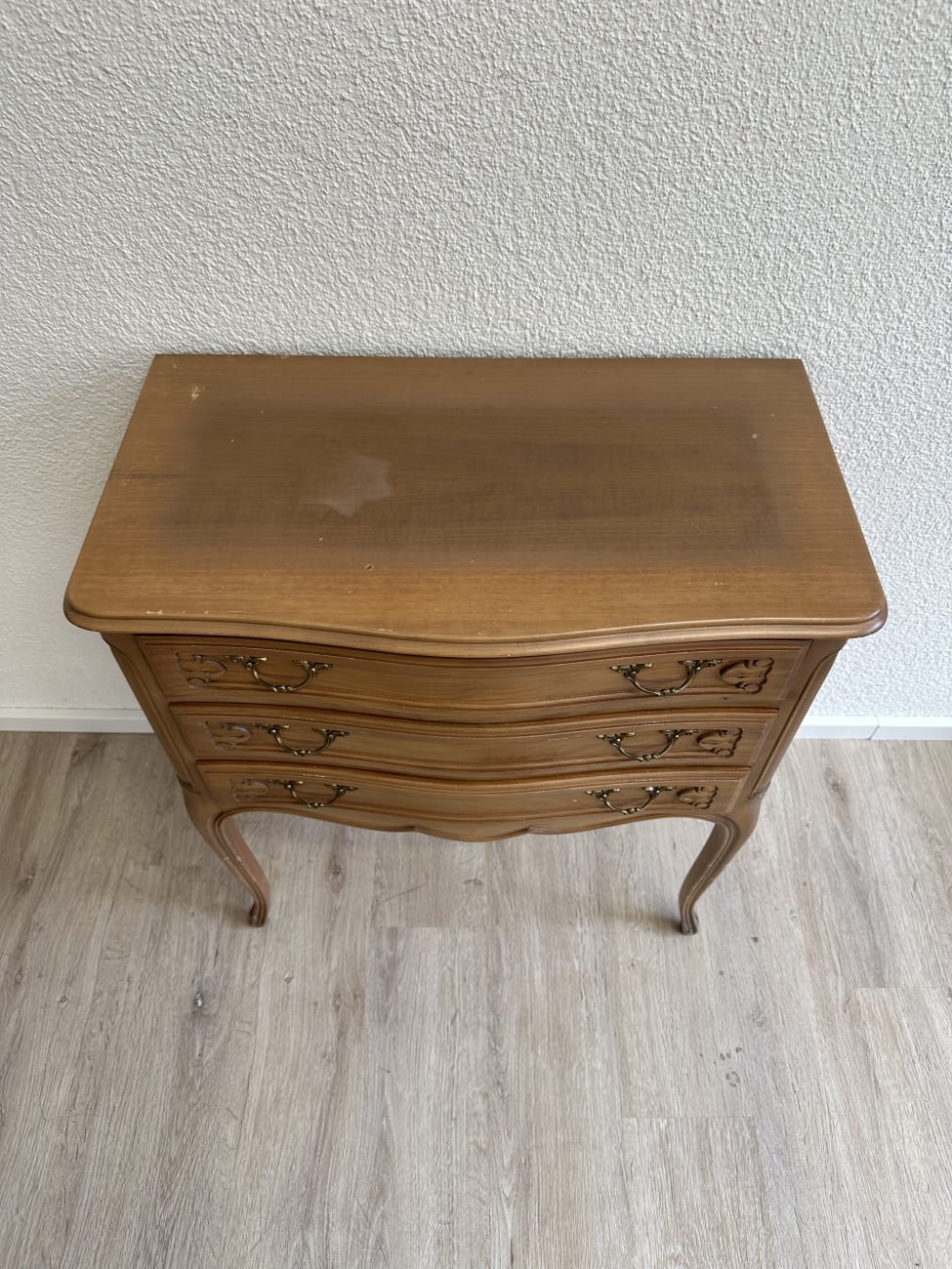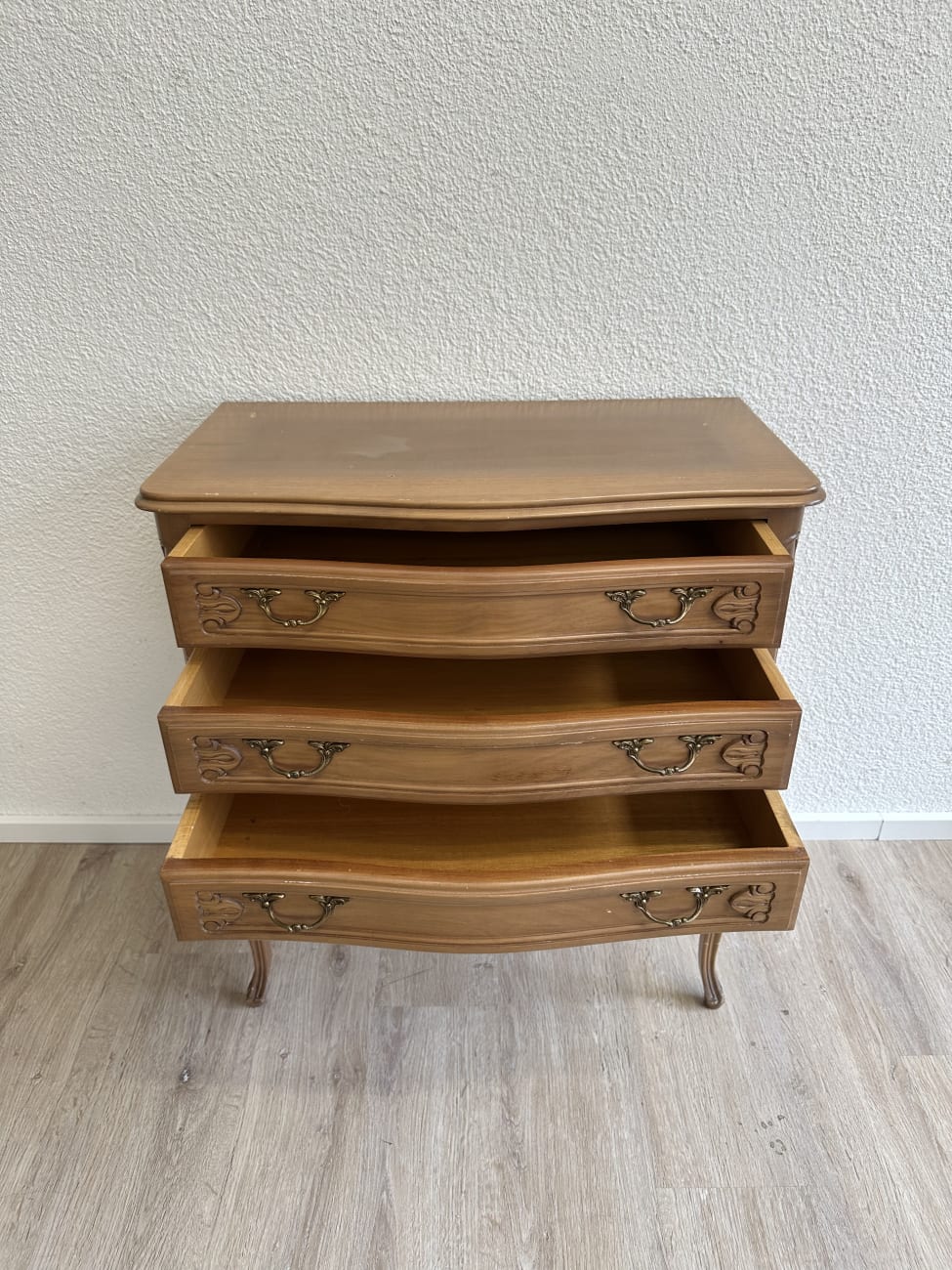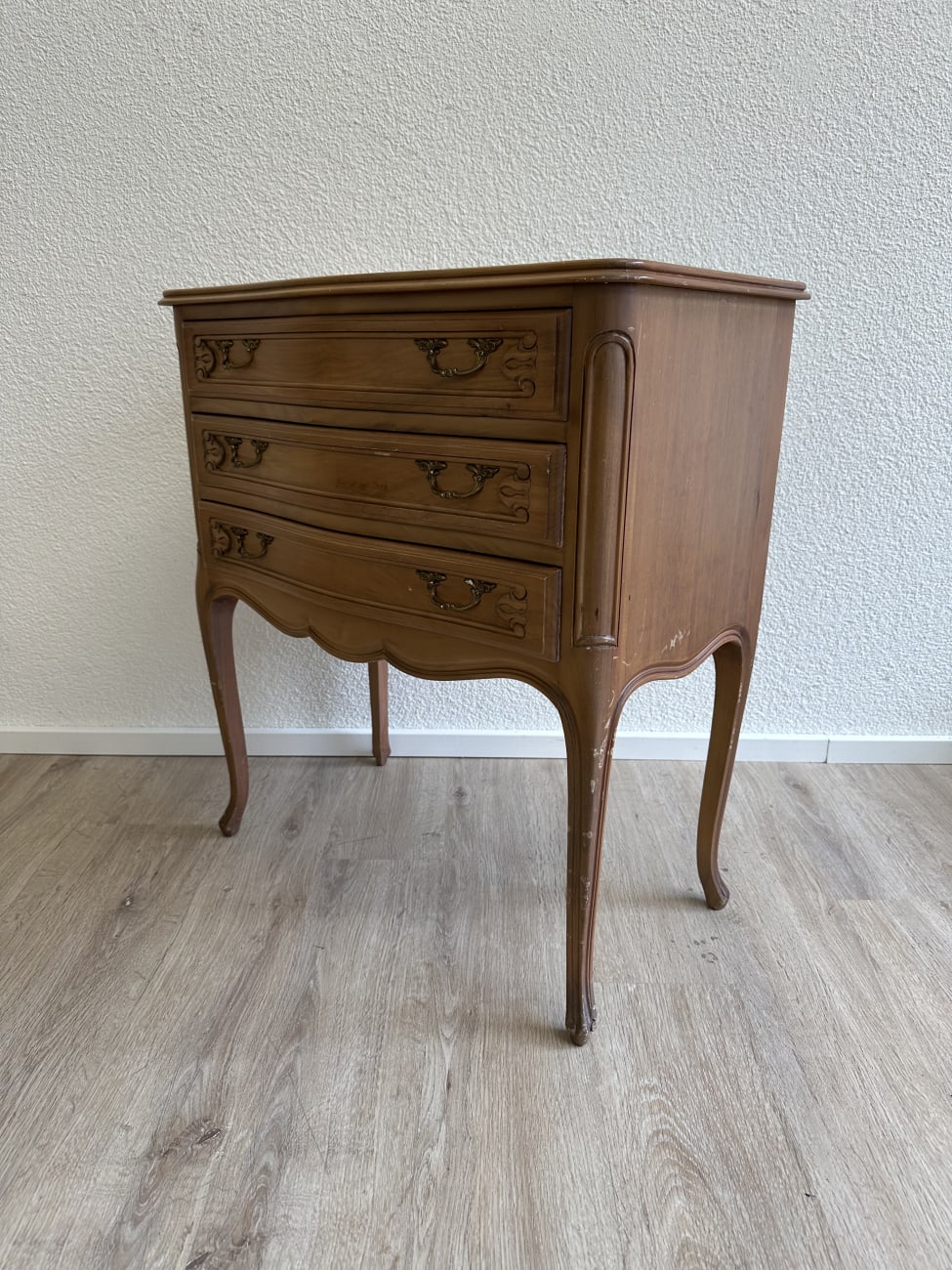 Geschwungene Front, elegante Cabriole-Beine und fein gearbeitete Metallgriffe geben dieser Kommode ihren typischen Louis XV Charakter. Die Form orientiert sich am französischen Rokoko-Stil mit weichen Linien und dekorativen Details. Vermutlich gefertigt um die 1960er Jahre im Stil historischer französischer Möbel. Drei breite Schubladen bieten praktischen Stauraum für Kleidung, Dokumente oder Alltagsgegenstände. Auf der Oberfläche und an den Beinen sind Gebrauchsspuren vorhanden, die vom früheren Gebrauch stammen und auf den Fotos erkennbar sind.