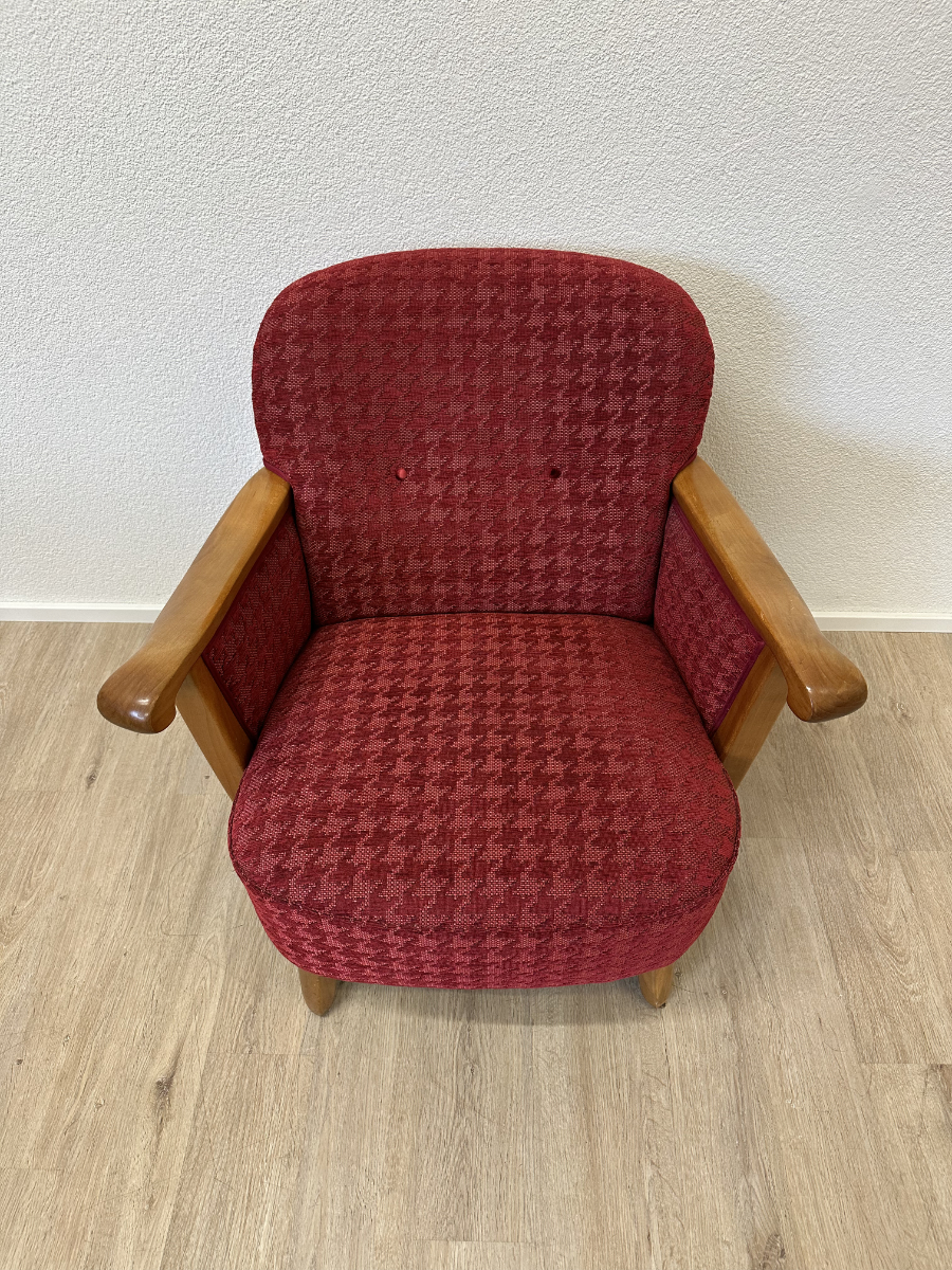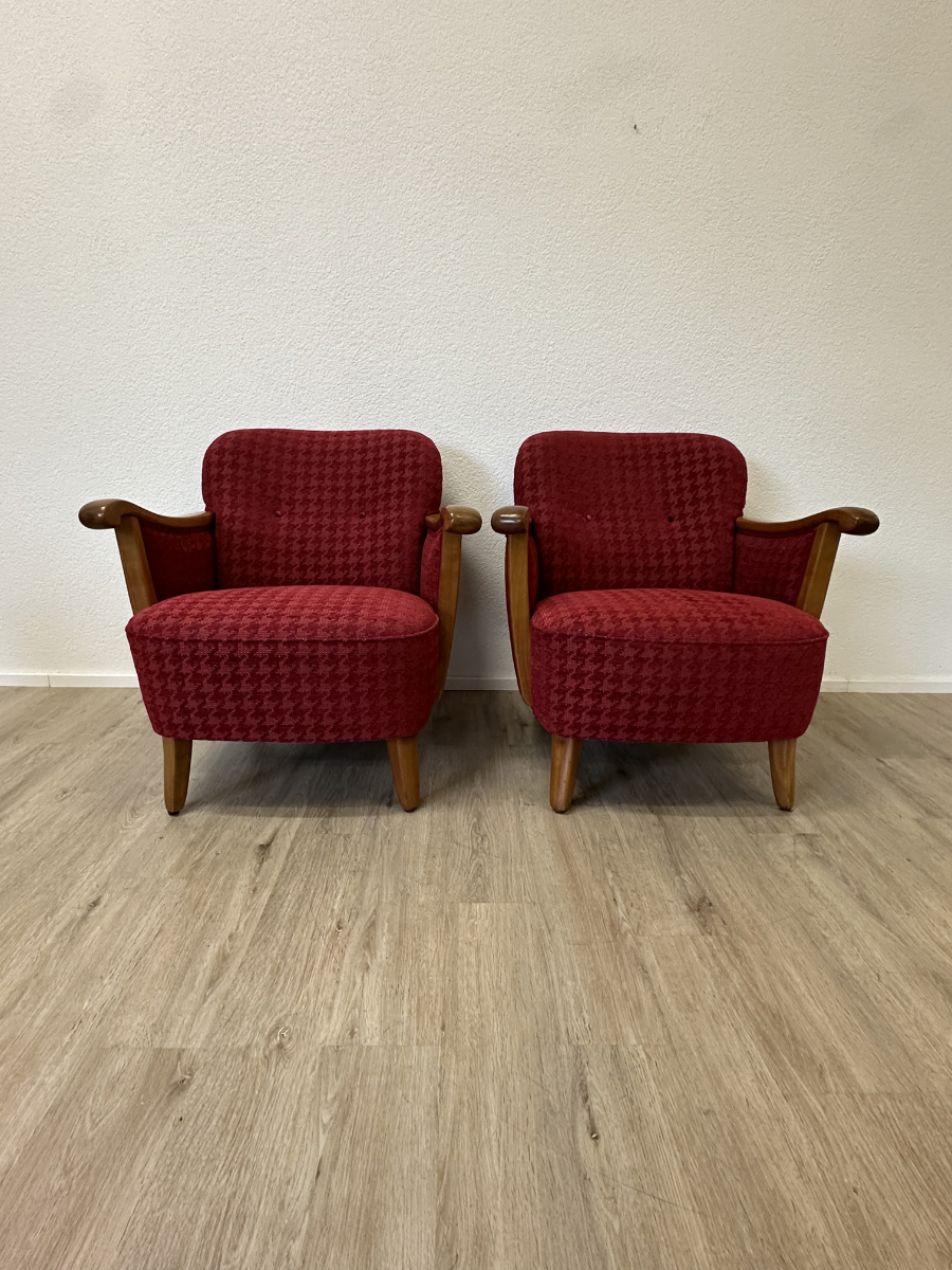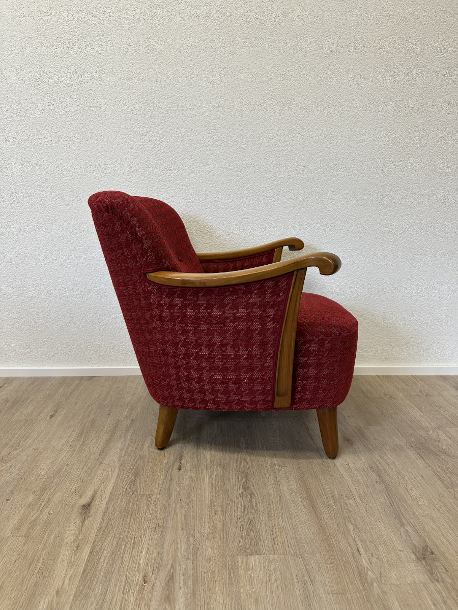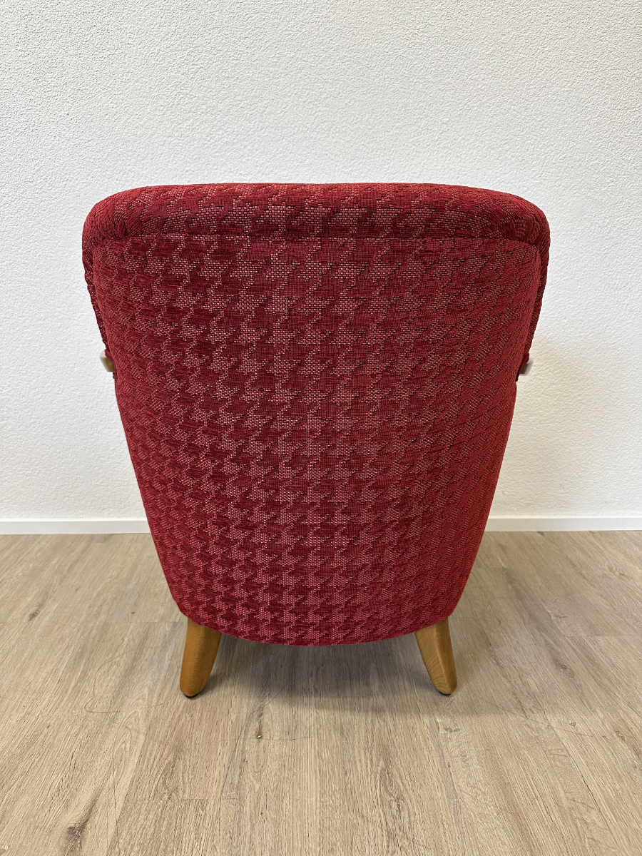 Rotes Hahnentritt Muster, geschwungene Armlehnen aus Holz und kompakte Proportionen machen dieses 2er Set zu typischen Vertretern des Mid Century Designs. Die Form ist leicht gerundet, die Beine stehen leicht schräg nach aussen und geben den Sesseln eine stabile, elegante Haltung. Warmes Holz trifft auf kräftigen Stoff in einem klassischen Rotton.