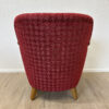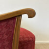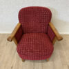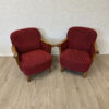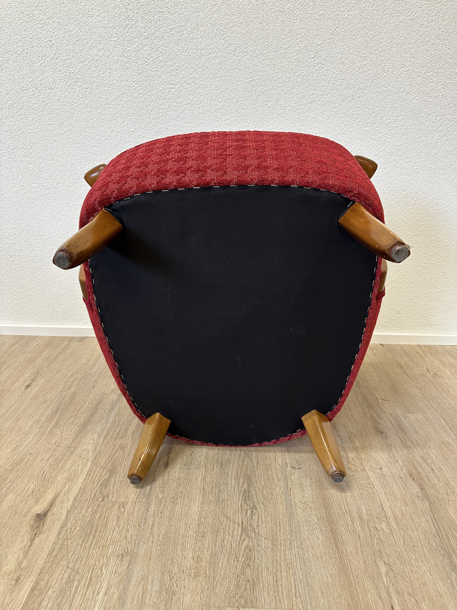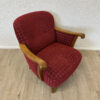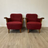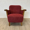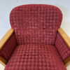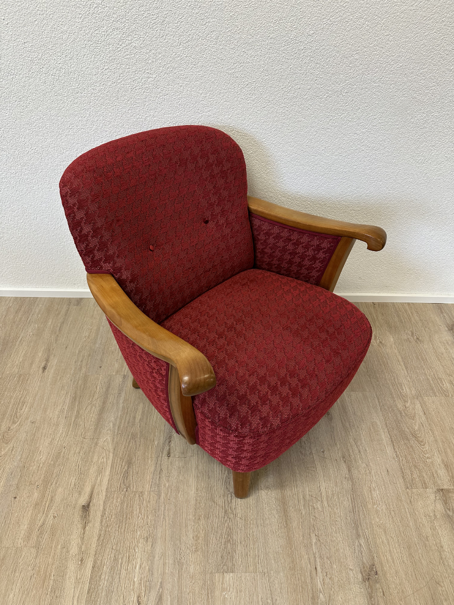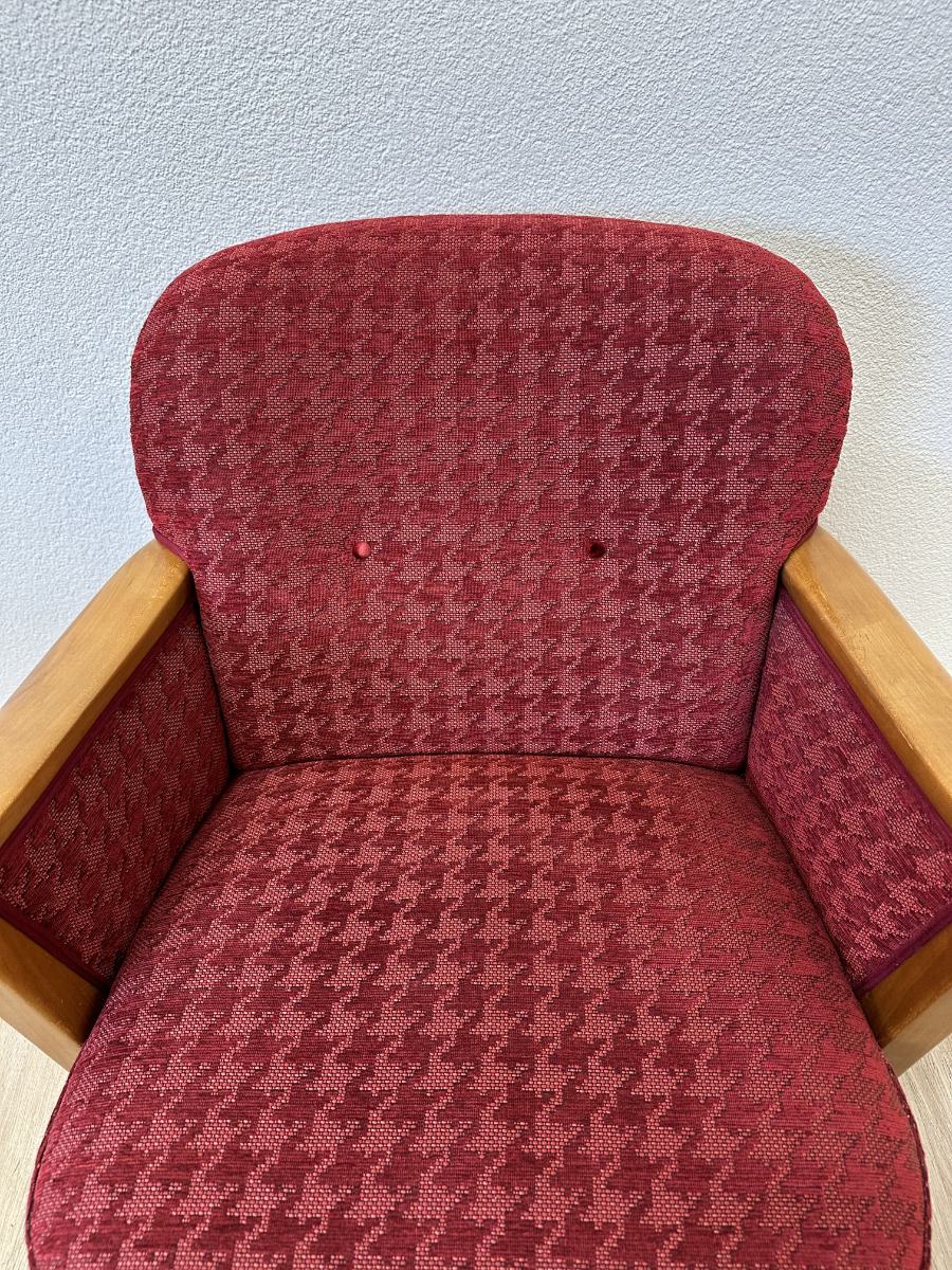 Rotes Hahnentritt Muster, geschwungene Armlehnen aus Holz und kompakte Proportionen machen dieses 2er Set zu typischen Vertretern des Mid Century Designs. Die Form ist leicht gerundet, die Beine stehen leicht schräg nach aussen und geben den Sesseln eine stabile, elegante Haltung. Warmes Holz trifft auf kräftigen Stoff in einem klassischen Rotton.