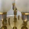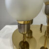 Diese elegante Deckenlampe aus den 1970er Jahren ist ein Paradebeispiel für das Mid Century Modern Design, klar, geometrisch und mit luxuriösen Materialien umgesetzt. Sechs satiniert-weisse Glaskugeln sitzen gleichmässig auf einer runden Messingbasis und spenden ein angenehm diffuses Licht. Die Kombination aus poliertem Messing, gebürsteten Metallfassungen und opalmattem Glas verleiht der Leuchte eine harmonische Balance zwischen Glamour und Funktionalität.