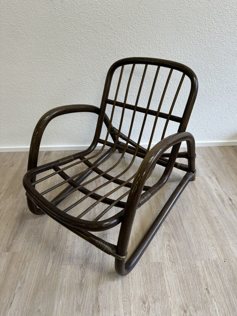 Dunkel gebeizter Bambus, gebogene Armlehnen und eine luftige Konstruktion aus Rattanstreben geben diesem Möbelstück den typischen Charakter der 1970er Jahre. Der Sessel gehört stilistisch zum Vintage Mid Century Bereich, der für organische Formen und natürliche Materialien bekannt ist. Auffällig sind die weich gerundeten Seitenteile sowie die geschwungene Sitzfläche, die aus mehreren Rattanstreben aufgebaut ist. Dadurch wirkt der Sessel leicht und offen, bleibt aber stabil und bequem. Solche Bambusmöbel waren besonders in Wintergärten, Ferienhäusern und gemütlichen Leseecken beliebt.