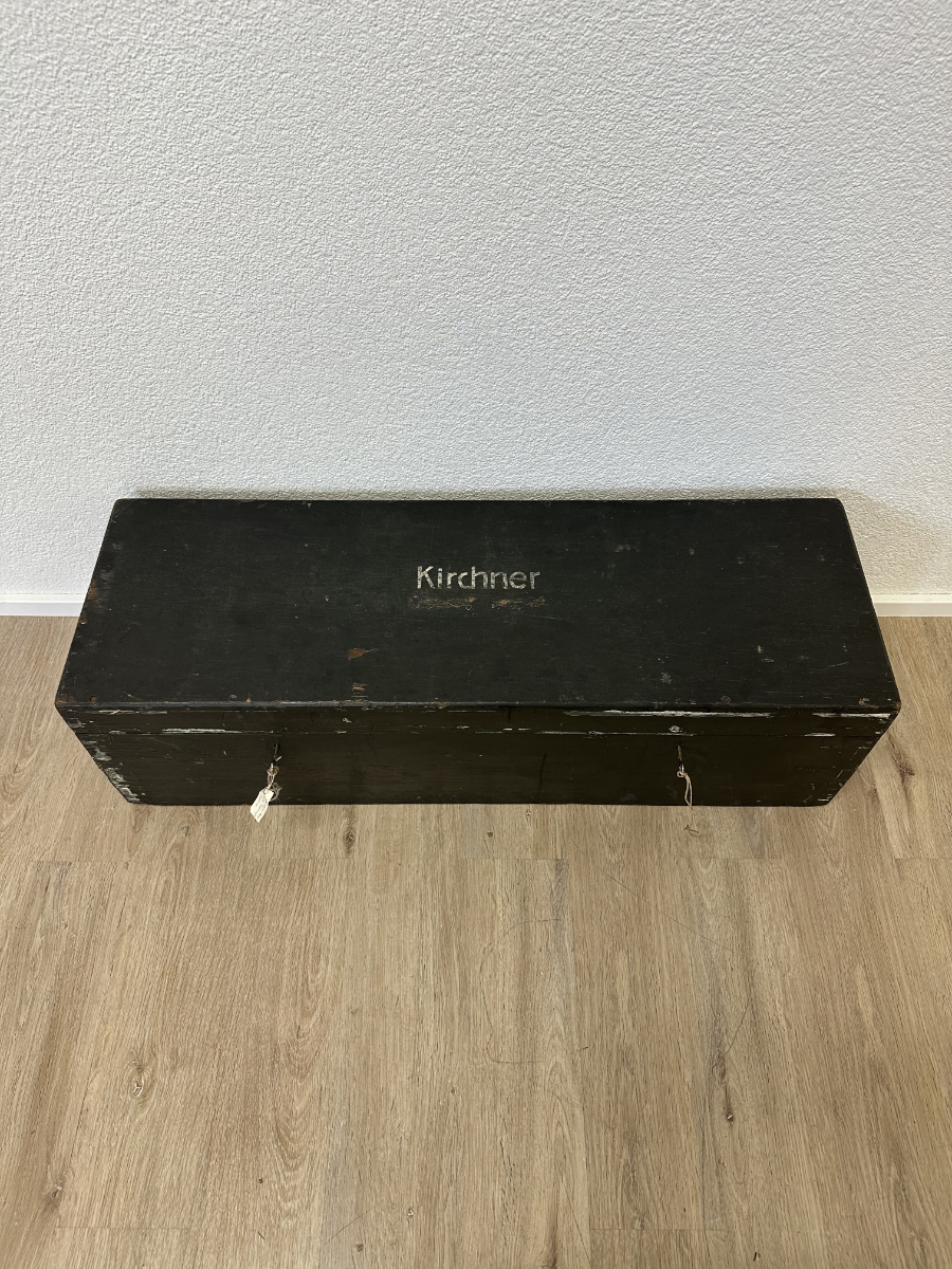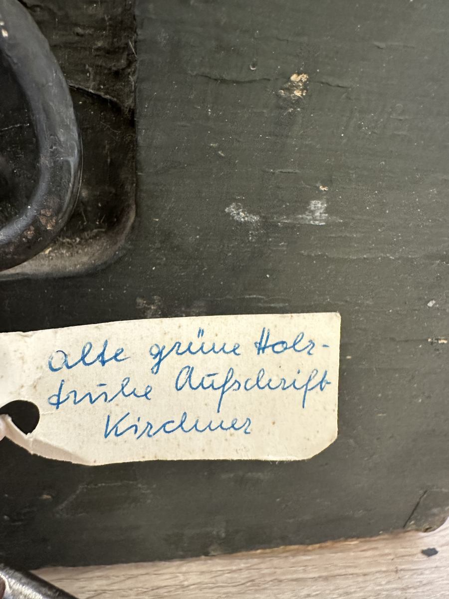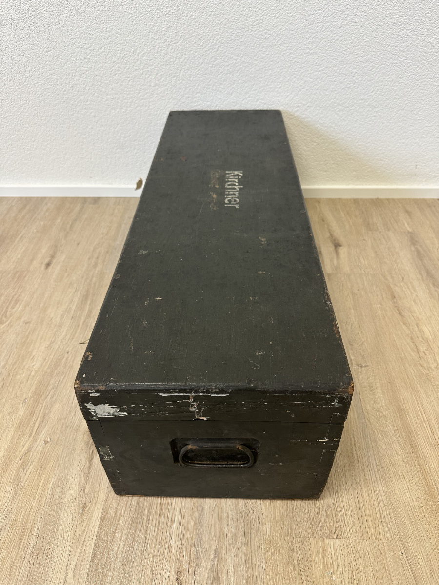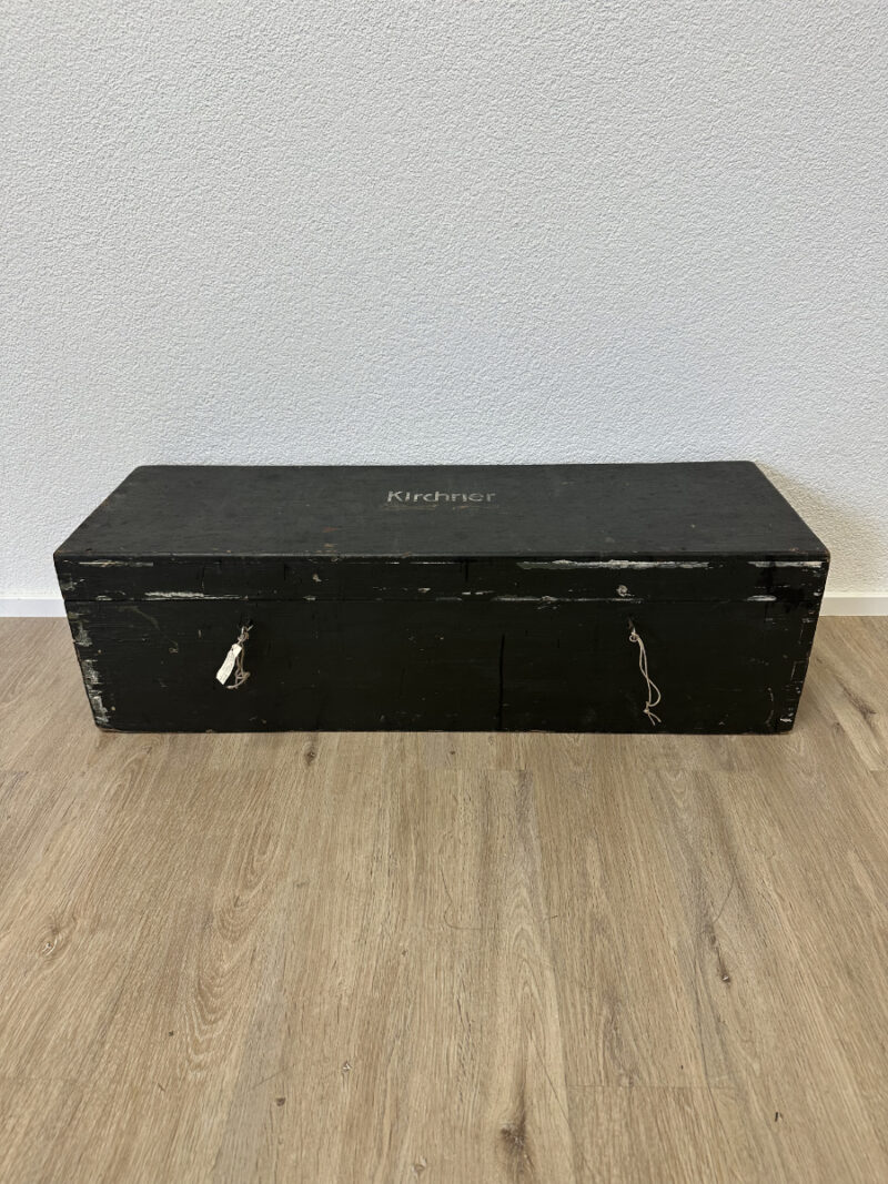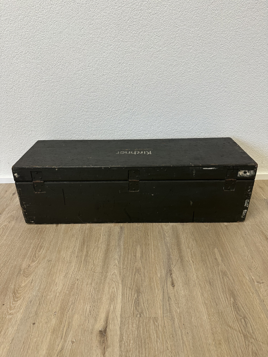 Massives Holz, dunkelgrün gefasst, mit stabilen Metallbeschlägen und seitlichen Tragegriffen. Diese originale Militär- bzw. Waffenkiste wurde für den Transport und die Aufbewahrung von Ausrüstung gefertigt. Der lange, flache Korpus, die robusten Scharniere sowie die innen angebrachten Spannbänder sprechen klar für den militärischen Einsatzbereich. Die Aufschrift „Kirchner“ ist keine Marke, sondern eine frühere Besitzer- oder Zuordnungskennzeichnung, wie sie bei Armeematerial üblich war. Gebrauchsspuren, Abrieb und kleine Abplatzungen gehören zur Geschichte und unterstreichen den authentischen Charakter.