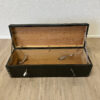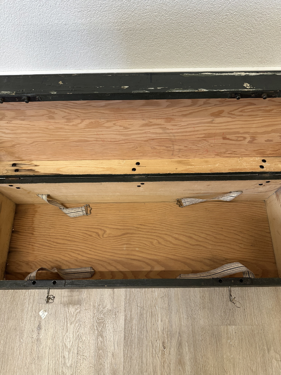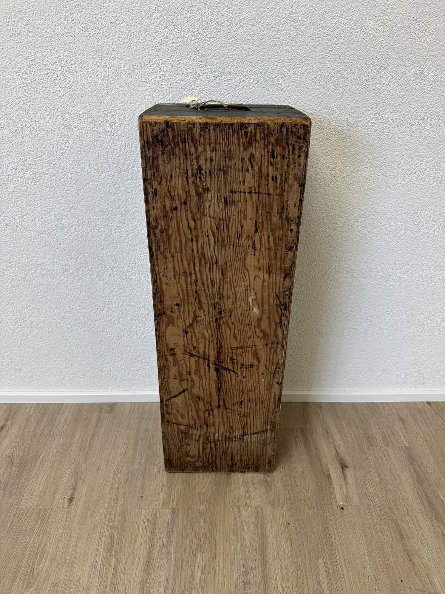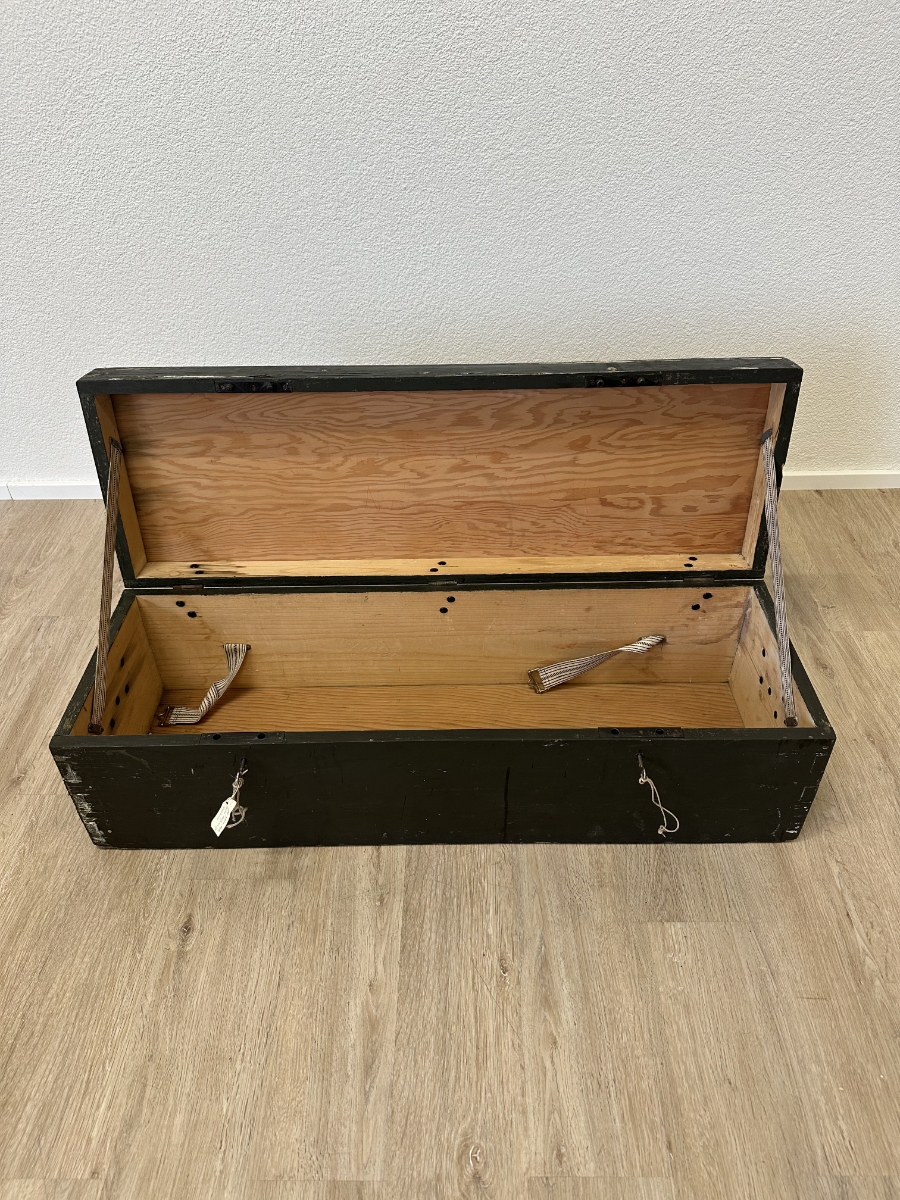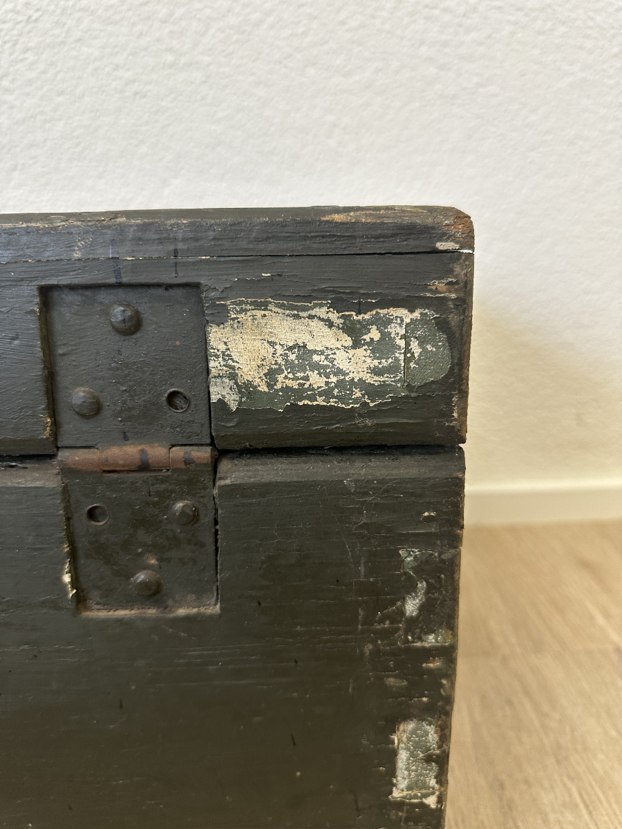 Massives Holz, dunkelgrün gefasst, mit stabilen Metallbeschlägen und seitlichen Tragegriffen. Diese originale Militär- bzw. Waffenkiste wurde für den Transport und die Aufbewahrung von Ausrüstung gefertigt. Der lange, flache Korpus, die robusten Scharniere sowie die innen angebrachten Spannbänder sprechen klar für den militärischen Einsatzbereich. Die Aufschrift „Kirchner“ ist keine Marke, sondern eine frühere Besitzer- oder Zuordnungskennzeichnung, wie sie bei Armeematerial üblich war. Gebrauchsspuren, Abrieb und kleine Abplatzungen gehören zur Geschichte und unterstreichen den authentischen Charakter.