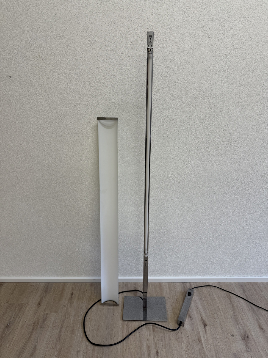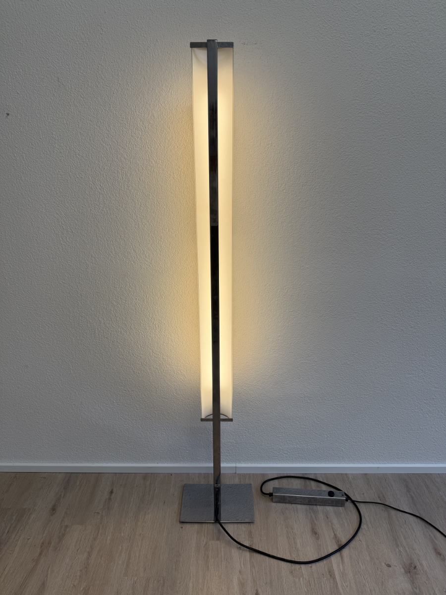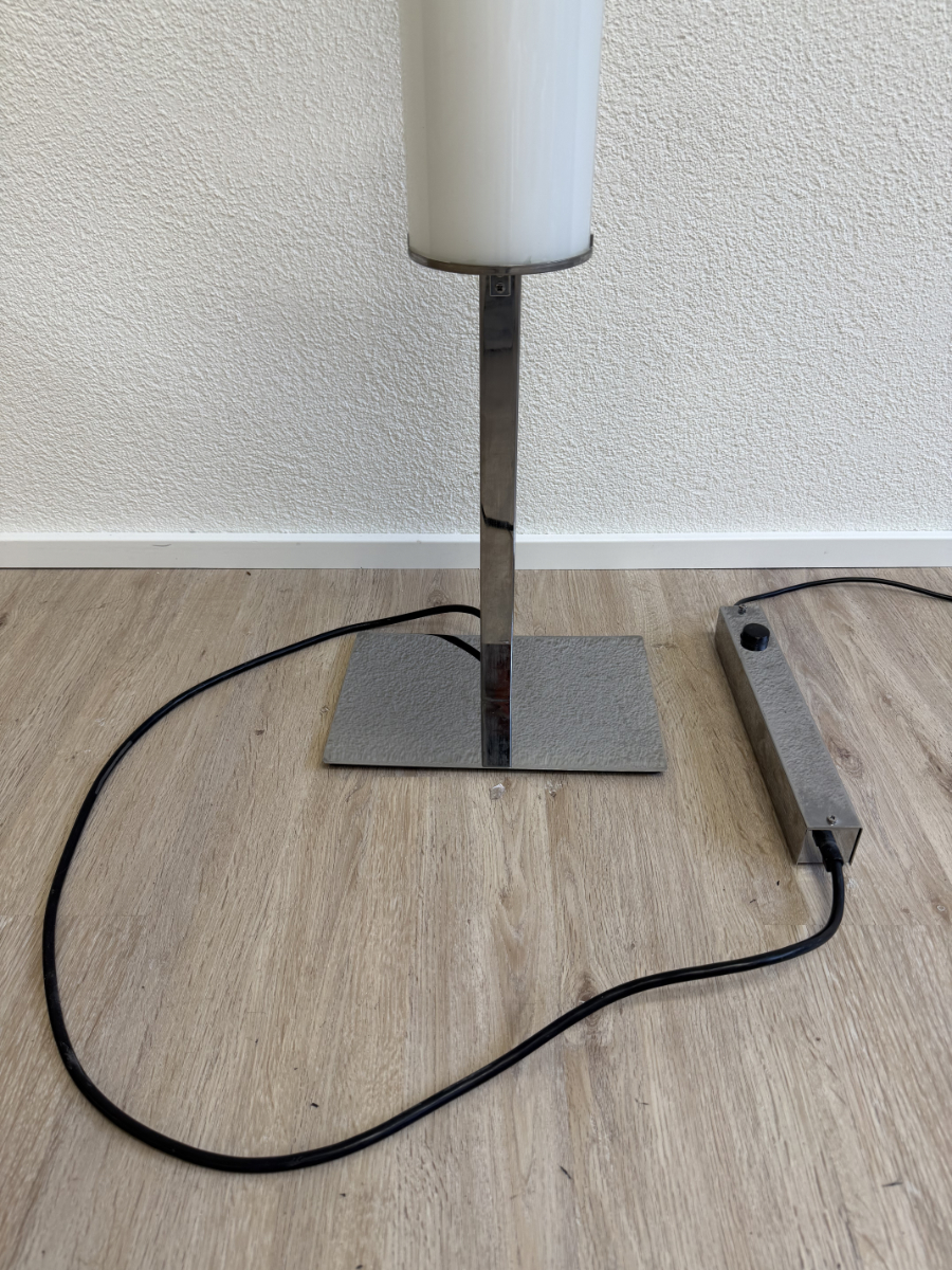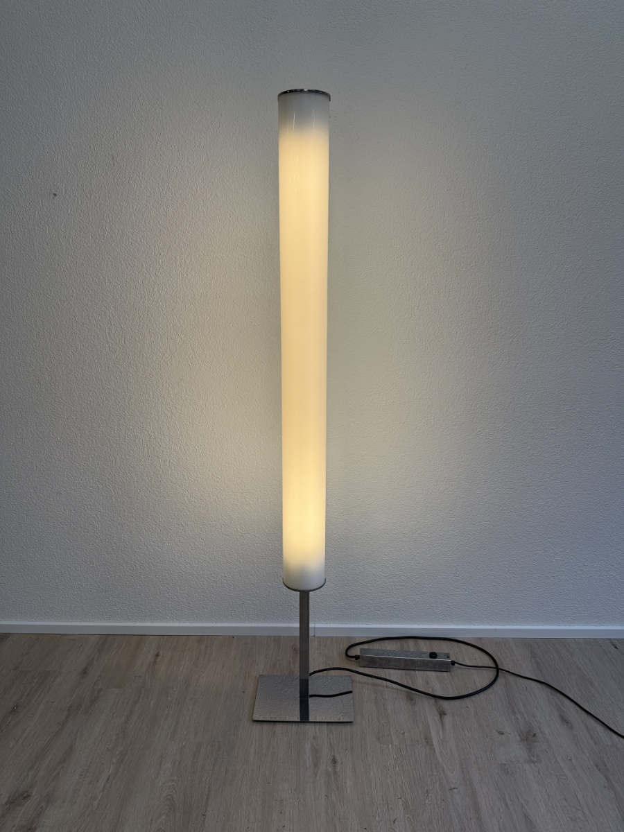 Chromstahl, Opalglas und eine schnörkellos gerade Linie machen diese Stehleuchte zu einem ruhigen Designstück aus den ca. 1990er Jahren. Der hohe Opalglas-Zylinder streut das Licht weich und gleichmässig, ohne zu blenden. Dazu kommt die praktische Dimmerlösung im separaten Metallgehäuse am Kabel, damit du die Helligkeit je nach Stimmung fein regulieren kannst. Der quadratische Fuss sorgt für sicheren Stand und passt optisch perfekt zur klaren Formsprache.