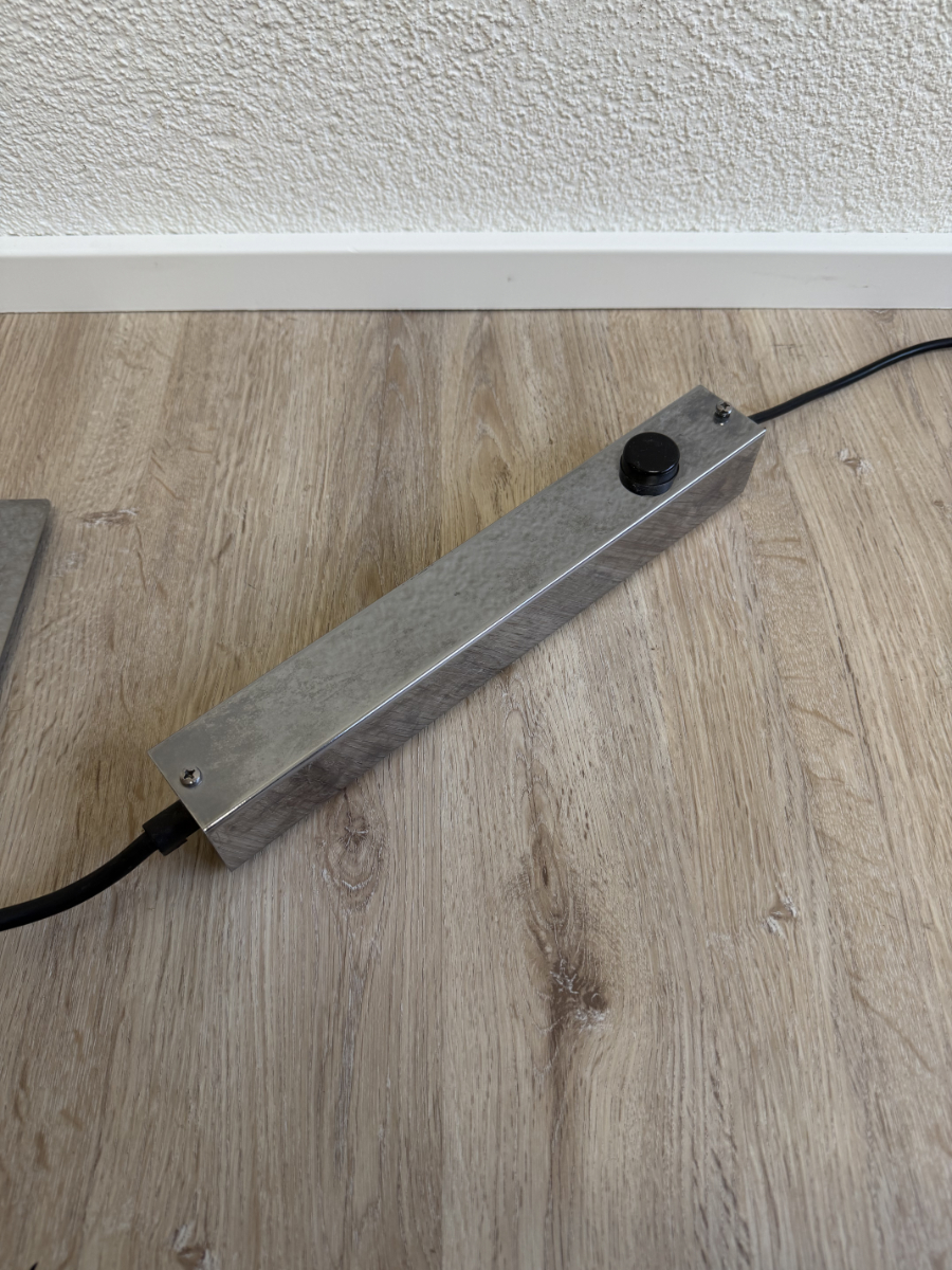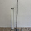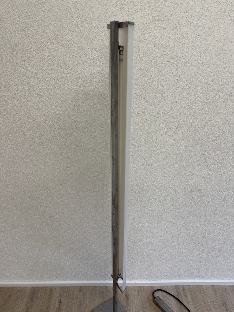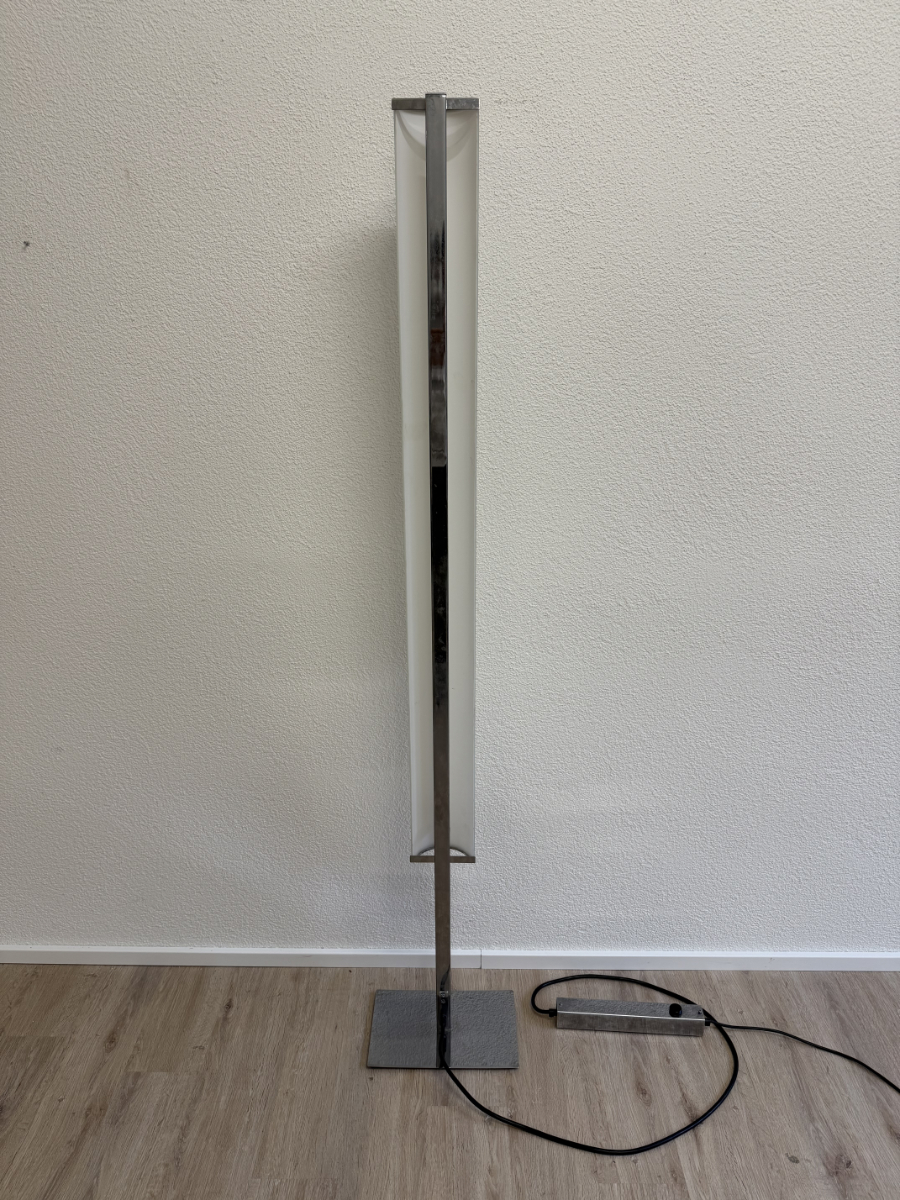 Chromstahl, Opalglas und eine schnörkellos gerade Linie machen diese Stehleuchte zu einem ruhigen Designstück aus den ca. 1990er Jahren. Der hohe Opalglas-Zylinder streut das Licht weich und gleichmässig, ohne zu blenden. Dazu kommt die praktische Dimmerlösung im separaten Metallgehäuse am Kabel, damit du die Helligkeit je nach Stimmung fein regulieren kannst. Der quadratische Fuss sorgt für sicheren Stand und passt optisch perfekt zur klaren Formsprache.