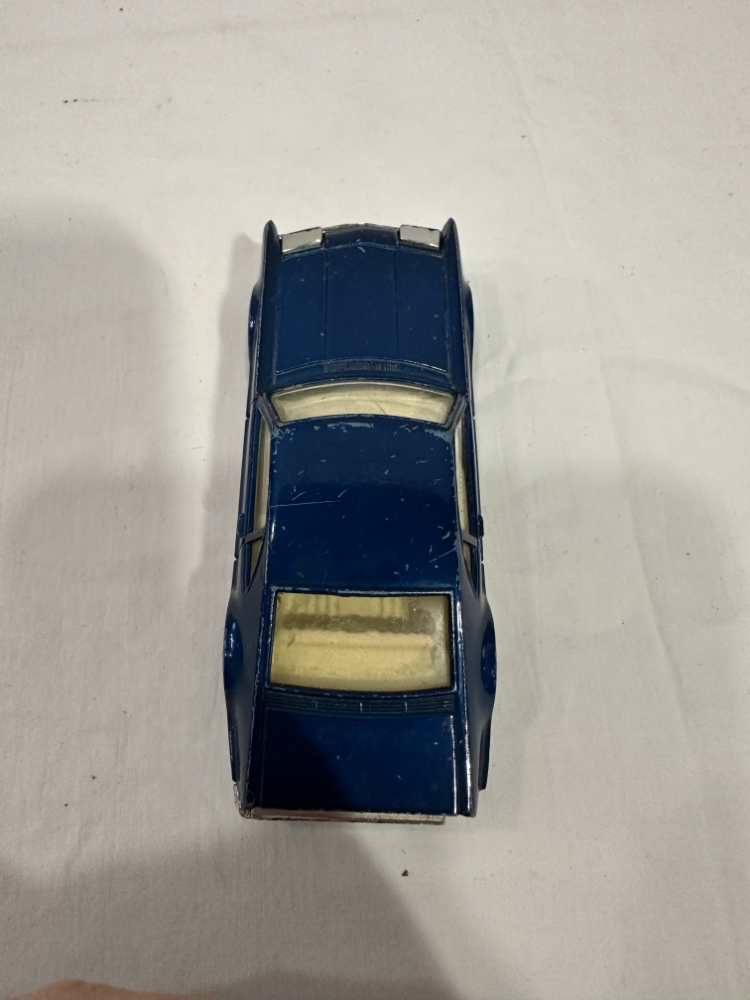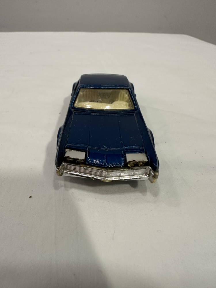 Dieses detailreiche Corgi Toys Modellauto zeigt den legendären Oldsmobile Toronado, ein amerikanisches Coupé mit markanter Linienführung. Das Modell stammt aus den 1960er Jahren und wurde in Grossbritannien gefertigt. Der Karosseriekörper besteht aus stabilem Druckguss Metall, lackiert in sattem Dunkelblau mit silberfarbenen Akzenten.
