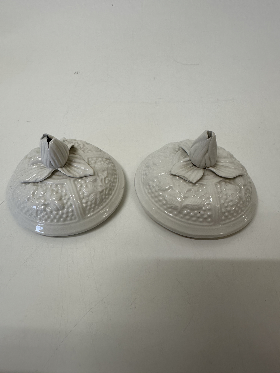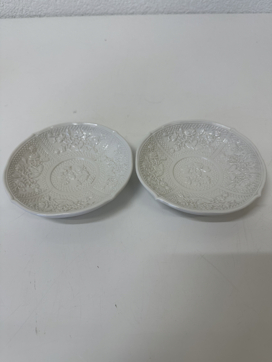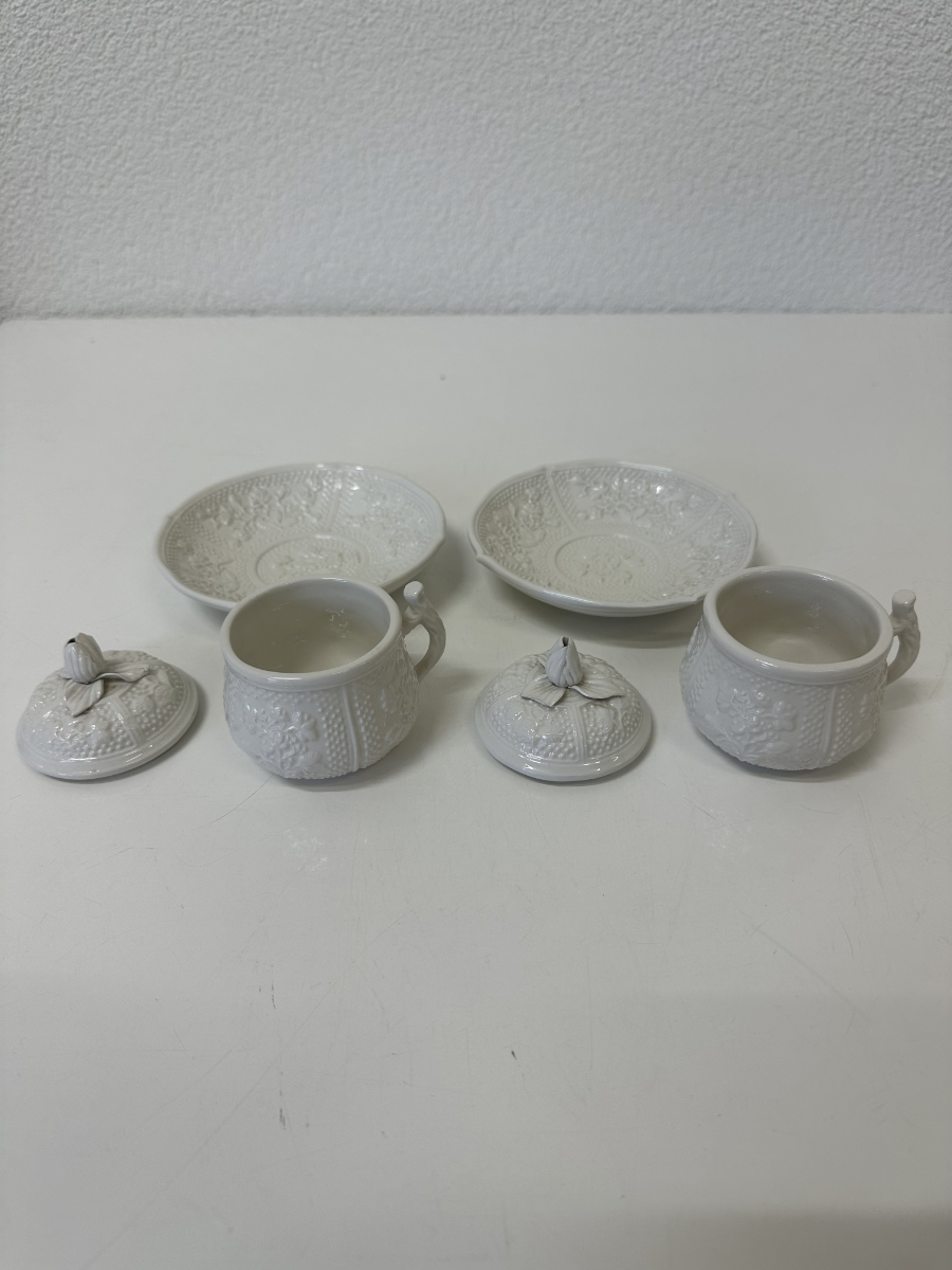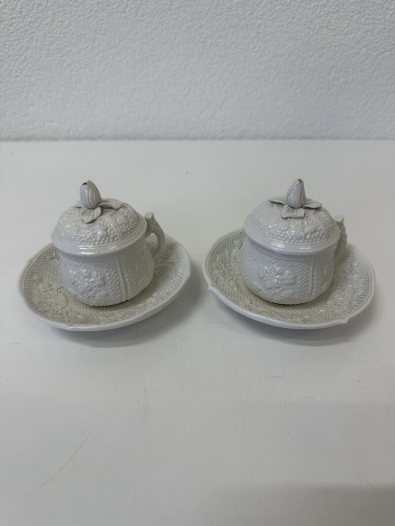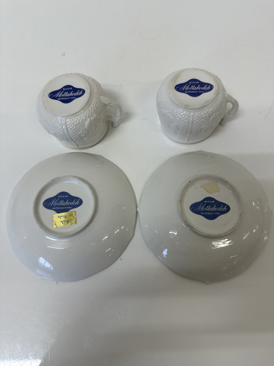 Vintage Mottahedeh Porzellan Tassen mit Untertellern, Reliefdekor, 2er-Set