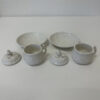 Weisses Porzellan mit feinem Relief, floralem Muster und einer ruhigen, ausgewogenen Form. Die Tassen wirken kompakt und hochwertig, die passenden Unterteller greifen das aufwendig gearbeitete Dekor auf. Hergestellt als Reproduktion historischer Vorbilder von Mottahedeh, bekannt für museumstaugliche Qualität und klassische Formen.