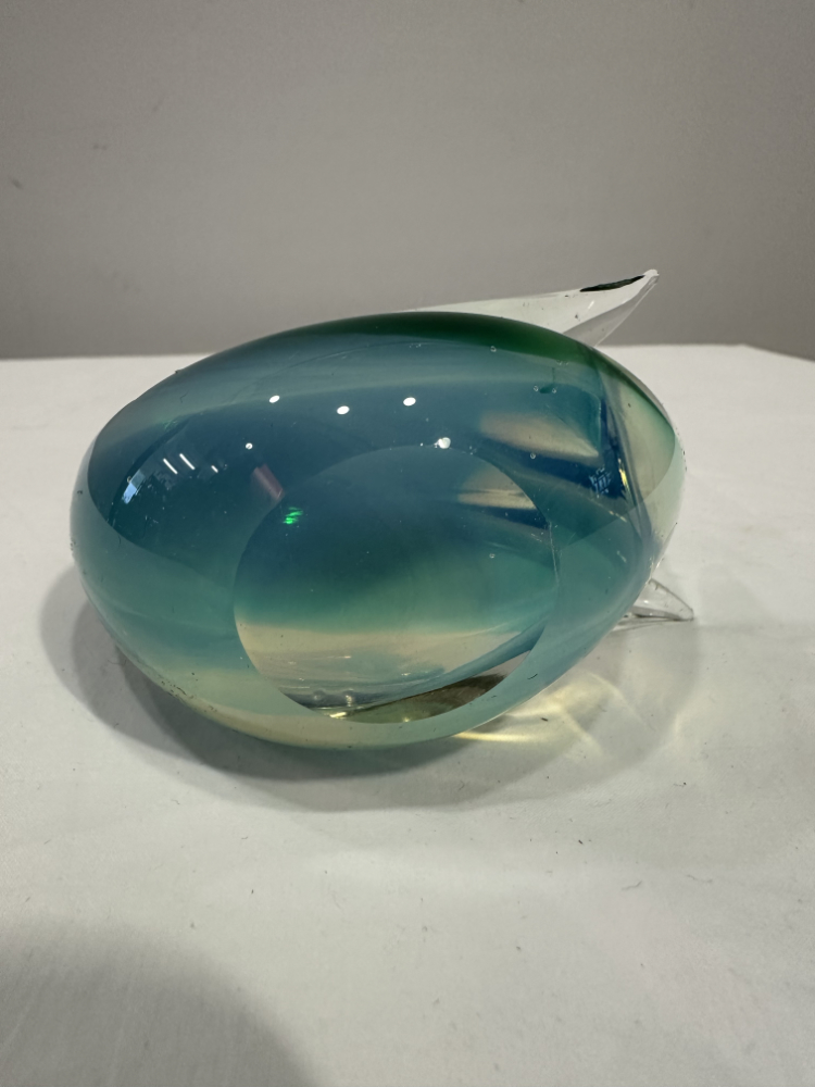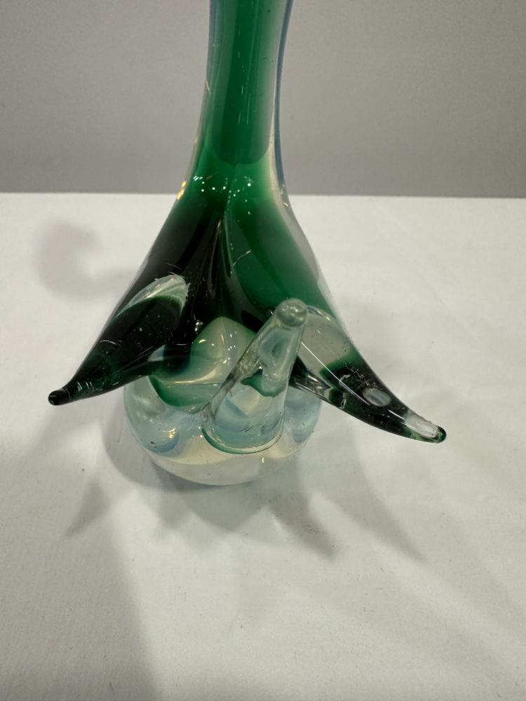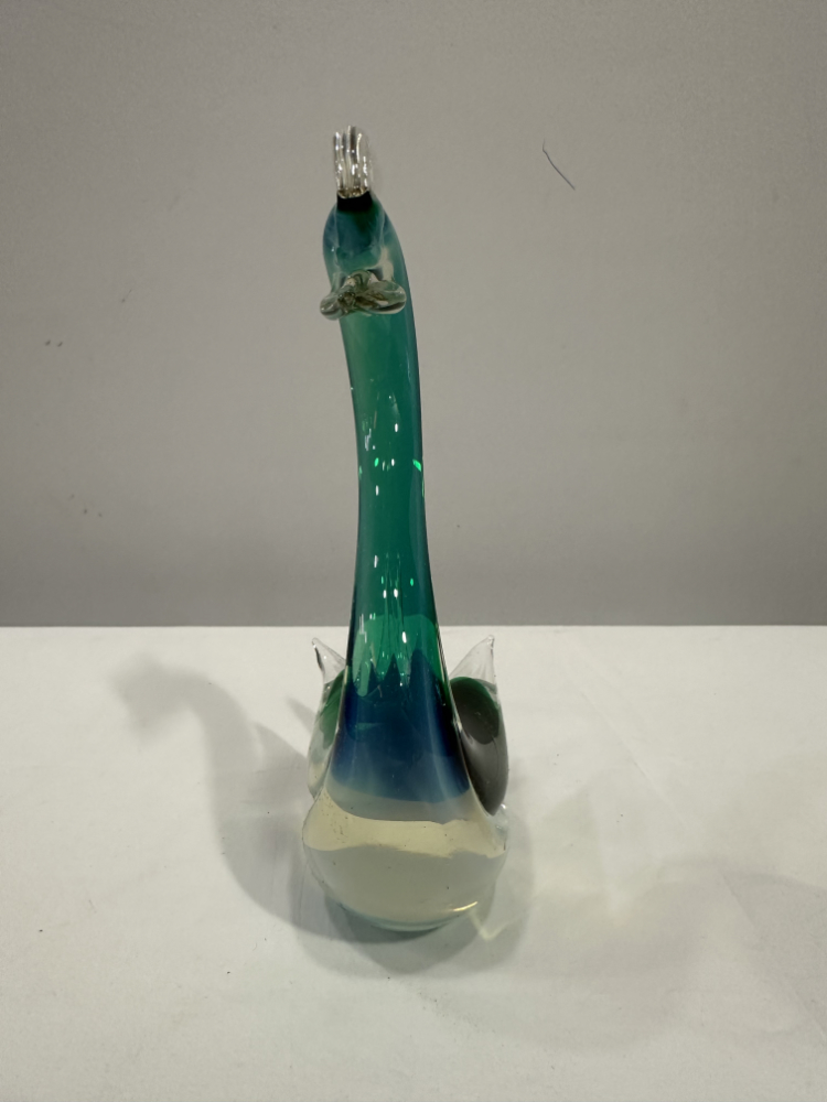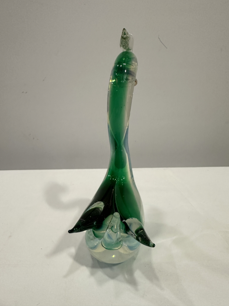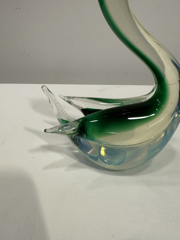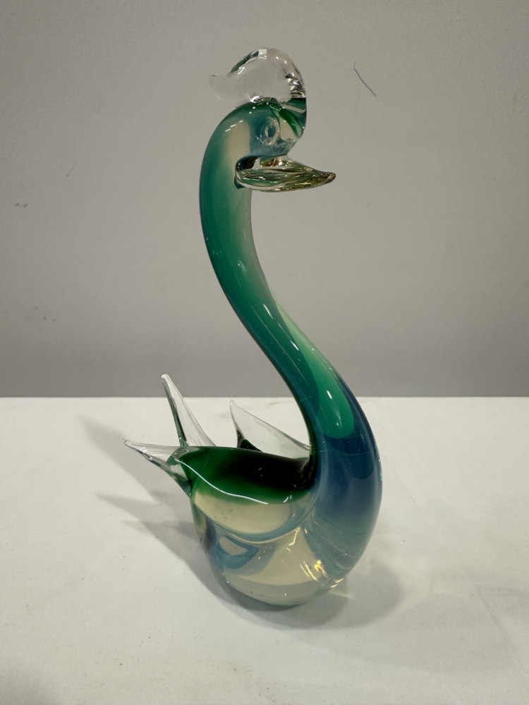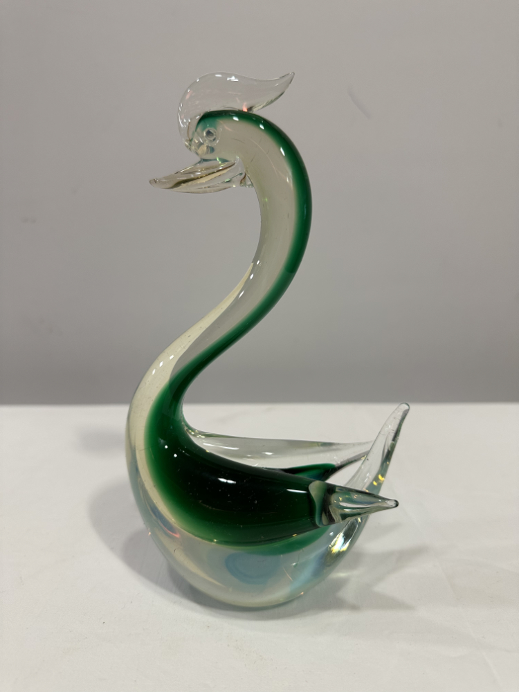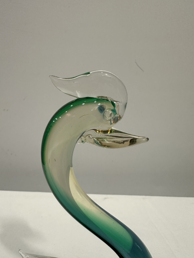 Diese kunstvoll handgefertigte Glasfigur aus der Glashütte Murano zeigt einen anmutigen Schwan in elegant geschwungener Form. Das mundgeblasene Glas schimmert in feinen Abstufungen von Smaragdgrün bis Türkis, die harmonisch ins Klare übergehen. Der lange, geschwungene Hals und die fein ausgearbeiteten Flügelspitzen verleihen der Figur eine grazile, beinahe schwebende Erscheinung, ein klassisches Beispiel italienischer Glaskunst aus den 1960er Jahren.