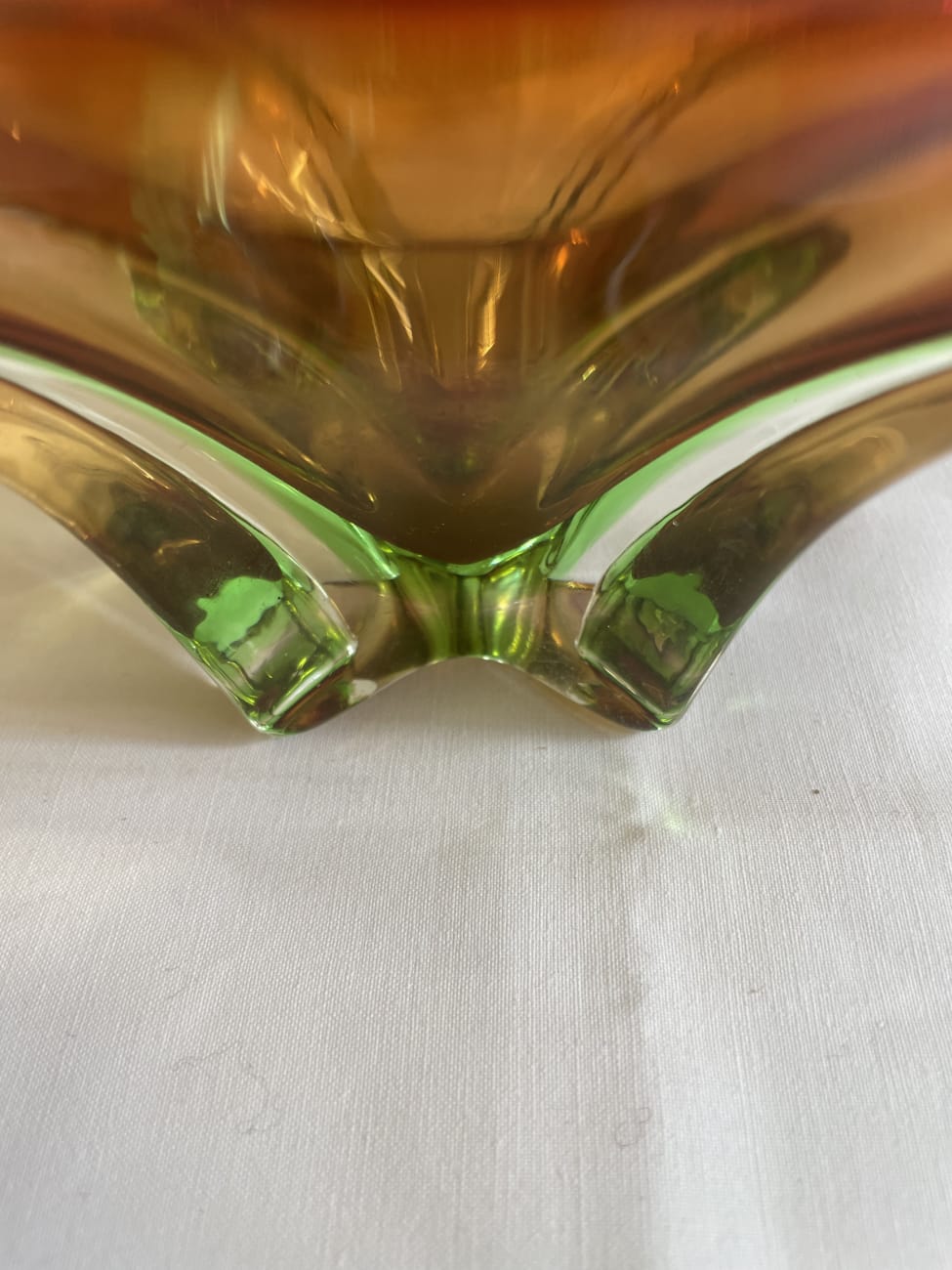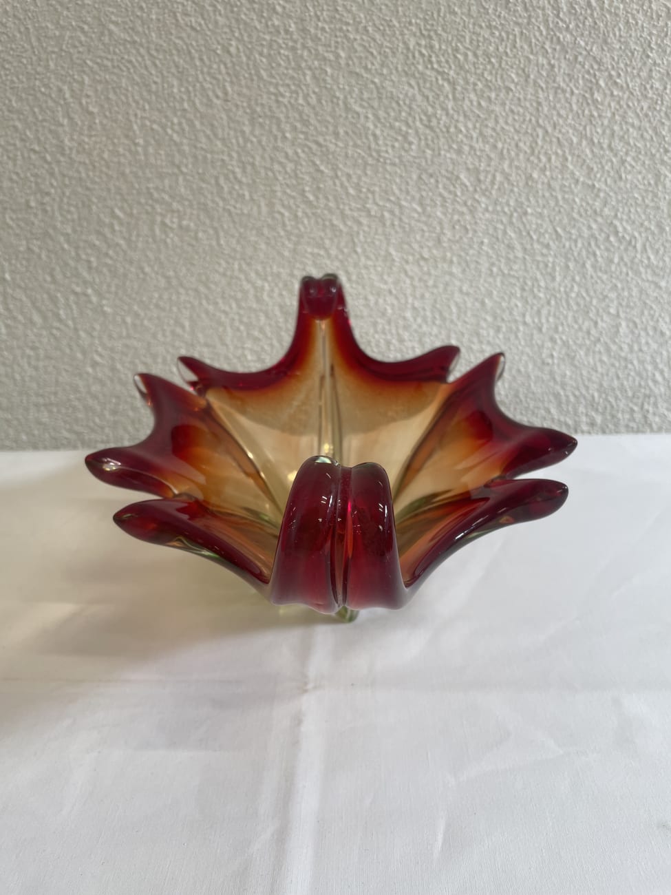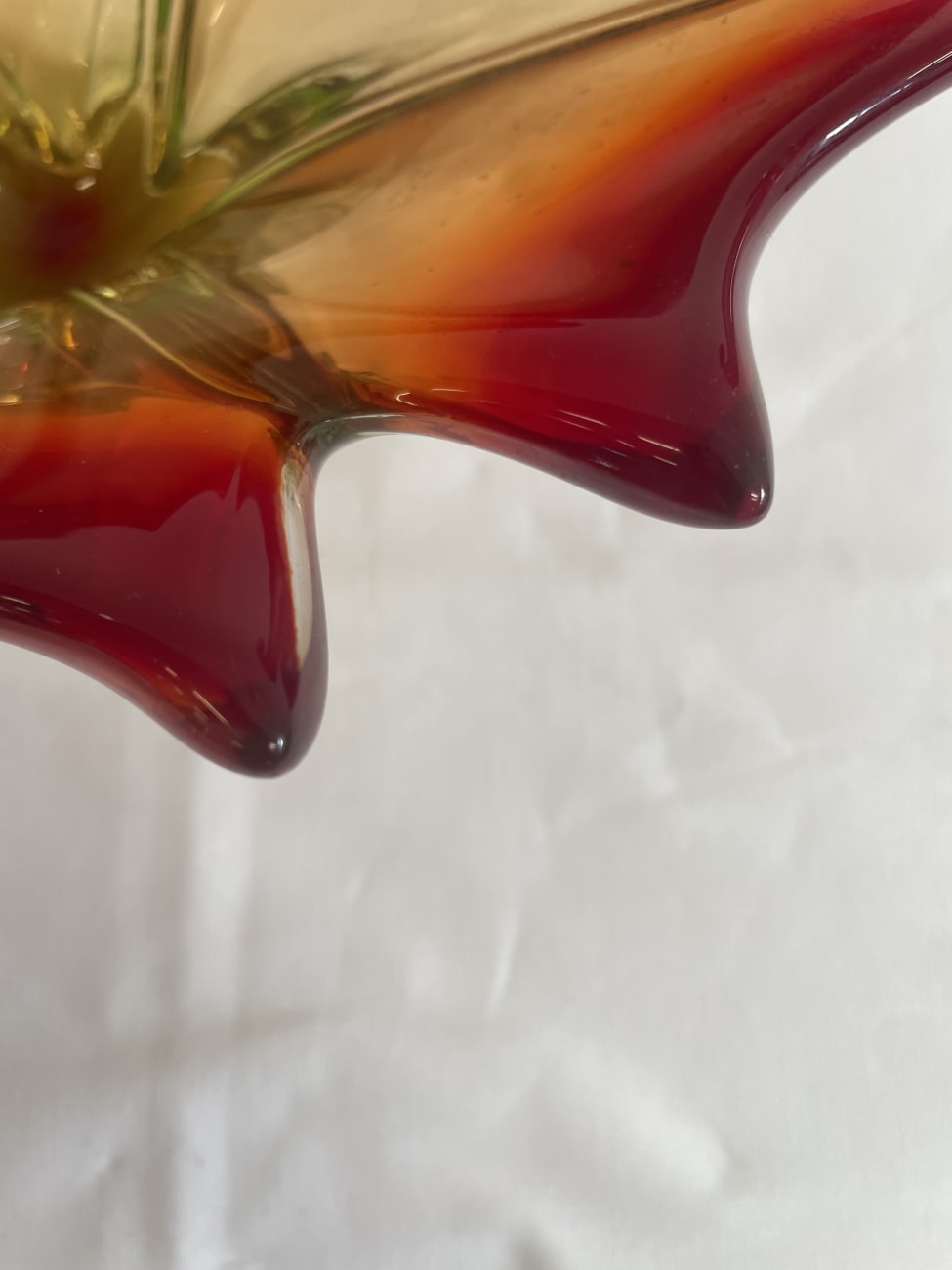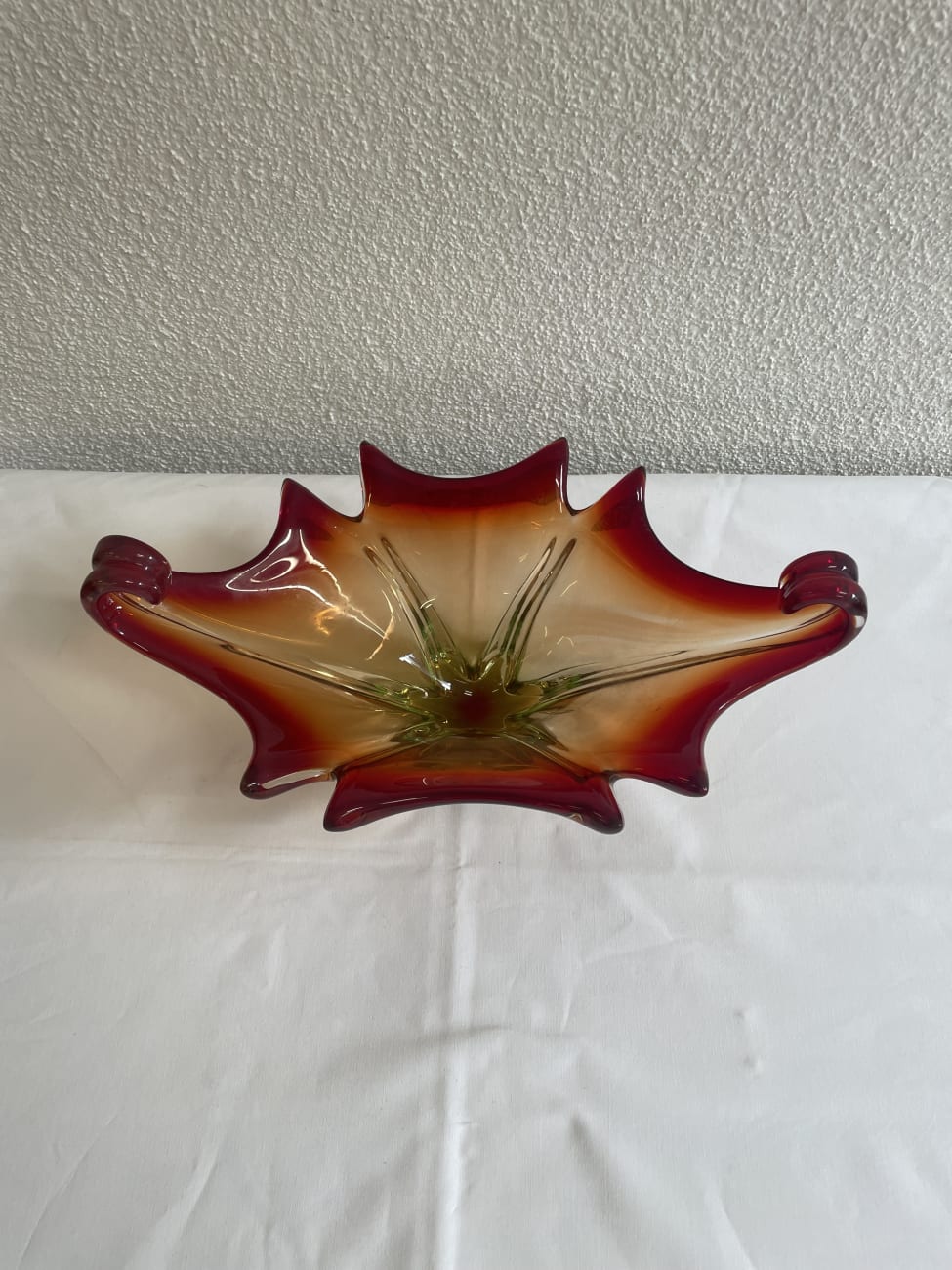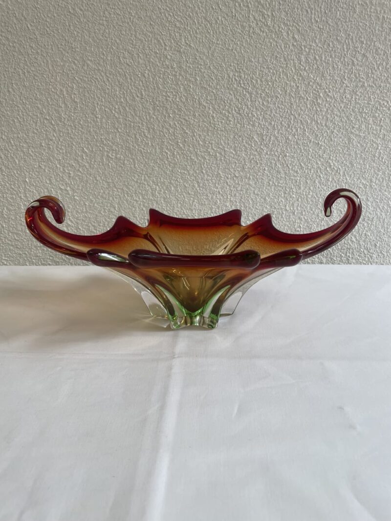 Kräftiger Farbverlauf von warmem Amber über tiefes Rubinrot bis zu leicht grünlichem Glas im Sockel prägt diese auffällige Glasschale. Form und Verarbeitung lassen klar eine Vintage Murano-Stilrichtung aus Italien aus den 1960er bis 1970er Jahren erkennen. Typisch sind die frei geformten Wellenkanten, die eingerollten Enden an beiden Seiten sowie der sternförmig ausgearbeitete Boden. Das Glas wirkt schwer und massiv gearbeitet und zeigt im Licht einen lebendigen Farbverlauf, der je nach Blickwinkel unterschiedlich leuchtet. Als dekorative Schale, Obstschale oder Mittelpunkt auf einem Tisch entfaltet dieses Glasstück eine starke Wirkung.