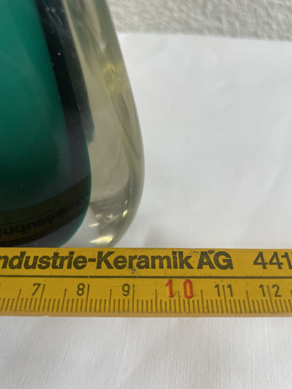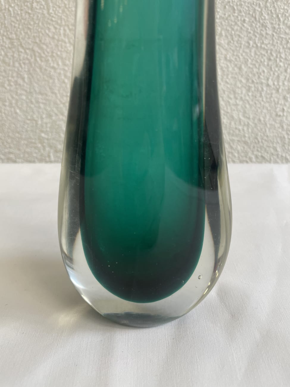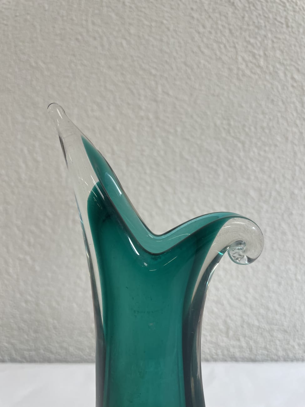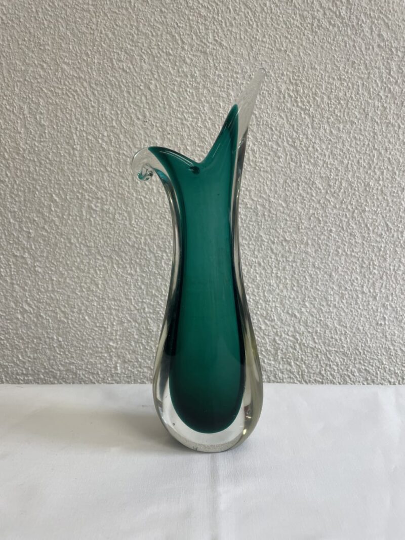 Sattes Smaragdgrün liegt im Inneren dieser kunstvoll geformten Glasvase und wird von klarem Glas umschlossen. Typisch für den Murano Stil ist die sogenannte Sommerso Technik, bei der farbiges Glas in eine transparente Schicht eingebettet wird und so eine besondere Tiefe entsteht. Die langgezogene, elegante Form läuft oben in eine geschwungene Öffnung aus und erinnert an organische Linien der Glasdesigns aus den 1960er und 1970er Jahren. Dickwandiges Glas sorgt für Gewicht und eine hochwertige Ausstrahlung. Als Einzelstück wirkt sie auf Sideboards, Tischen oder in Vitrinen besonders dekorativ.