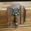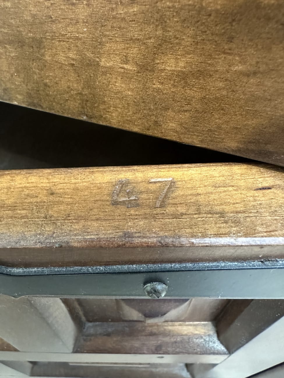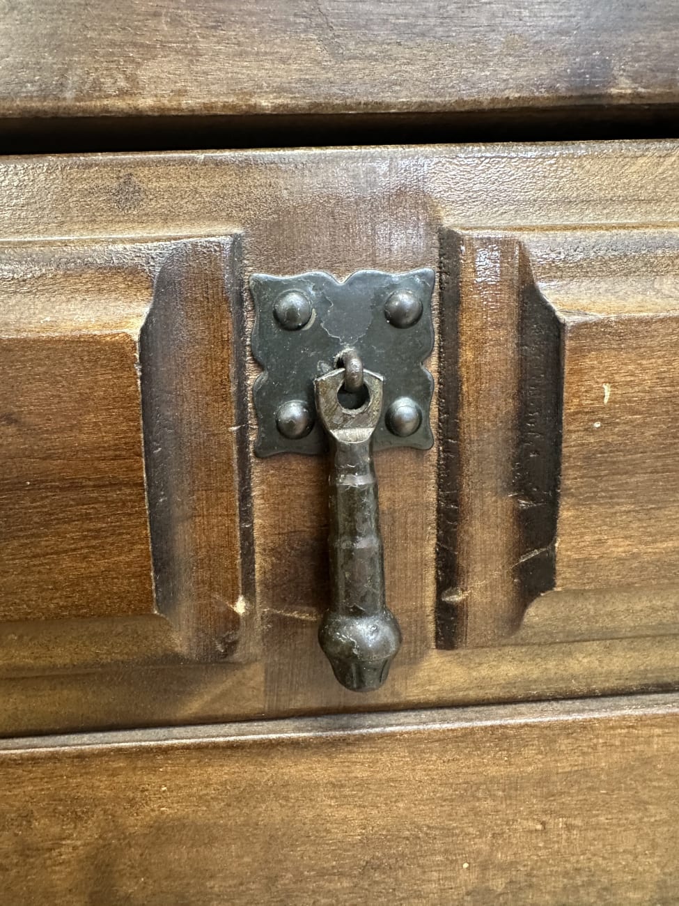 Dunkel gebeiztes Holz mit lebendiger Maserung und kräftiger Ausstrahlung. Die Front zeigt kassettenartige Felder, kombiniert mit auffälligen Metallbeschlägen und einem typischen Riegelverschluss. Der spanische Hacienda Stil wirkt rustikal, schlicht und solide gebaut. Die kompakte Form passt gut neben das Bett oder auch in kleinere Räume. Oben eine Schublade für Kleinteile, darunter ein geschlossenes Fach für mehr Stauraum. Die Bauweise ist stabil und wirkt langlebig, nichts wirkt leicht oder dünn. Ein Möbel, das durch Material und Stil auffällt und nicht austauschbar ist.