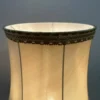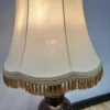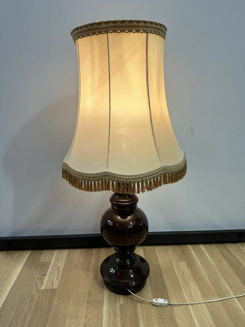 Vintage Nachttischlampe / Wohnzimmerlampe befindet sich in einem guten bis sehr guten Zustand. Diese wunderschöne Wohnzimmerleuchte verfügt über einen beeindruckend großen Lampenschirm mit vielen eleganten braunen Fäden, die herunterhängen. Die Lampe ist komplett mit einem prächtigen Keramiksockel ausgestattet. Sie eignet sich sowohl hervorragend als große Nachttischlampe als auch als charmante Wohnzimmerlampe.