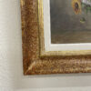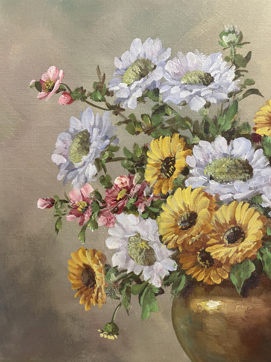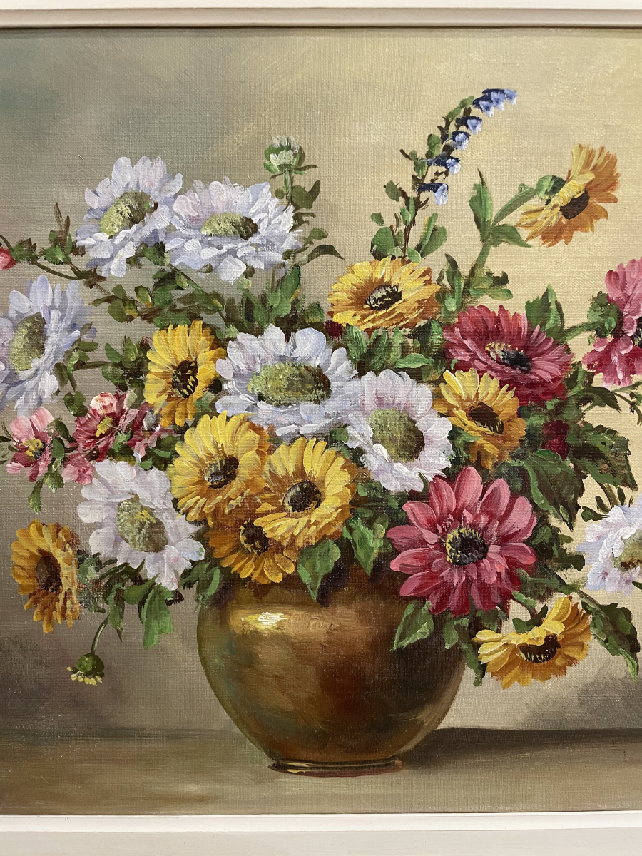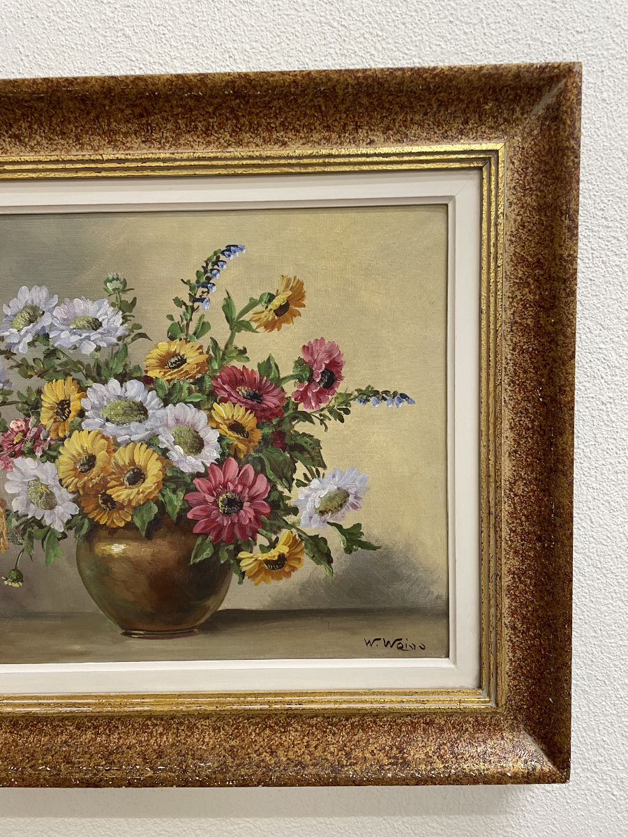 Kräftige Blüten in Gelb, Weiss und Rot treffen auf feine Blauakzente und sattes Grün. Der Blumenstrauss steht in einer rundlichen Vase vor einem weich verlaufenden, warmen Hintergrund. Der Pinselauftrag ist deutlich sichtbar und sorgt für Tiefe und Lebendigkeit. Unten rechts signiert mit W. Weiss. Das Gemälde ist in einen breiten Holzrahmen eingesetzt, dessen strukturierte Oberfläche und goldfarbene Kanten dem Motiv Ruhe und Gewicht geben.
