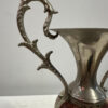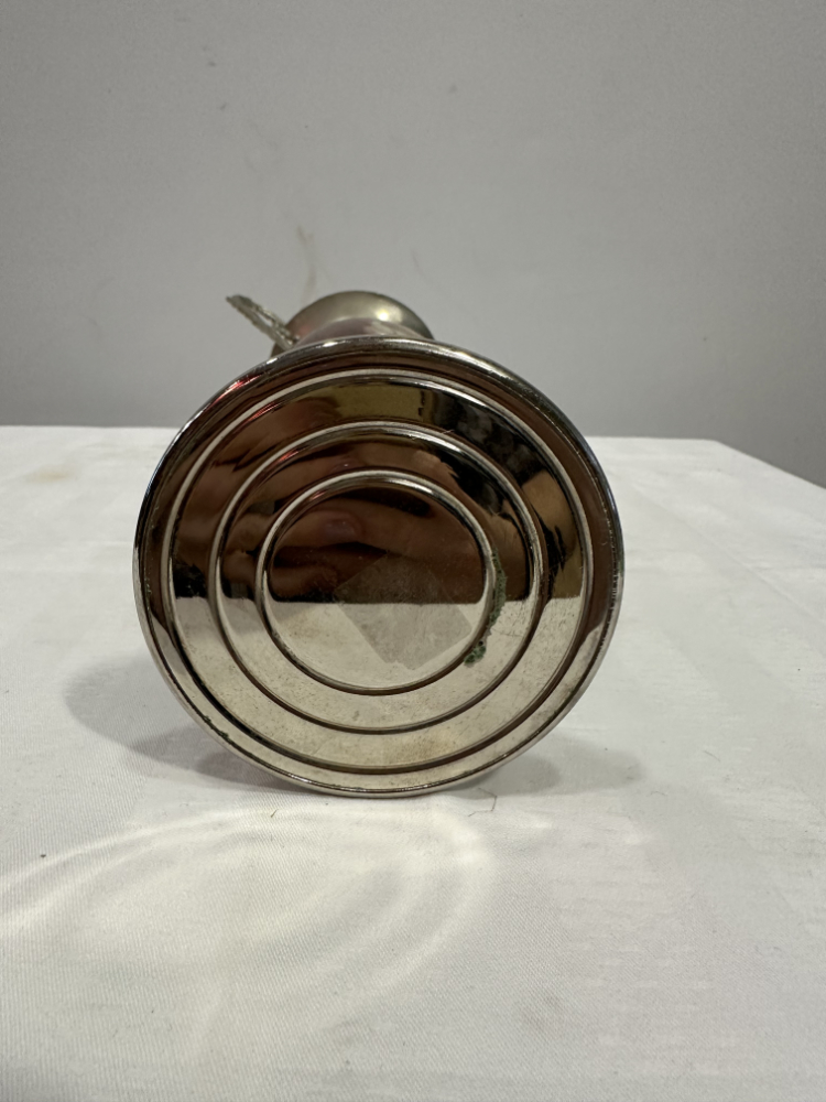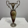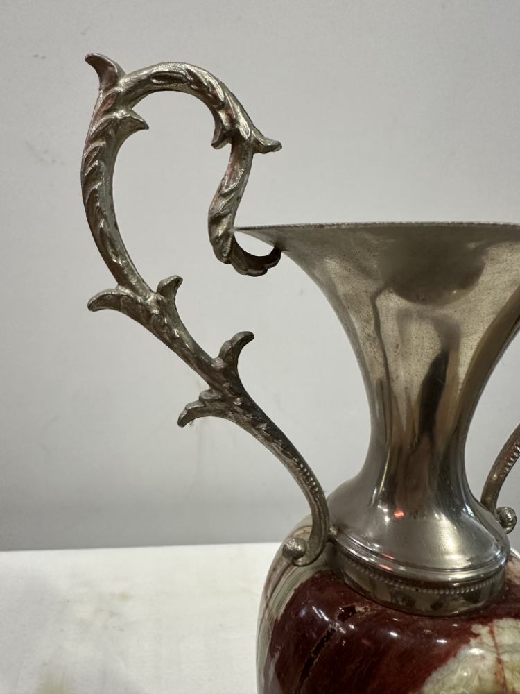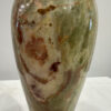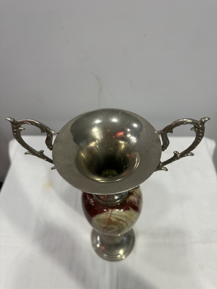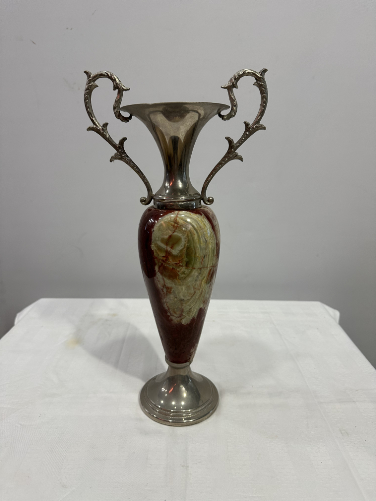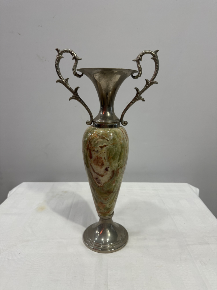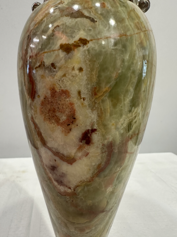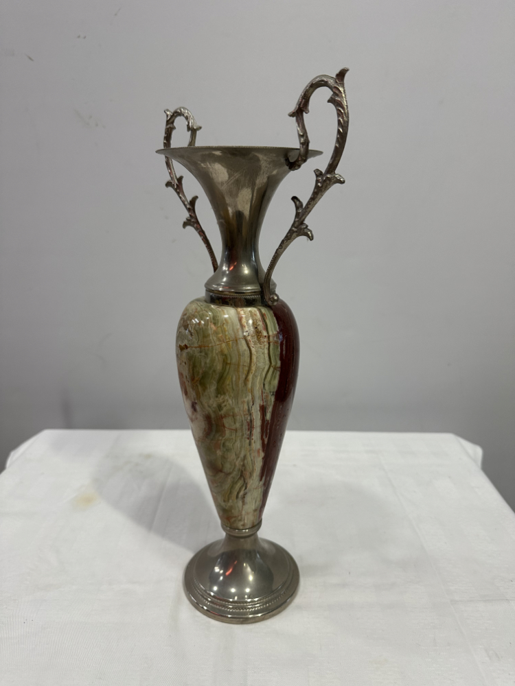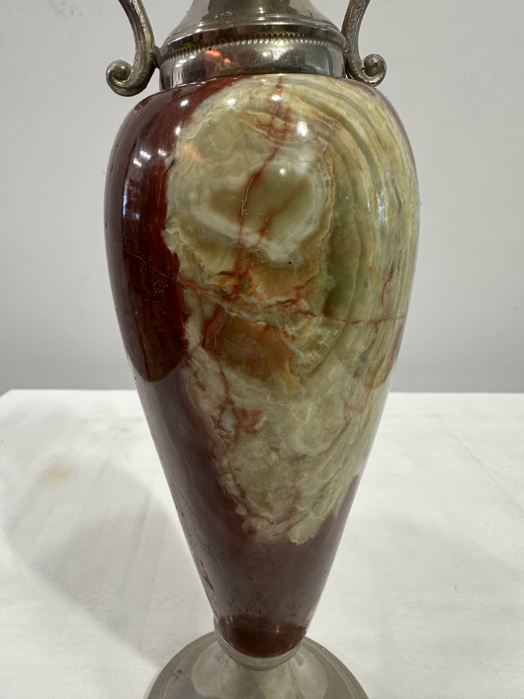 Ein echtes Schmuckstück aus vergangenen Zeiten: Dieser elegante Vintage Kerzenhalter besteht aus massivem Onyxstein mit natürlich gemaserter Oberfläche in Grün-, Creme- und Rotbrauntönen. Der schlanke, kelchförmige Aufbau wird von kunstvoll geschwungenen Griffen aus silberfarbenem Metall eingerahmt, detailreich gearbeitet und mit feiner Patina, die den nostalgischen Charakter unterstreicht. Der obere Trichter ist ideal für Stabkerzen geeignet. Ein dekoratives Einzelstück mit edler Ausstrahlung für Tisch, Kaminsims oder Anrichte.