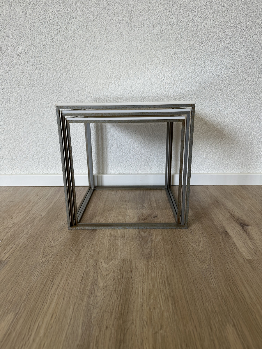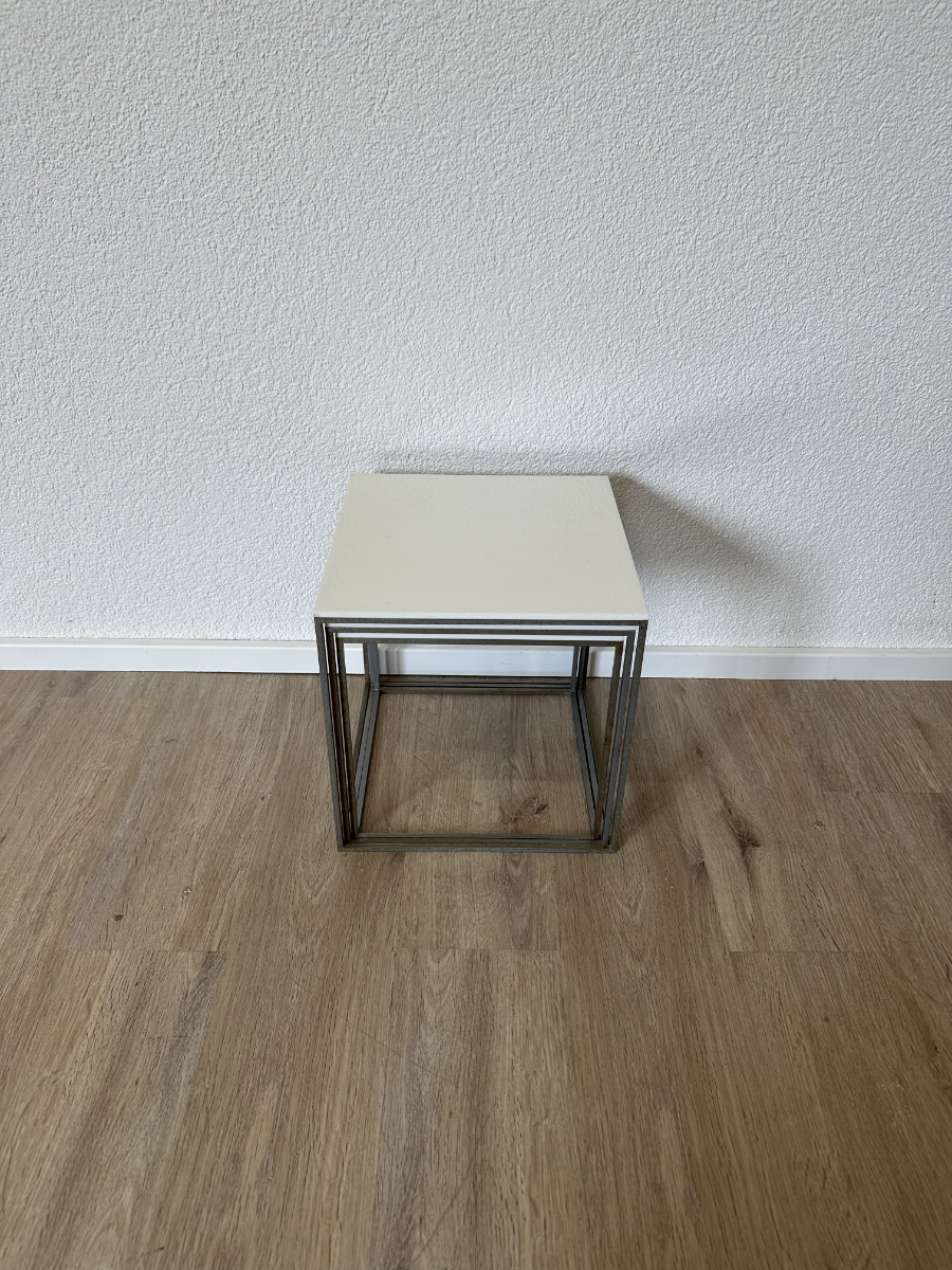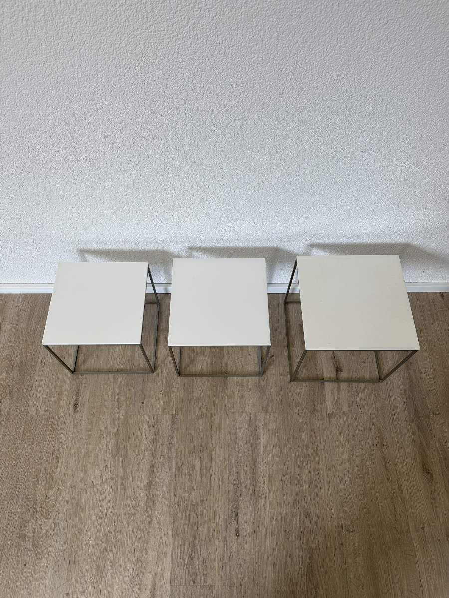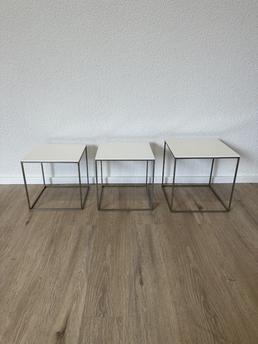 Drei kubische Beistelltische, die sich wie ein Baukastensystem ineinander schieben lassen. Das PK71 Set von Poul Kjaerholm gilt als Designklassiker aus dem skandinavischen Modernismus und wirkt trotz seiner klaren Geometrie leicht und elegant. Weisse Acrylplatten oben, ein schlanker Metallrahmen unten, genau die Mischung aus Funktion und puristischem Design, die in Wohnzimmer, Büro oder Atelier sofort passt.