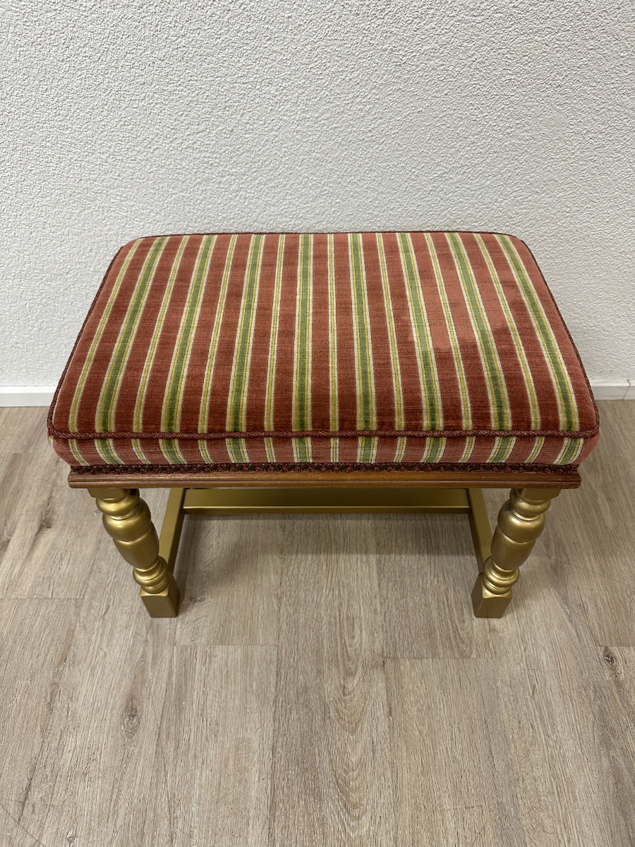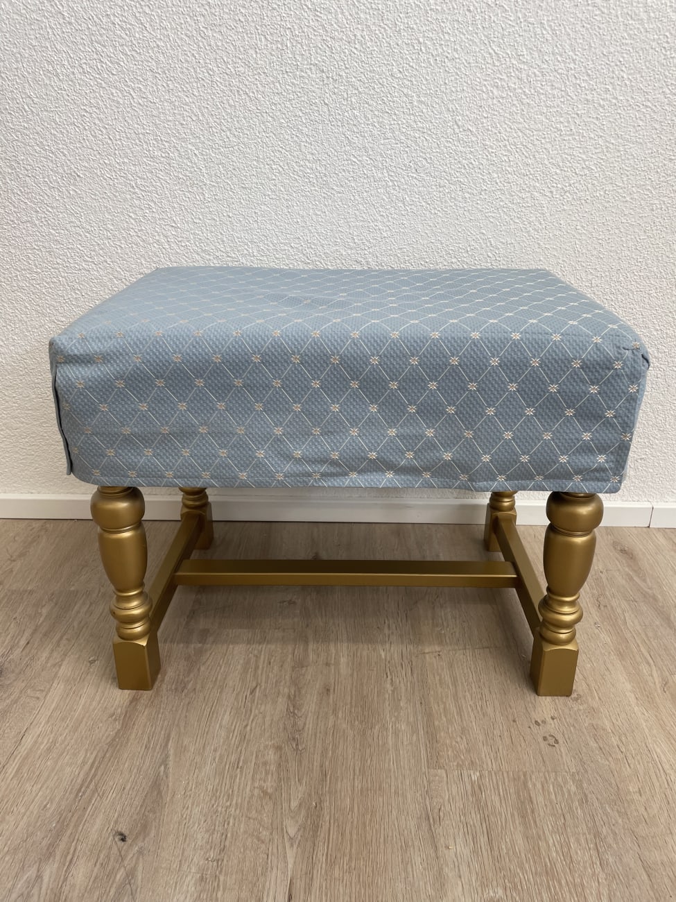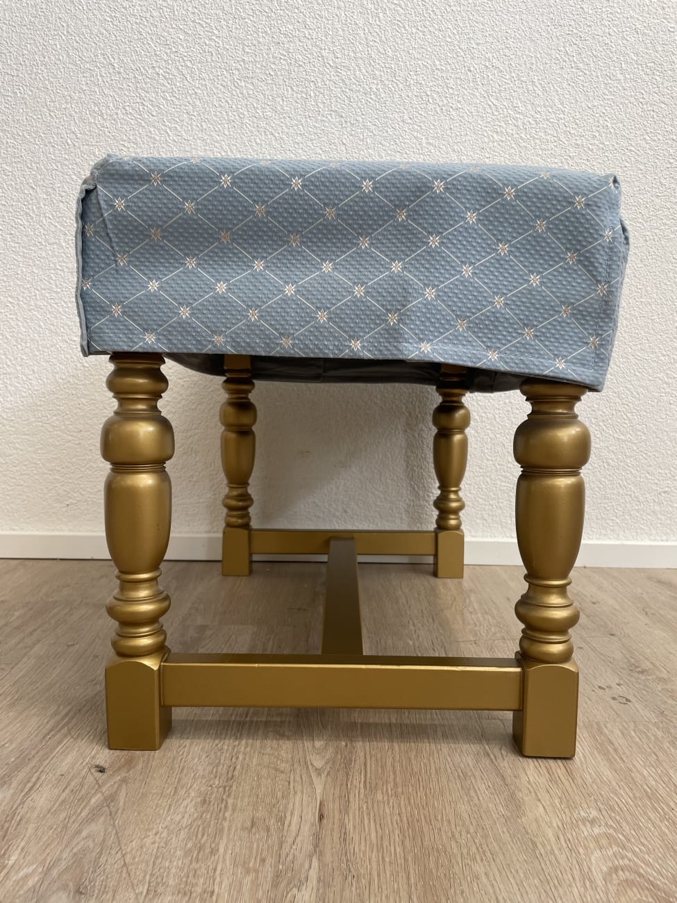 Stabiles Holzgestell mit auffälligen, gedrechselten Beinen in goldfarbener Ausführung. Die Sitzfläche ist gepolstert und mit einem Stoffbezug versehen, der sich abnehmen lässt. Das Muster bringt etwas Leben ins Möbel, ohne aufdringlich zu wirken. Kompakt gebaut und vielseitig nutzbar im Alltag.