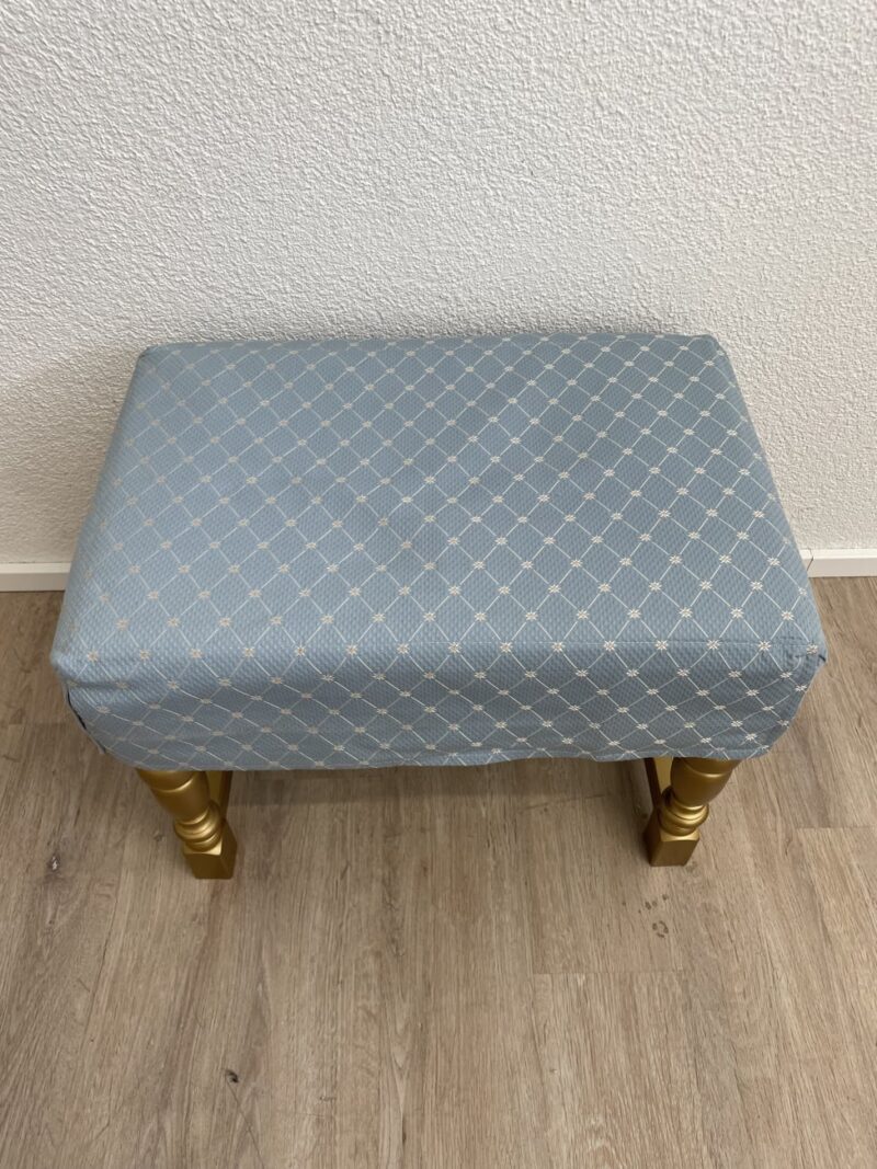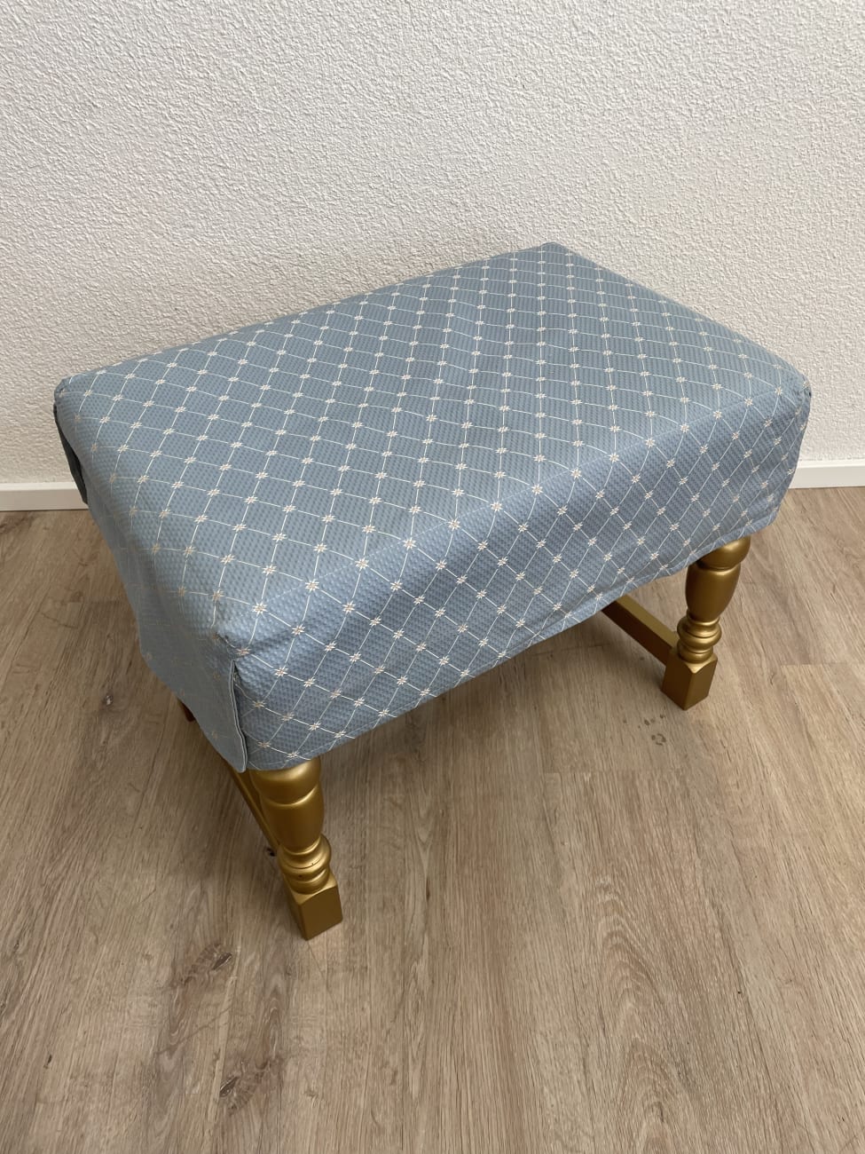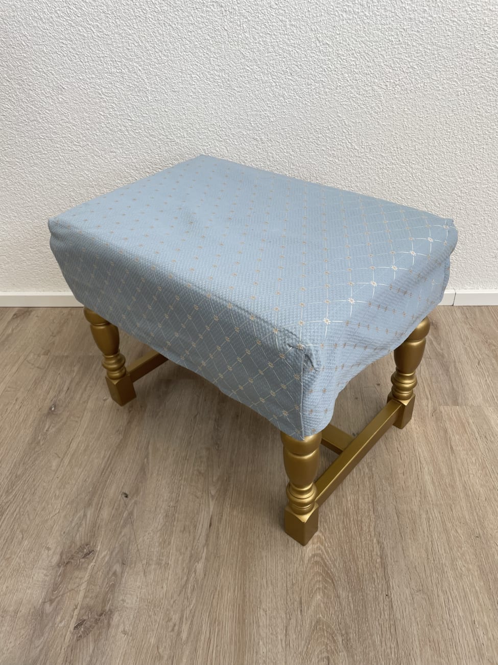 Stabiles Holzgestell mit auffälligen, gedrechselten Beinen in goldfarbener Ausführung. Die Sitzfläche ist gepolstert und mit einem Stoffbezug versehen, der sich abnehmen lässt. Das Muster bringt etwas Leben ins Möbel, ohne aufdringlich zu wirken. Kompakt gebaut und vielseitig nutzbar im Alltag.