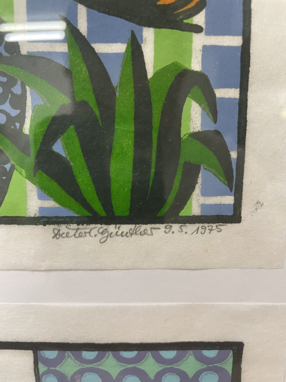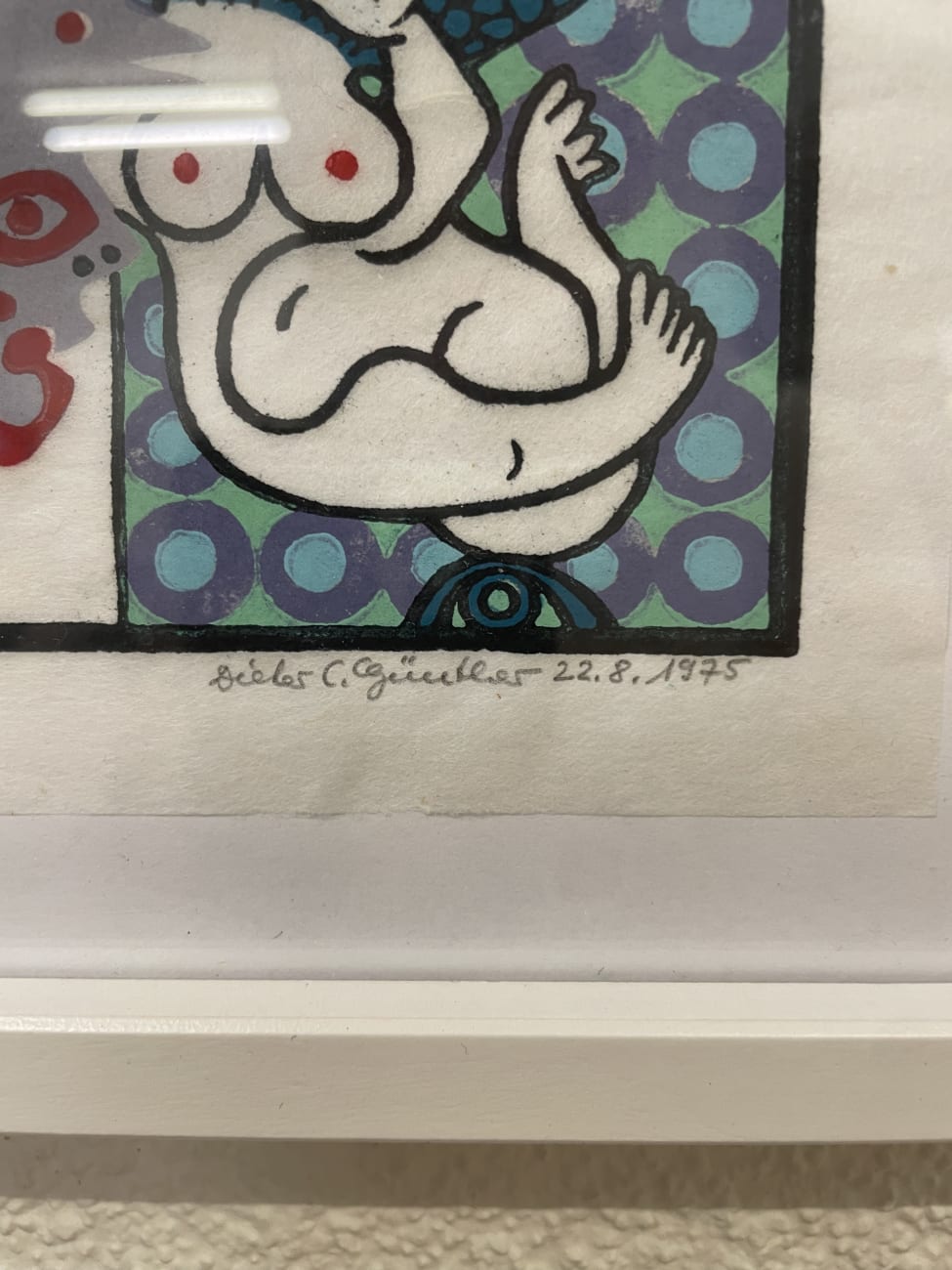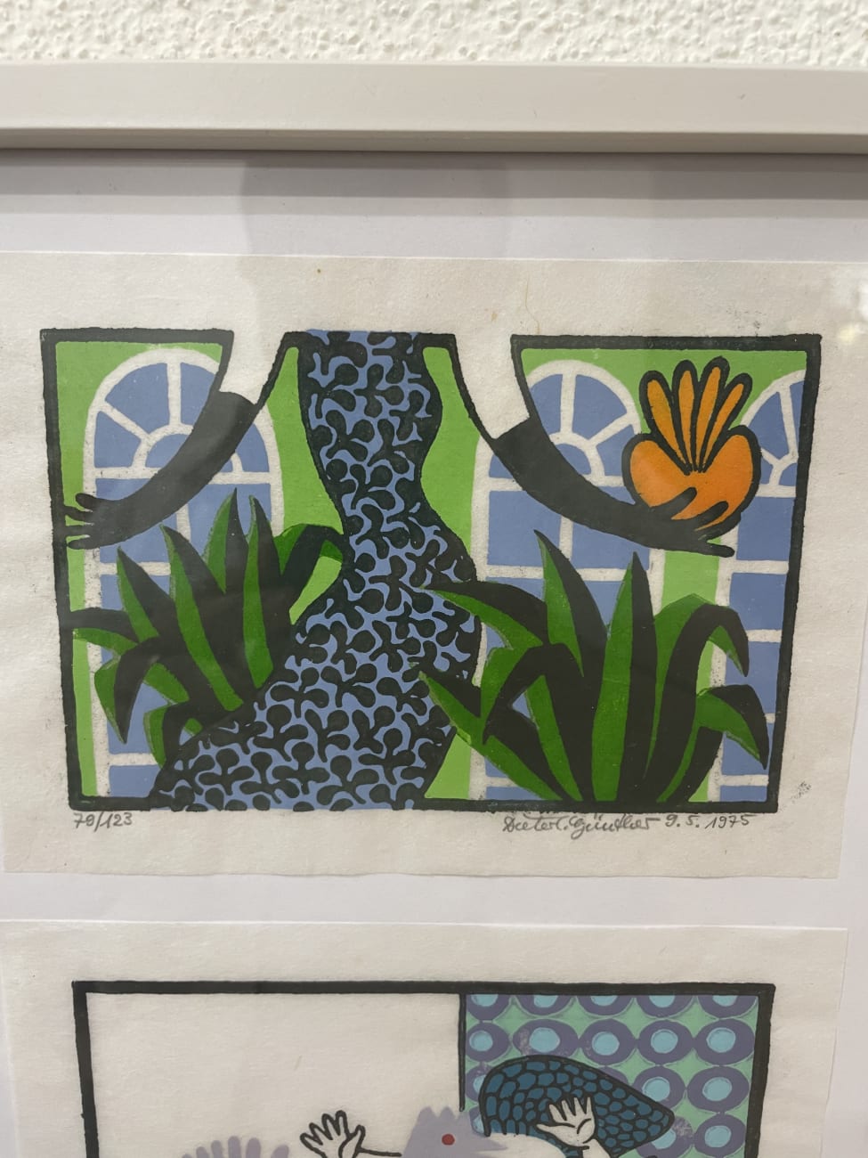 Zwei farbintensive Drucke aus dem Jahr 1975, signiert „Dieter C. Günther“. Klare schwarze Konturen treffen auf kräftige Grün-, Blau- und Orangetöne. Oben eine stilisierte Szene mit Pflanzen, Fensterbögen und abstrahierter Figur, unten eine verspielte, fast provokante Darstellung mit humorvollem Charakter. Beide Blätter sind nummeriert und zeigen typische Merkmale der Pop Art der 1970er Jahre. Zusammen im Rahmen wirken sie lebendig und ziehen sofort den Blick an.